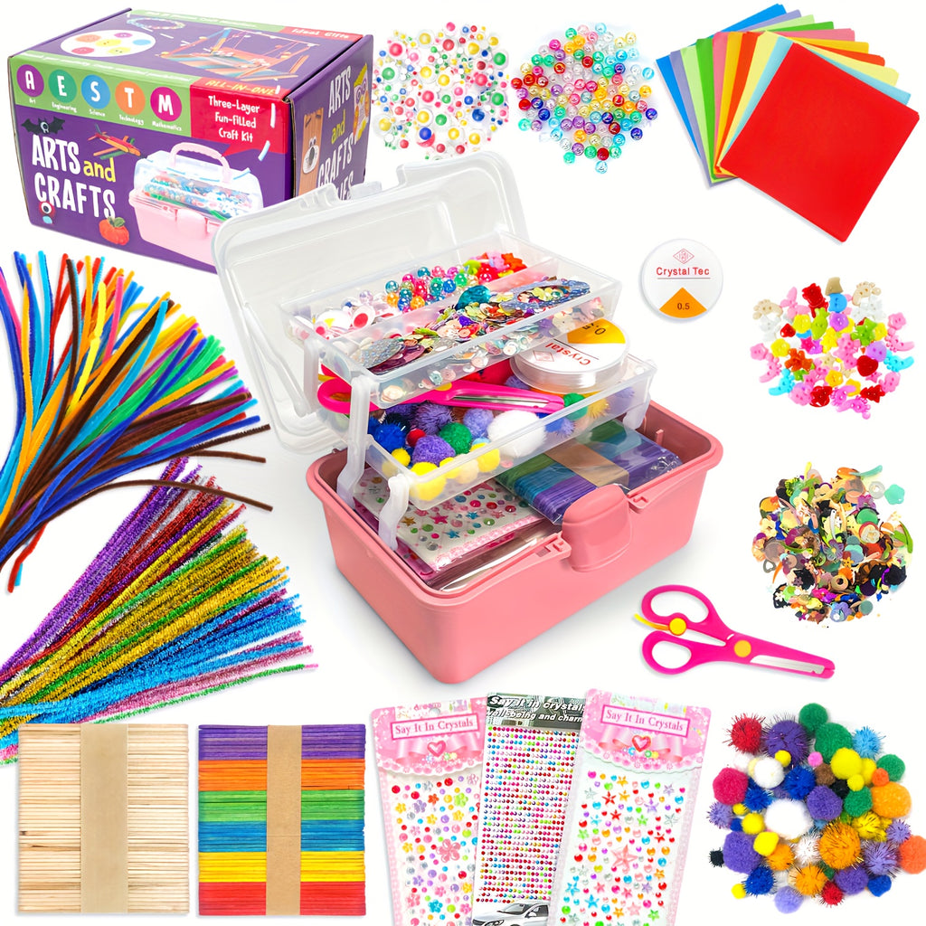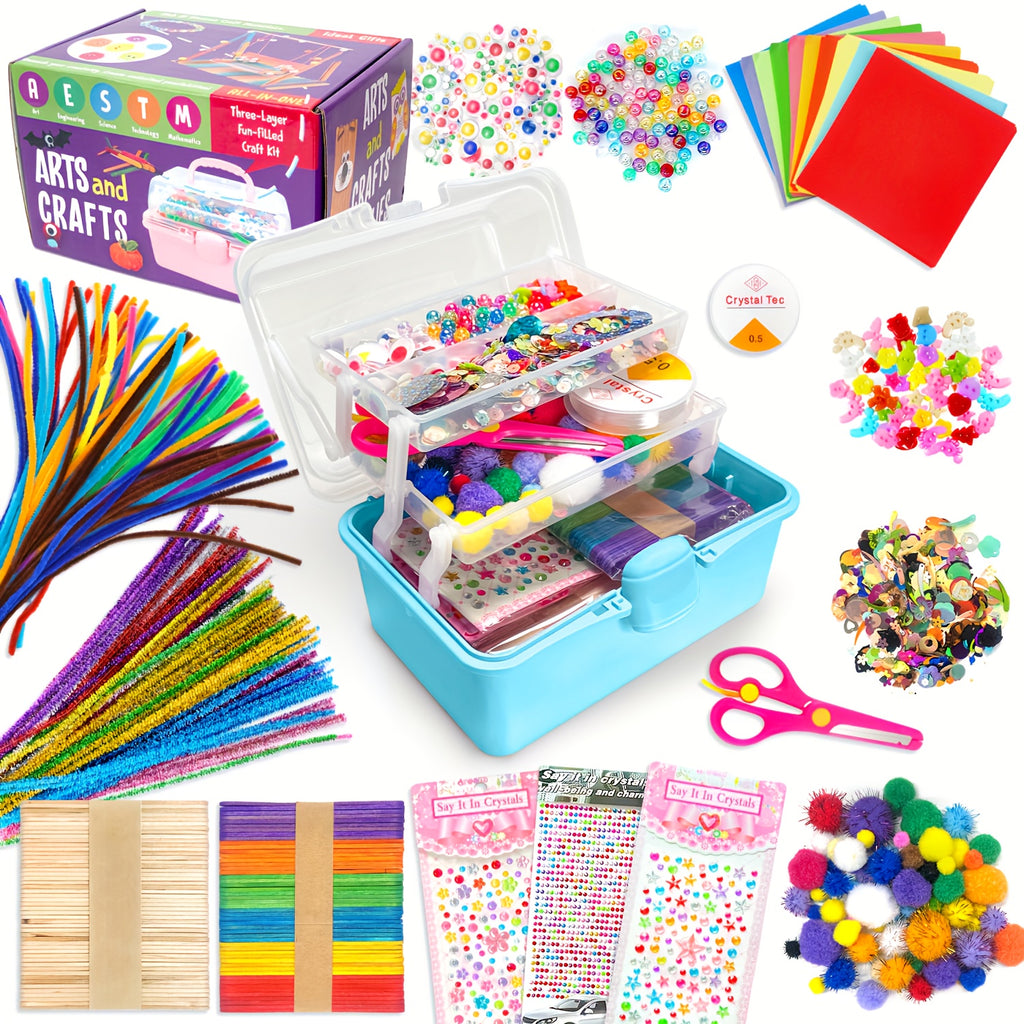 1600 pcs Arts and Crafts Supplies Kits, Arts and Crafts Box with Wooden Sticks, Sequins, Glitter Pipe Cleaners, Pipe Cleaners, Pom Poms, Beads, Paper, Flower Stickers, Crystal Stickers, Buttons, Googly Eyes, Strings, Scissors, Folding Storage Box - All i