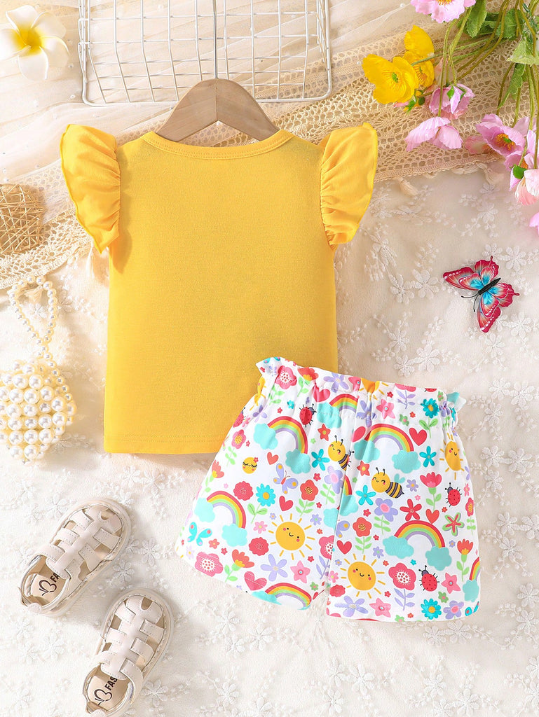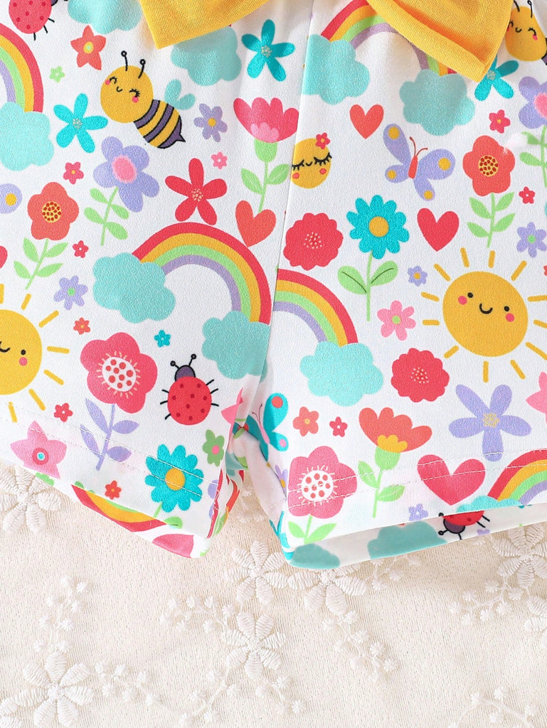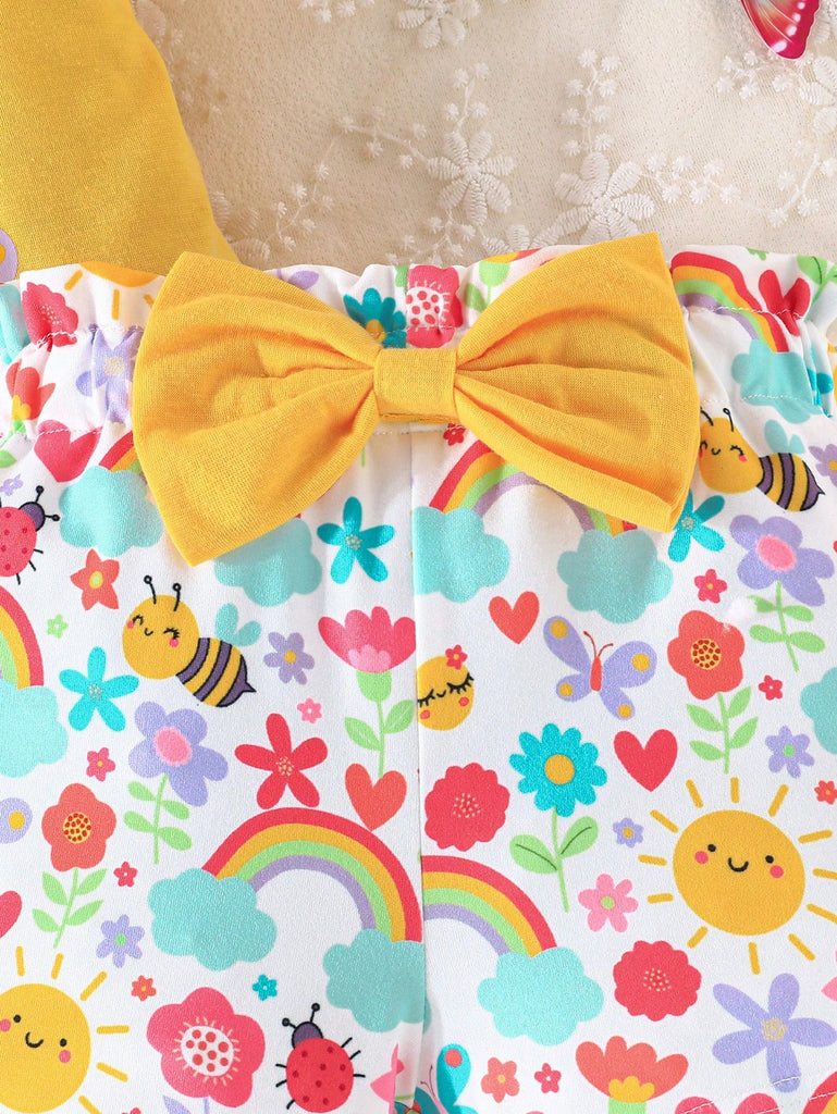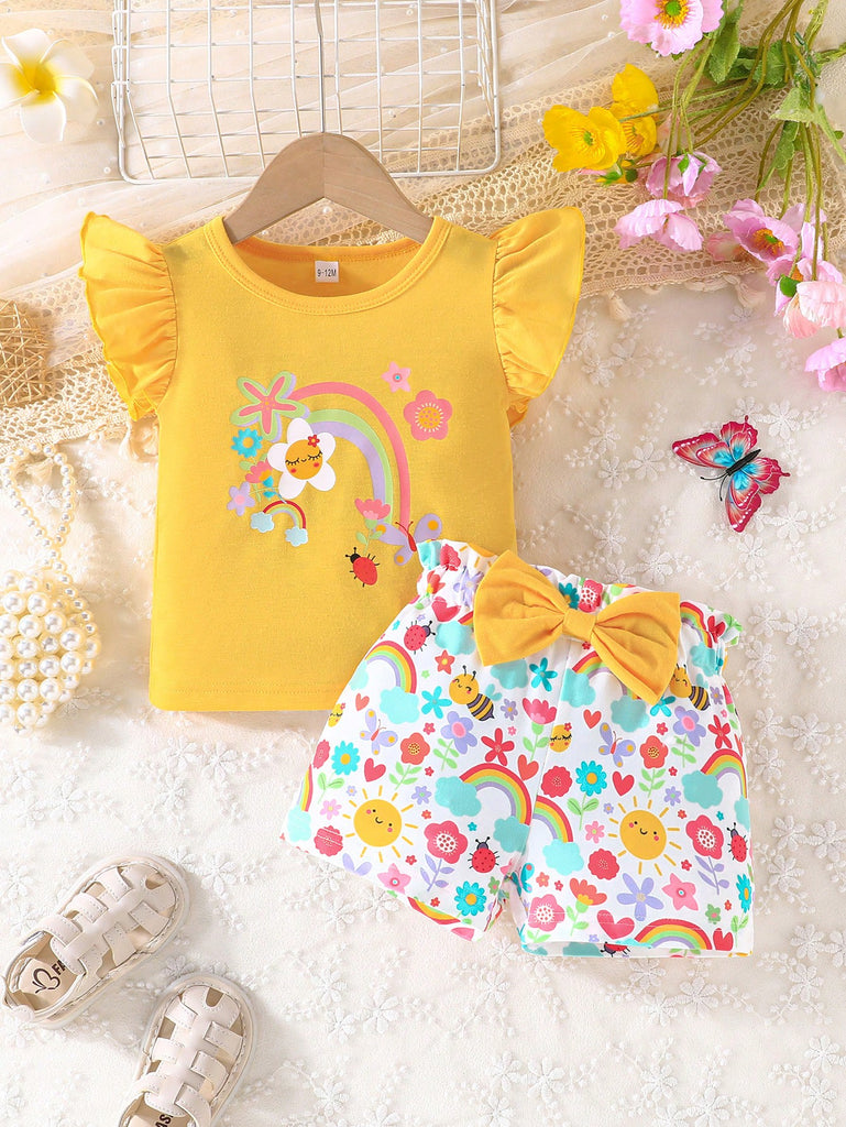 2pcs/Set Baby Girls Sweet Floral Painting Graphic Print T-Shirt With Bowknot Shorts, Adorable Summer Daily/Vacation Outfit