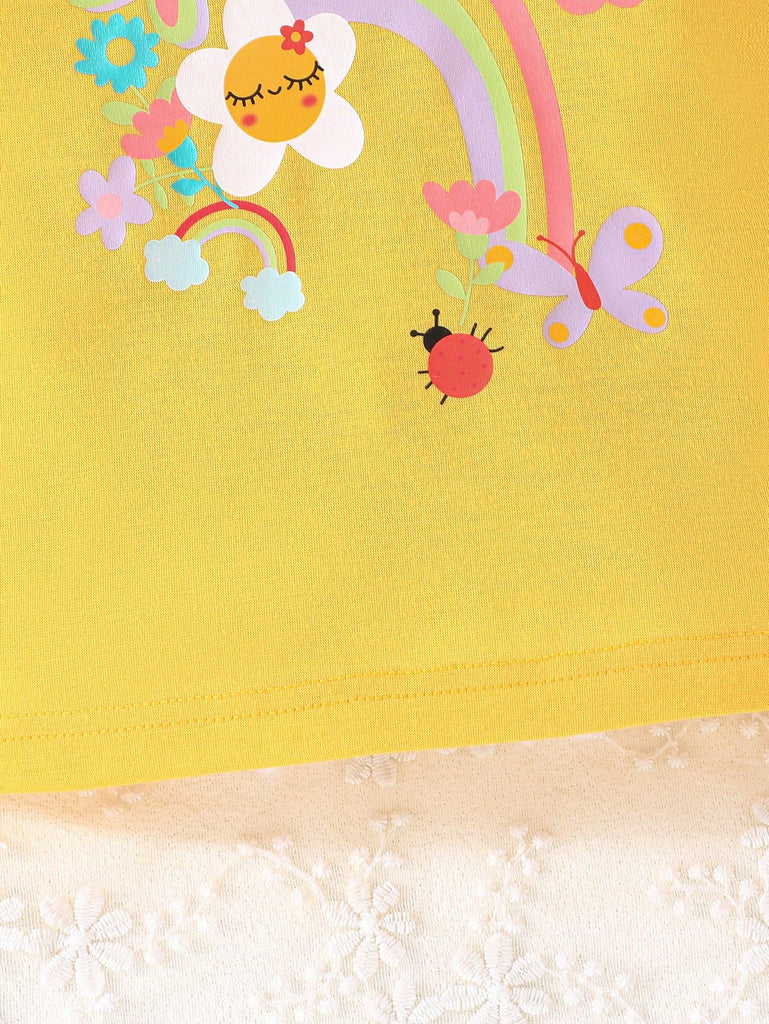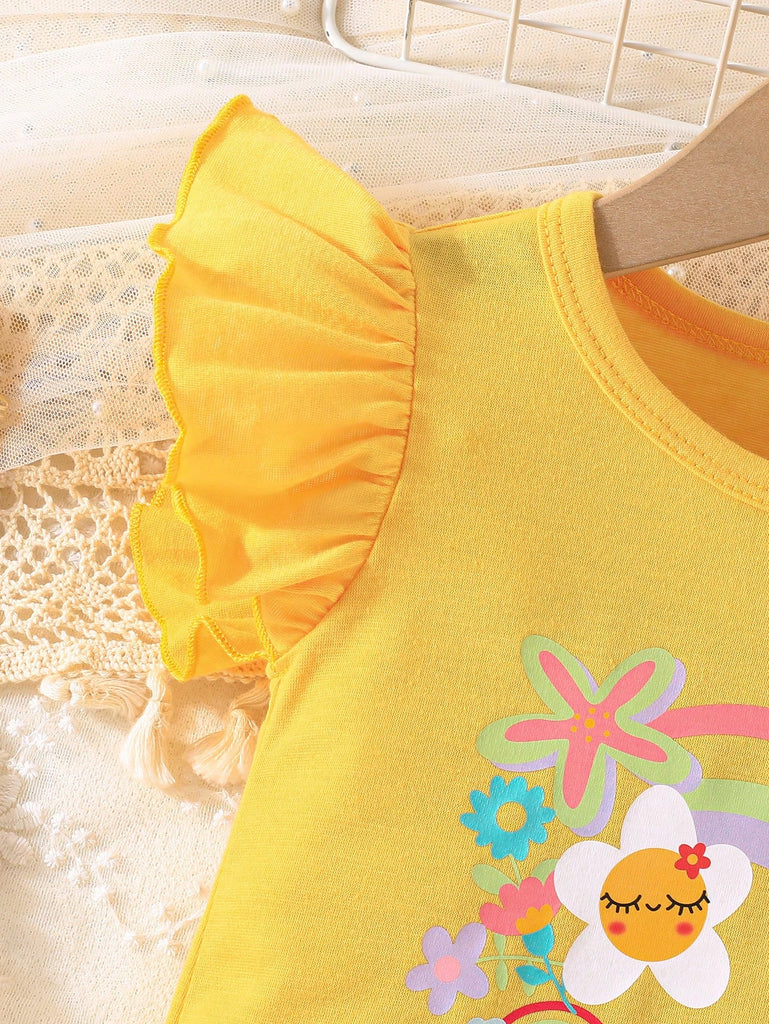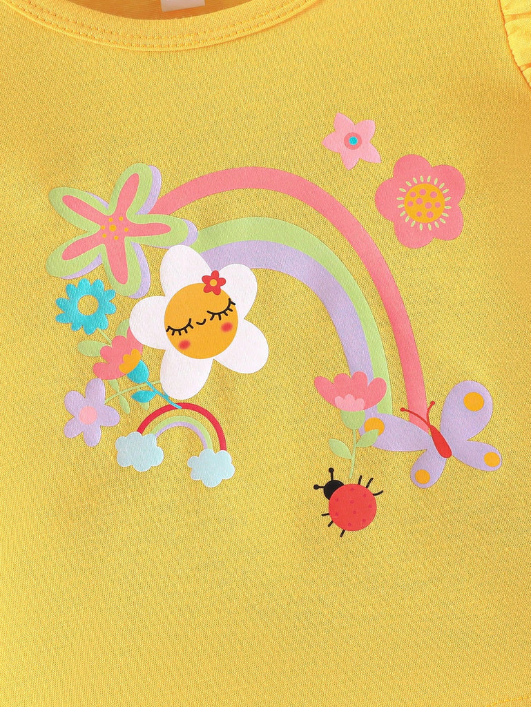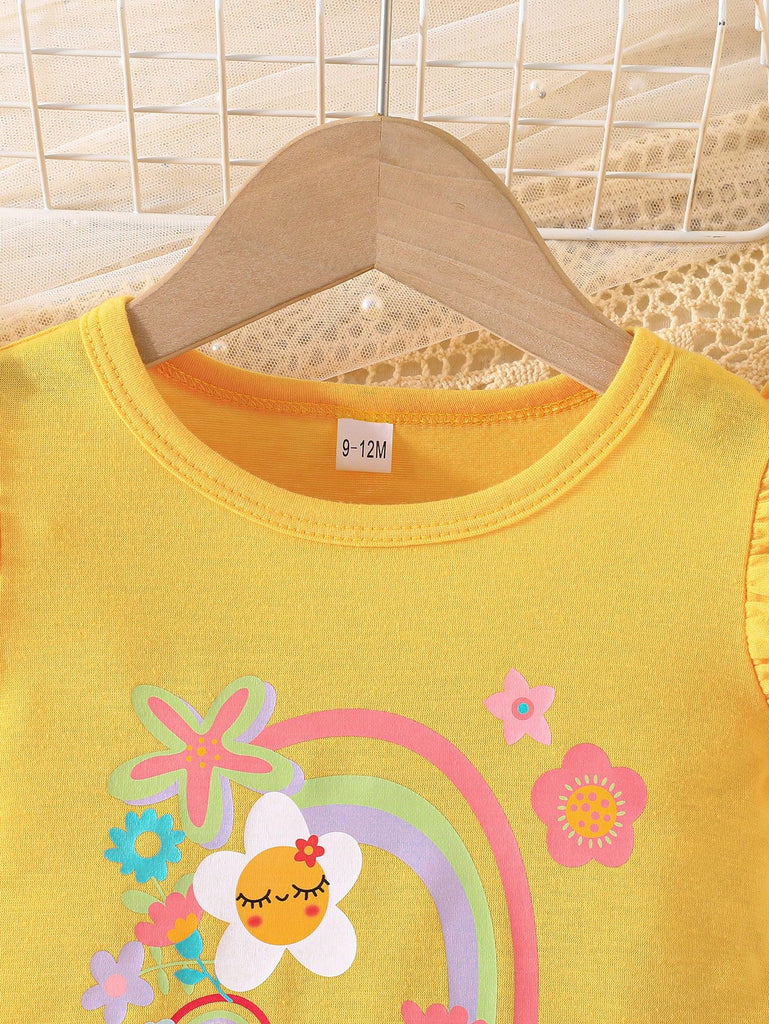 2pcs/Set Baby Girls Sweet Floral Painting Graphic Print T-Shirt With Bowknot Shorts, Adorable Summer Daily/Vacation Outfit