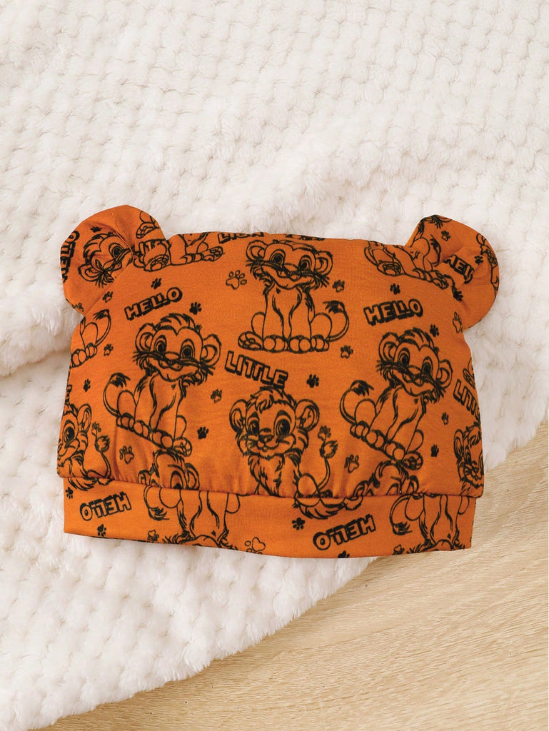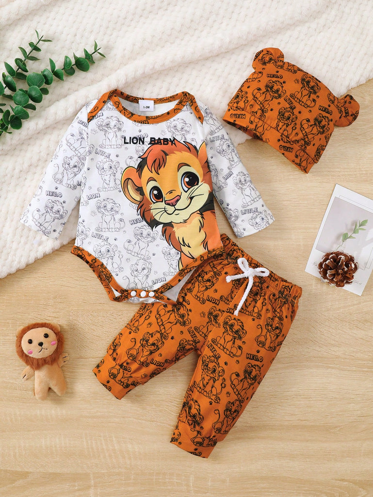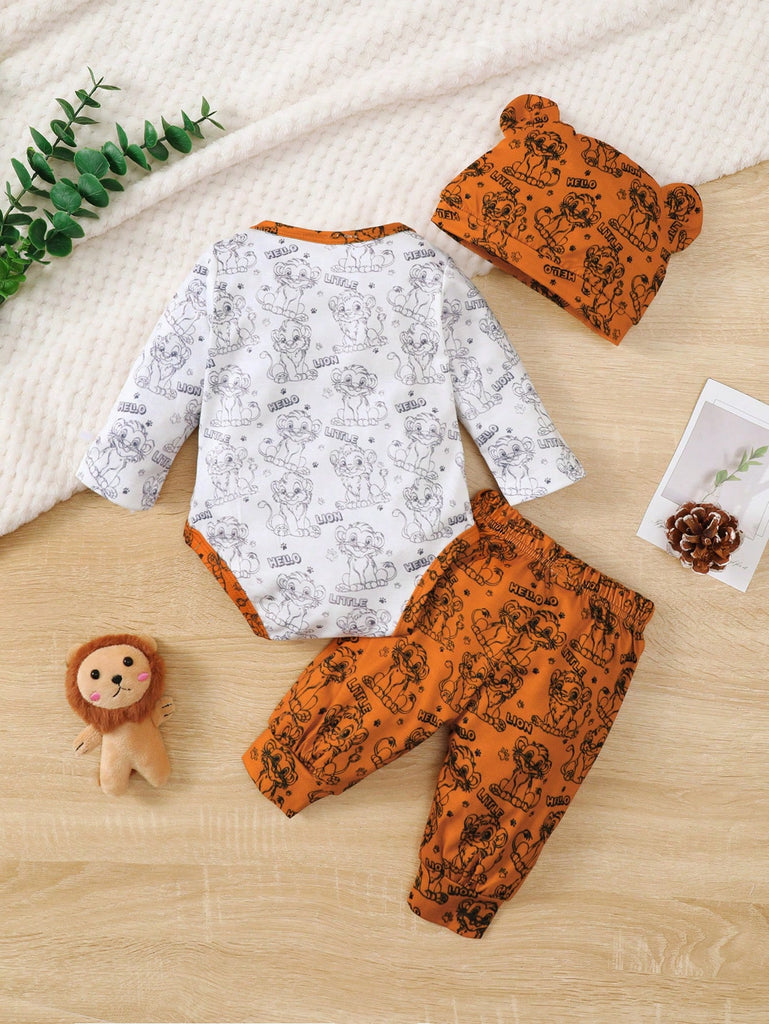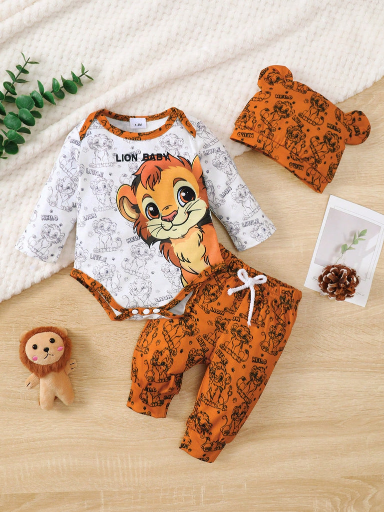 Baby Boy 3pcs Set "Brave Lion Baby" Long Sleeve Top, Pants With Lion Print, And Hooded Hat