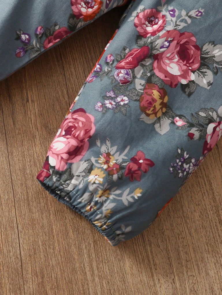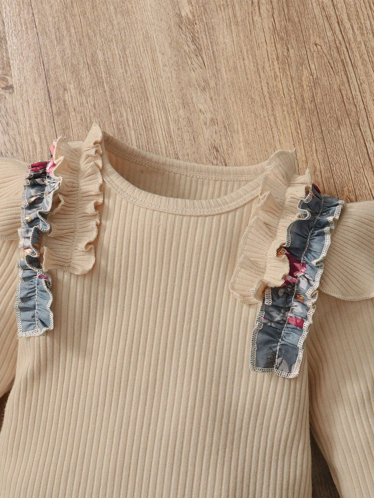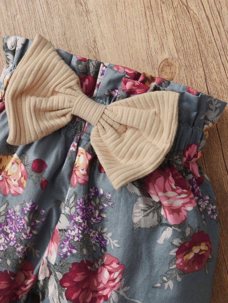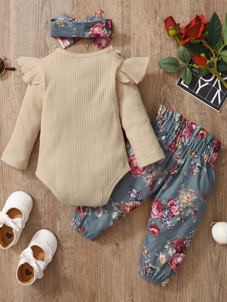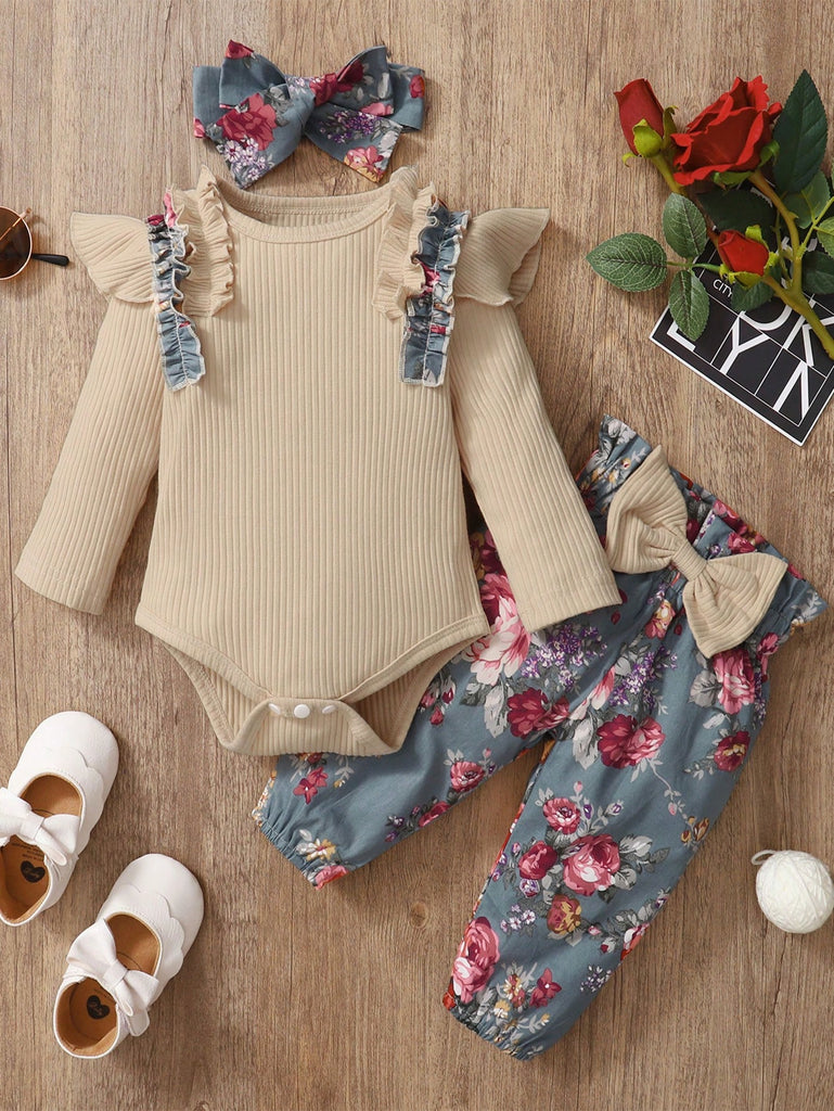 Baby Girl Ruffle Trim Bodysuit & Floral Print Bow Front Pants & Headband
