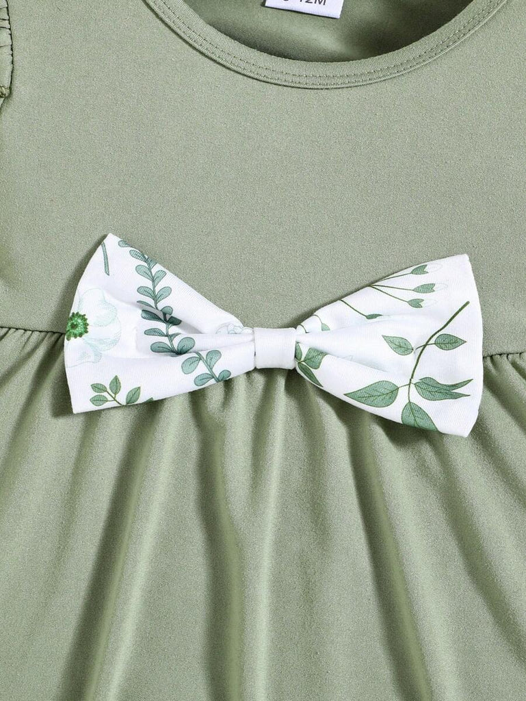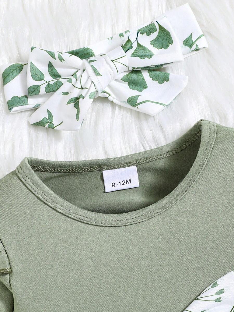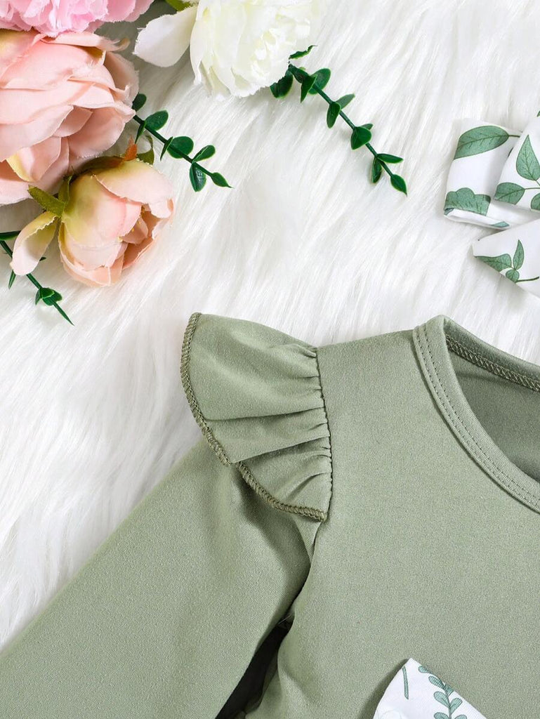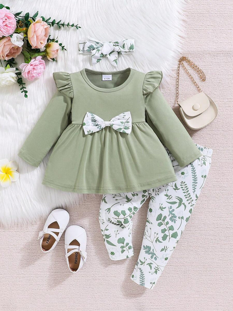 Baby Girl Solid Color Peter Pan Collar Long Sleeve Top With Printed Long Pants Set, Fall/Winter