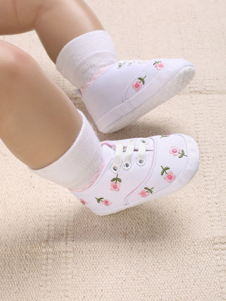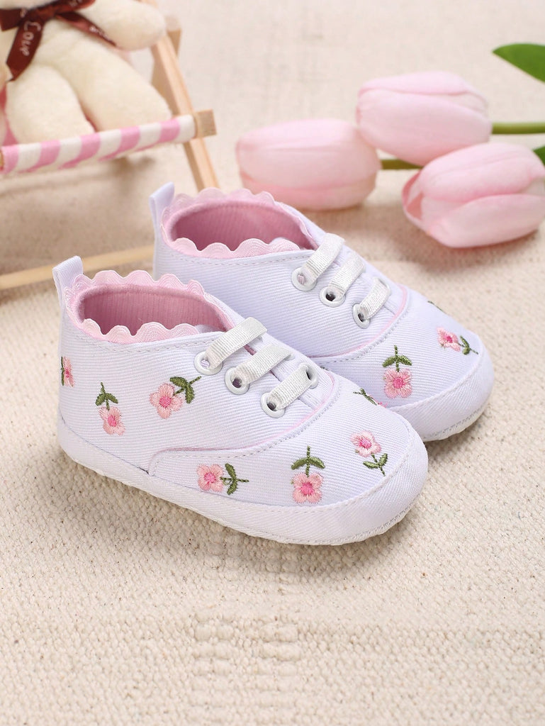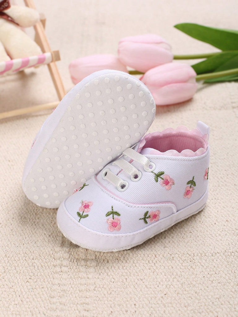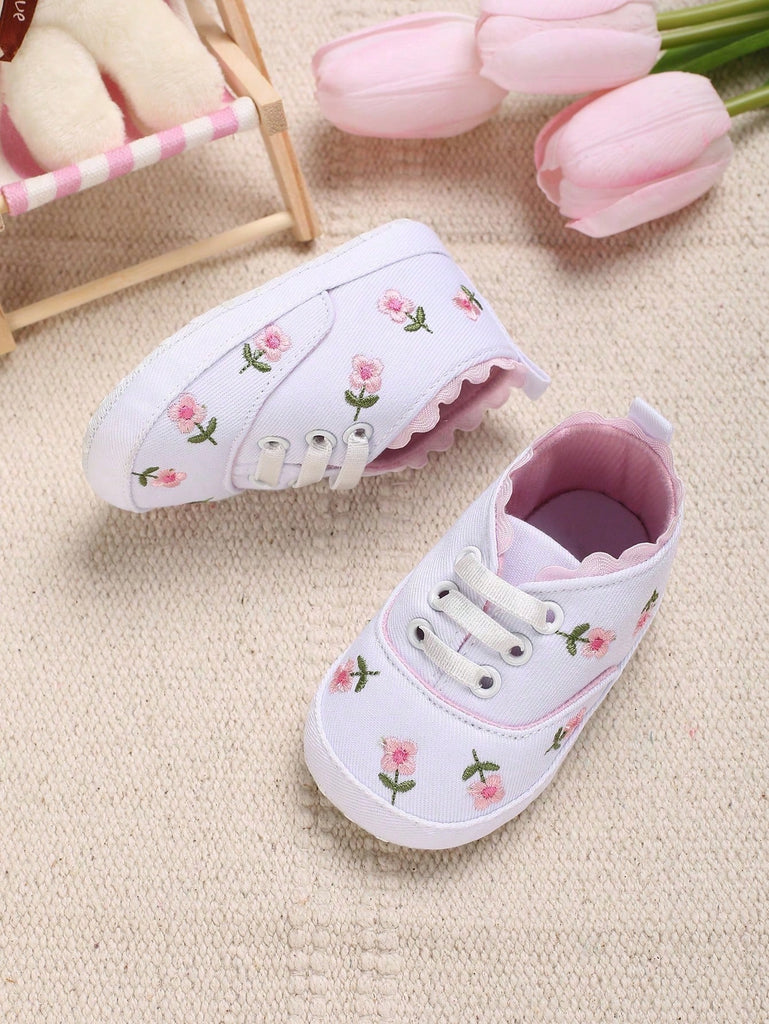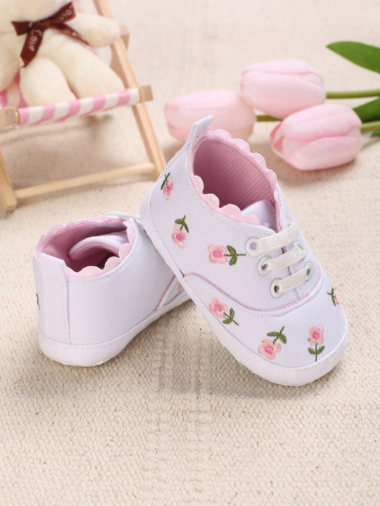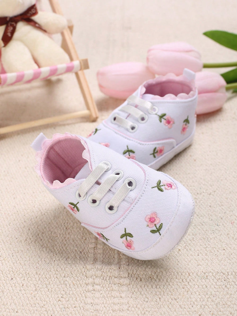 Infant Girls Lace Up Design Flower Embroidered Fabric Oxfords For Spring