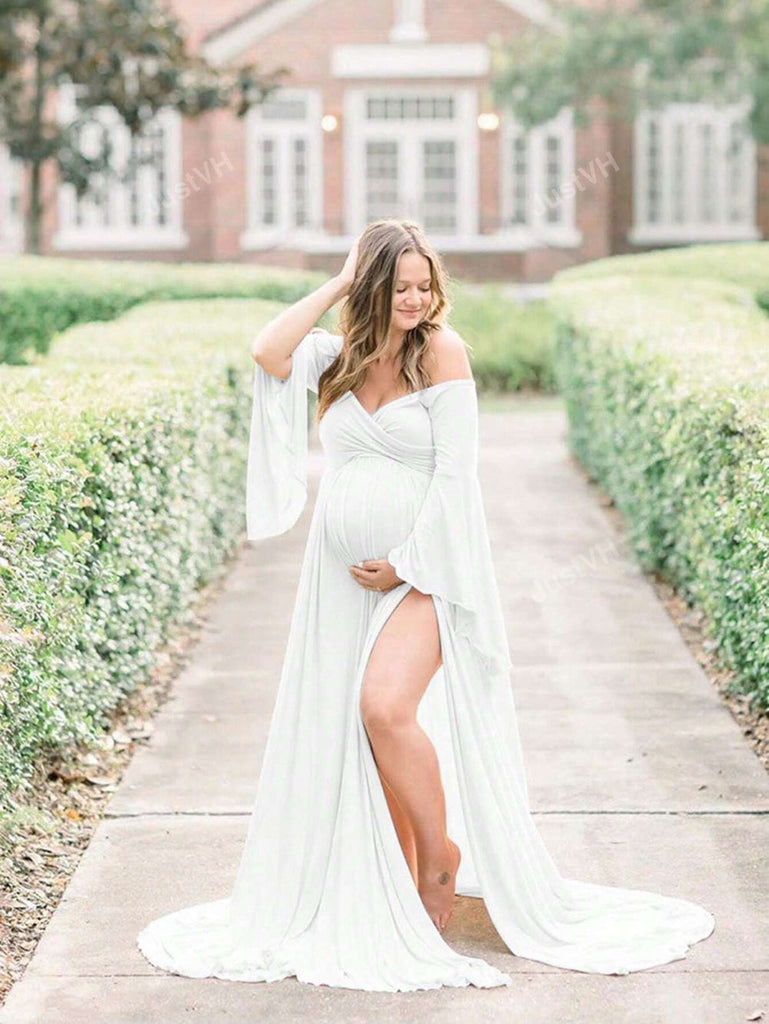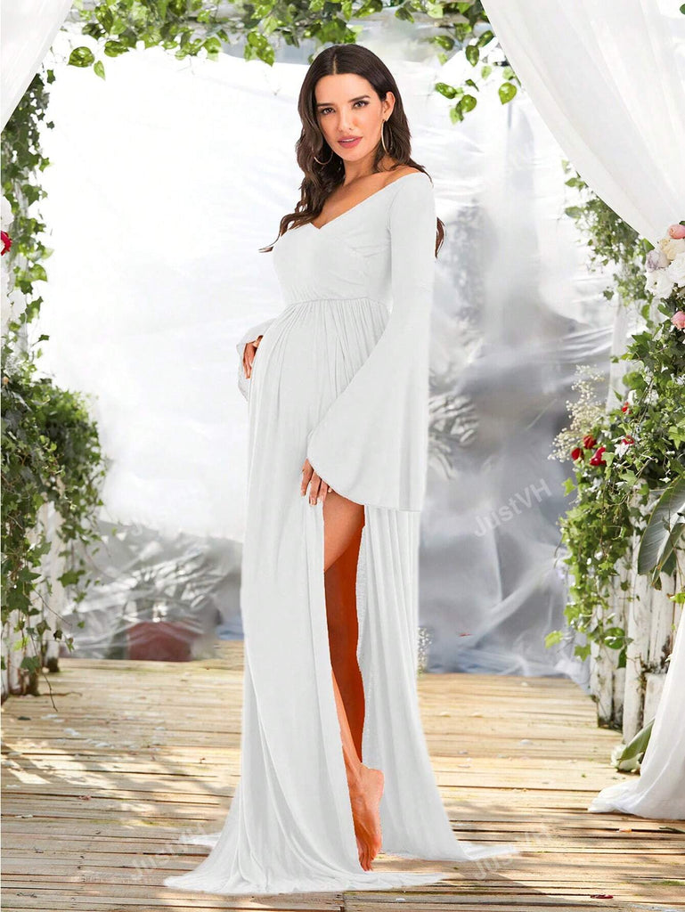 Maternity V-Neck Off Shoulder Maxi Photography Long Sleeve Dress Baby Shower, Baby Shower Dress, For Photoshoot