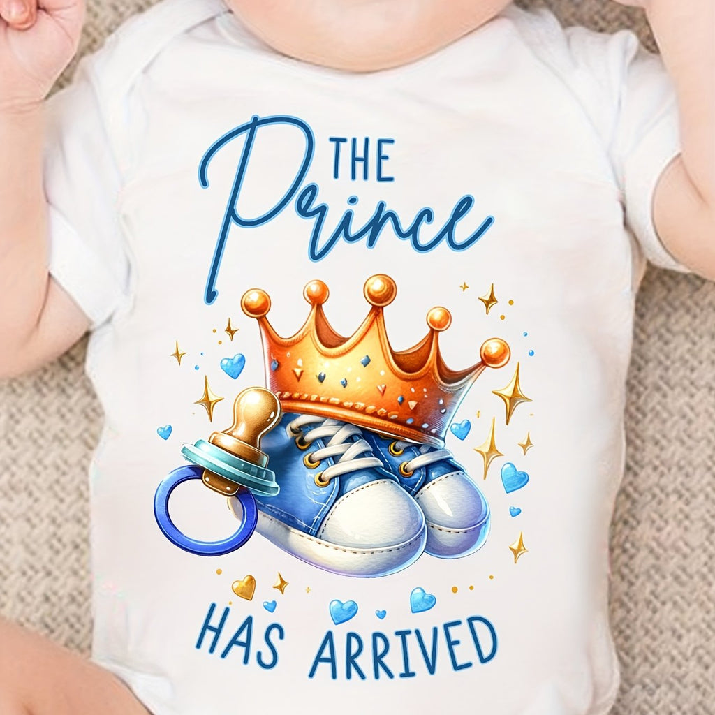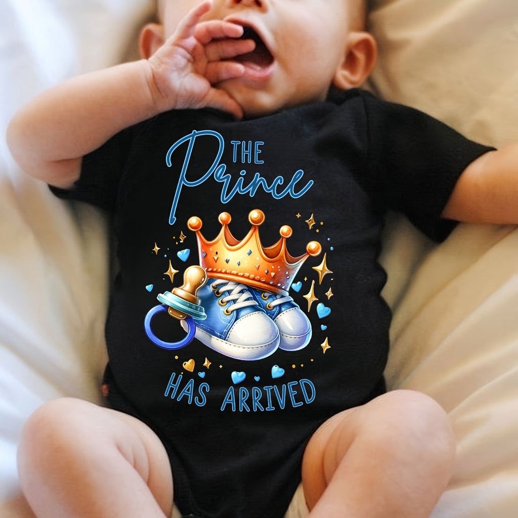 Soft Breathable Newborn Baby Boys' "The Prince Has Arrived" Crown & Sneakers Print Short-Sleeve Romper | Black Summer Jumpsuit, Easy Diaper Change, Casual Infant Wear, Playful Infant Design, Comfortable Infant Wear, for New Parents, Ou