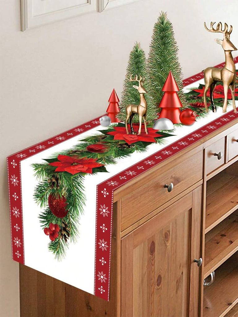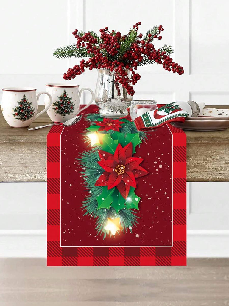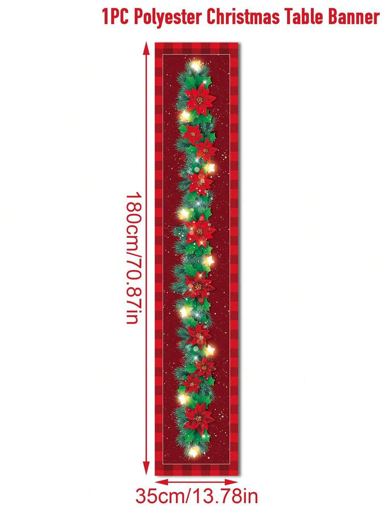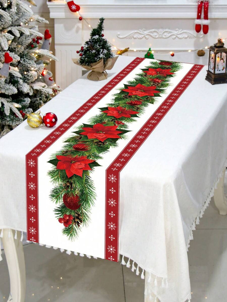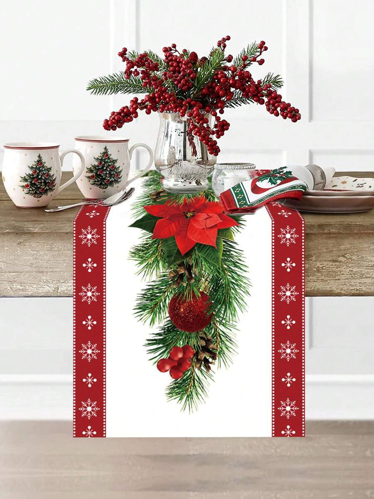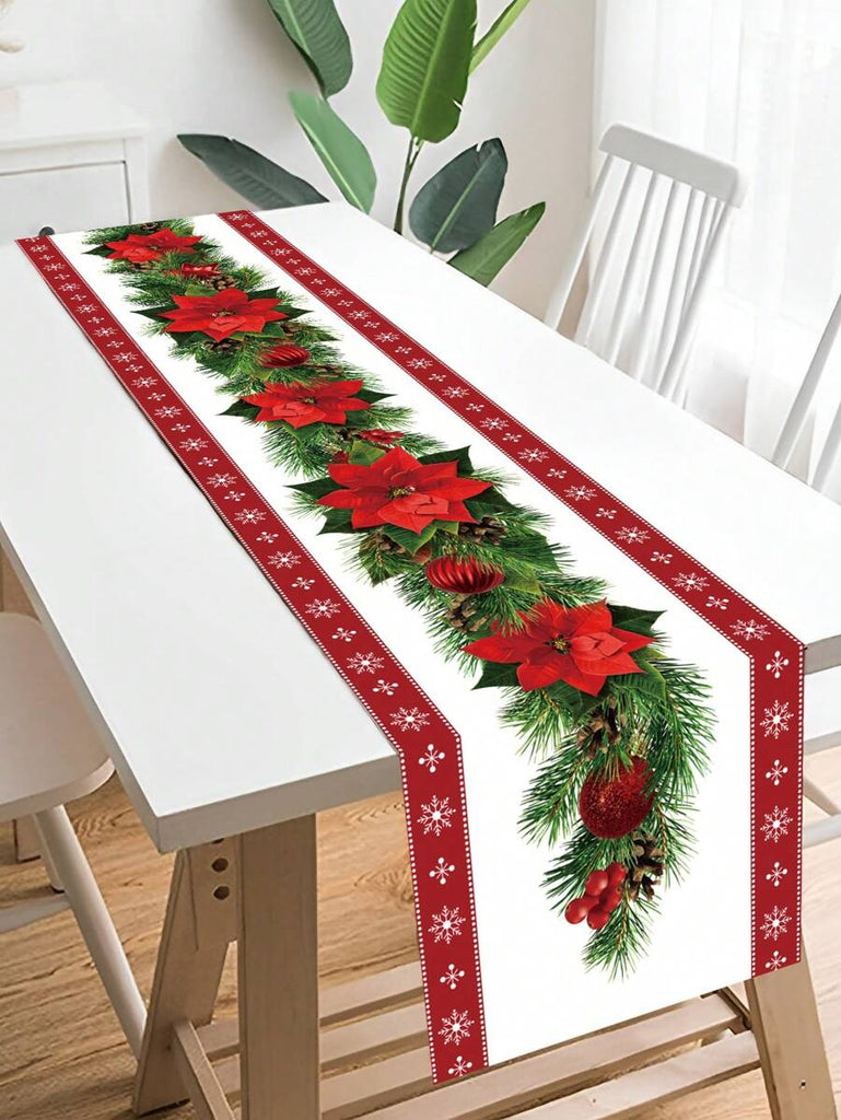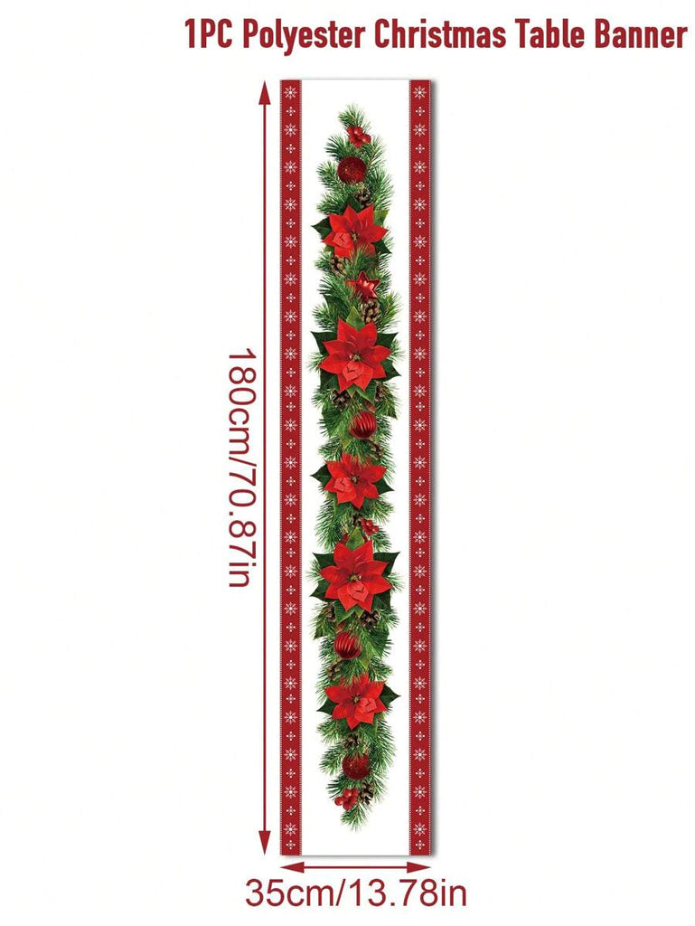 1Pc Christmas Polyester Table Runner, Red Flower Pine Tree Branch Snowflake Pattern Table Cloth Table Cover, Merry Christmas Table Runner, Christmas Atmospheric Decoration Supplies, Holiday Desktop Decoration, Fireplace Table Centerpiece, Xmas Party Decor