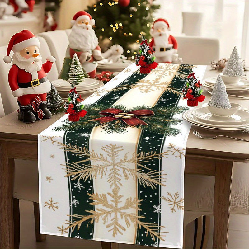 1pc Christmas Wreath Print Table Runner, Green Pine Branches with Red Bow and Golden Accents Design for Home Decor - Suitable as Dining Room/Kitchen Countertop Covering or Living Space Tea Tray Cloth in Entryway Office Art Studio Family Gatherings Outdoo