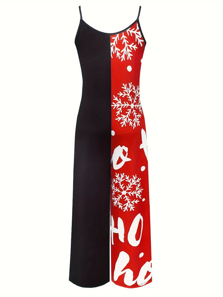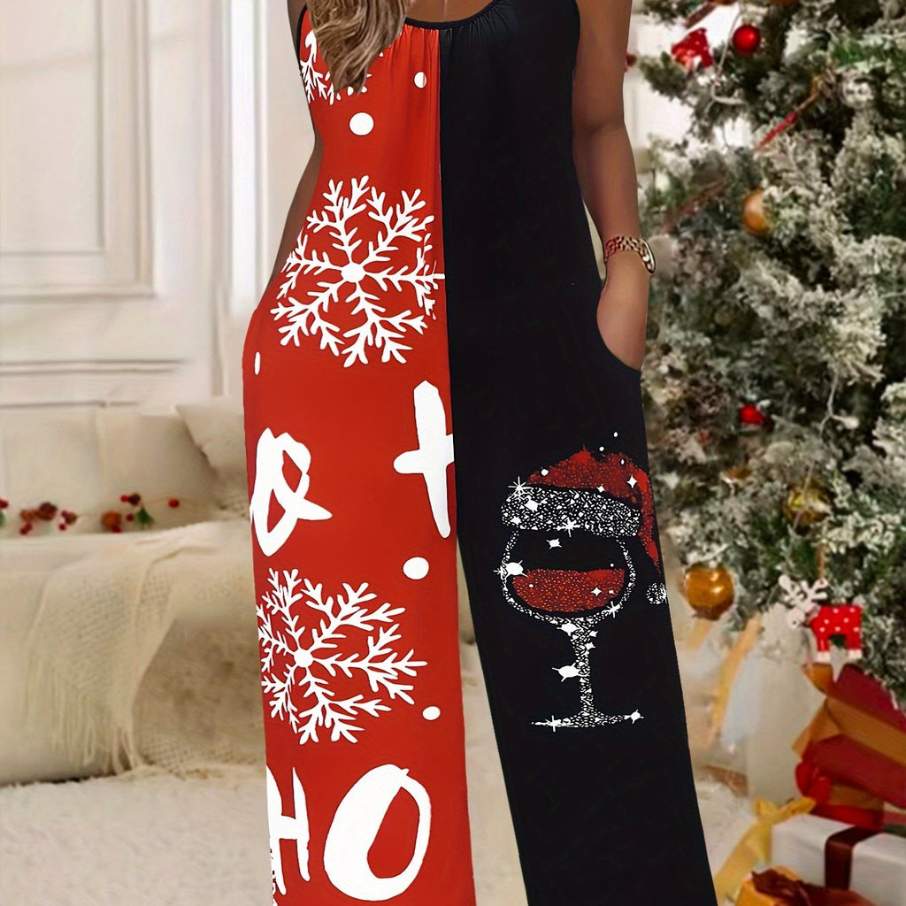 1pc Festive Christmas Print Women's Jumpsuit - Polyester Spaghetti Strap Wide Leg Pants with Round Neck and Pockets, Casual Knitted Sleeveless One-Piece Lounge Wear