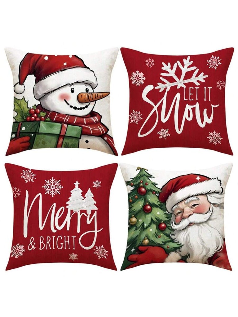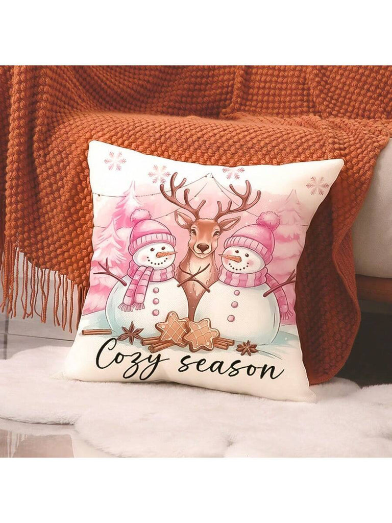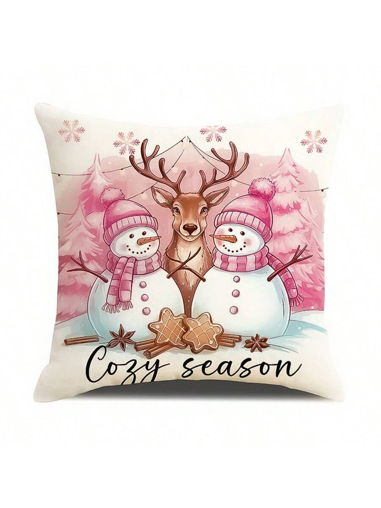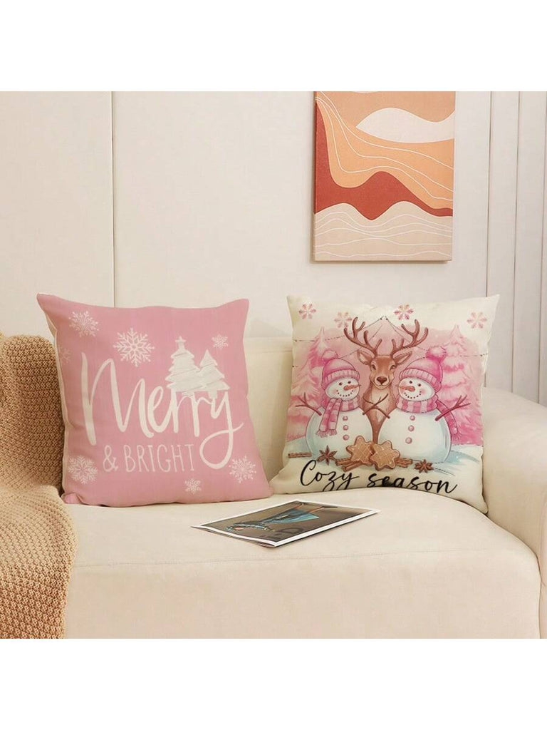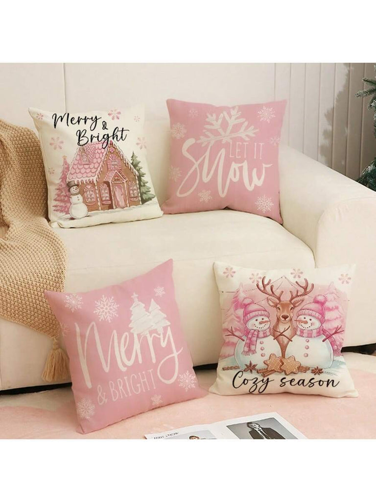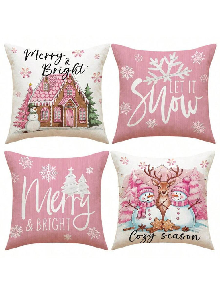 4pcs Christmas Theme Pillow Covers, Pink Letter Print Snowman & Reindeer Pattern, Farmhouse Style Polyester Fabric Zippered Single-Sided Print Cushion Covers, Pillow Inserts Not Included, Winter, Christmas Holiday Home Decor, Suitable For Sofa, Bed, Chair