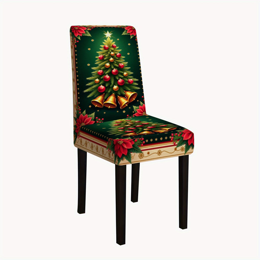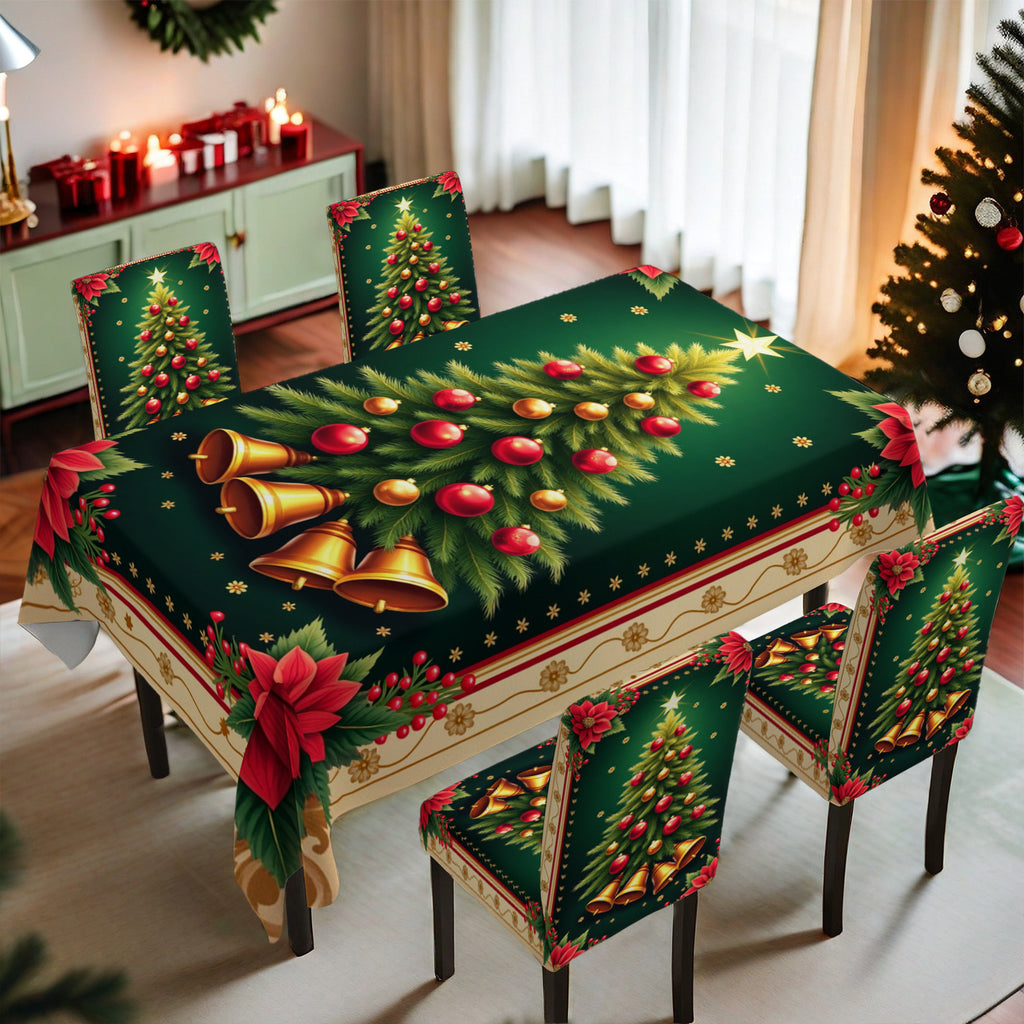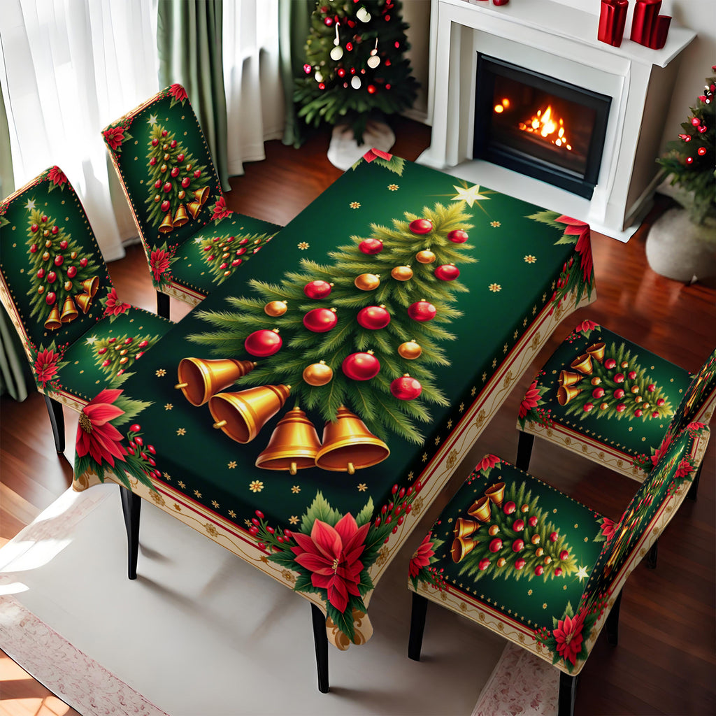 5pcs/7pcs 2D Flat Golden Flower Christmas Tree Pattern Digital Print Chair Cover Set - Includes 1 Tablecloth 4 Chair Covers (5pcs) or 1 Tablecloth 6 Chair Covers (7pcs), Perfect for Winter Gatherings, Holiday Parties & Festive Decor, 2D Flat
