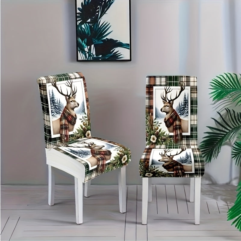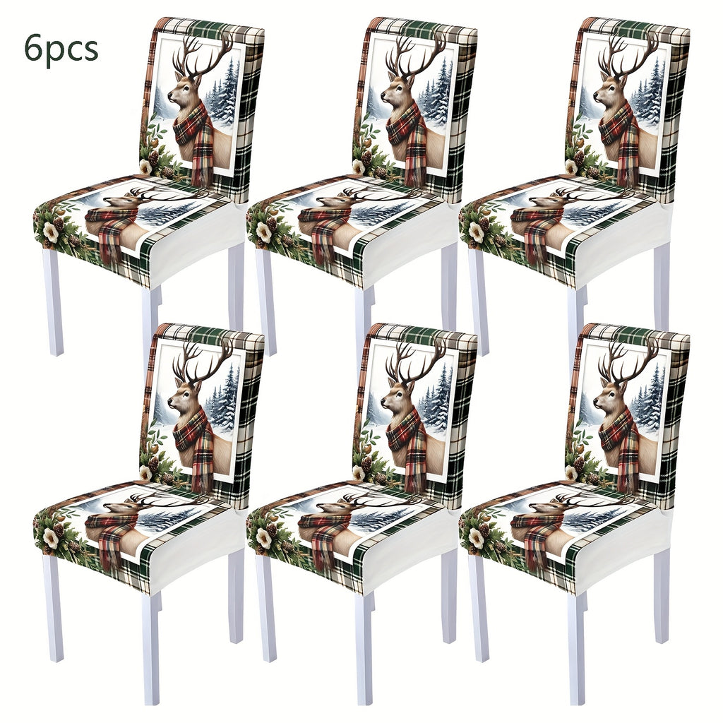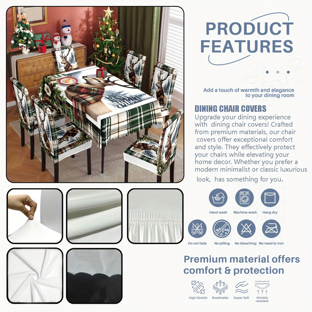 Elk Theme Holiday Table and Chair Set. Elk pattern with plaid elements, retro warm 5/6/7pcs chair covers and tablecloth set: 5pcs (1 tablecloth 4 chair covers), 6pcs (6 chair covers), 7pcs (1 tablecloth 6 chair covers). Suitable for holiday decoratio