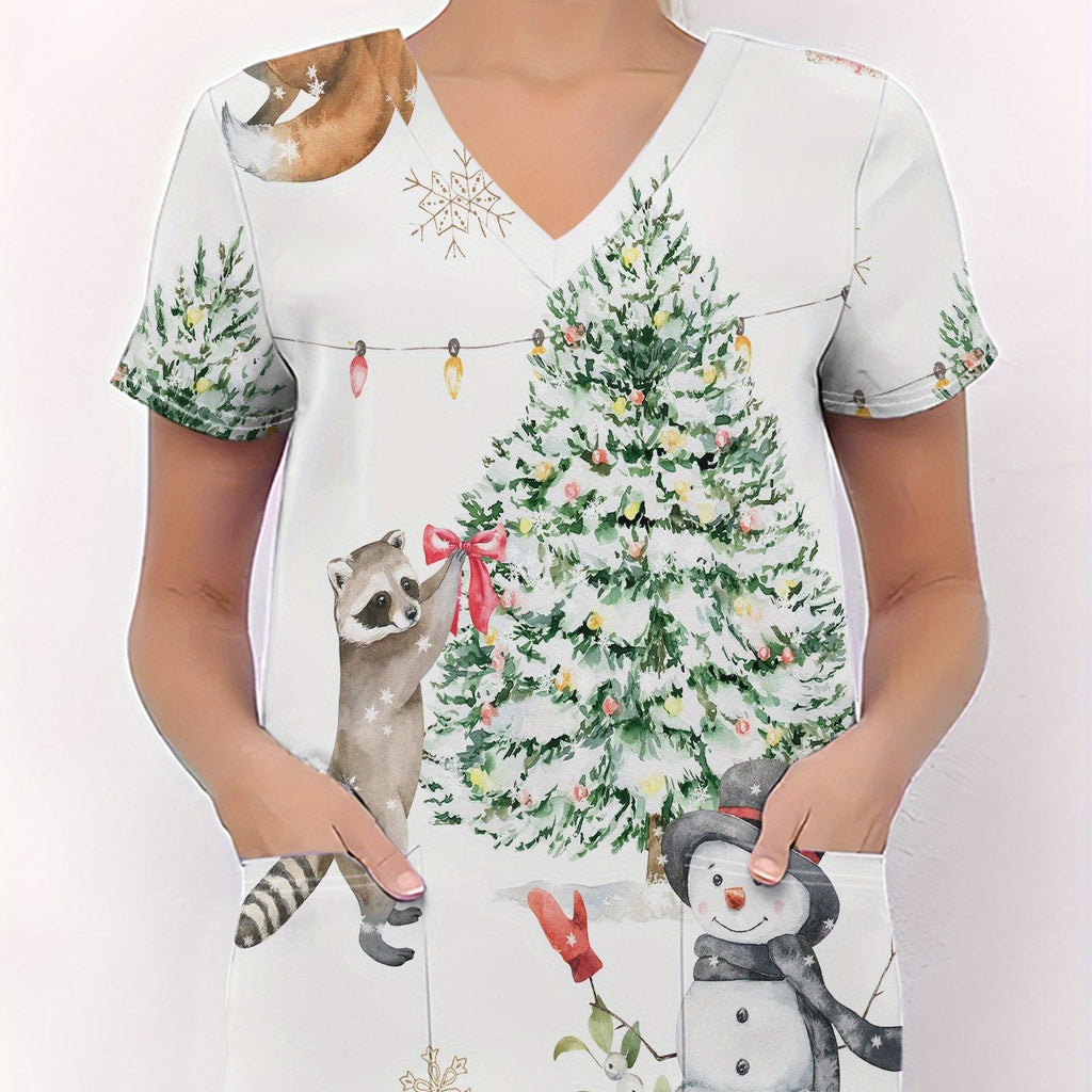 Plus Size, Women's Christmas Nurse scrub top - Festive scrub jacket with V-Neck & Short Sleeves - Soft Machine-Washable Polyester Holiday work party Outfit - Featuring Snowmen, Raccoons, Christmas Trees - Perfect Christmas Gift for Nurses & Holiday Event