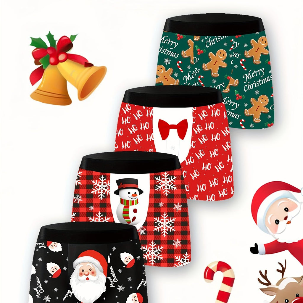 Random 4pcs Men's Christmas Boxer Briefs - Festive Santa, Snowman & Gingerbread Print Comfortable, Stretchy & Breathable Perfect Holiday Gift, Christmas Accessories, suitable for daily wear
