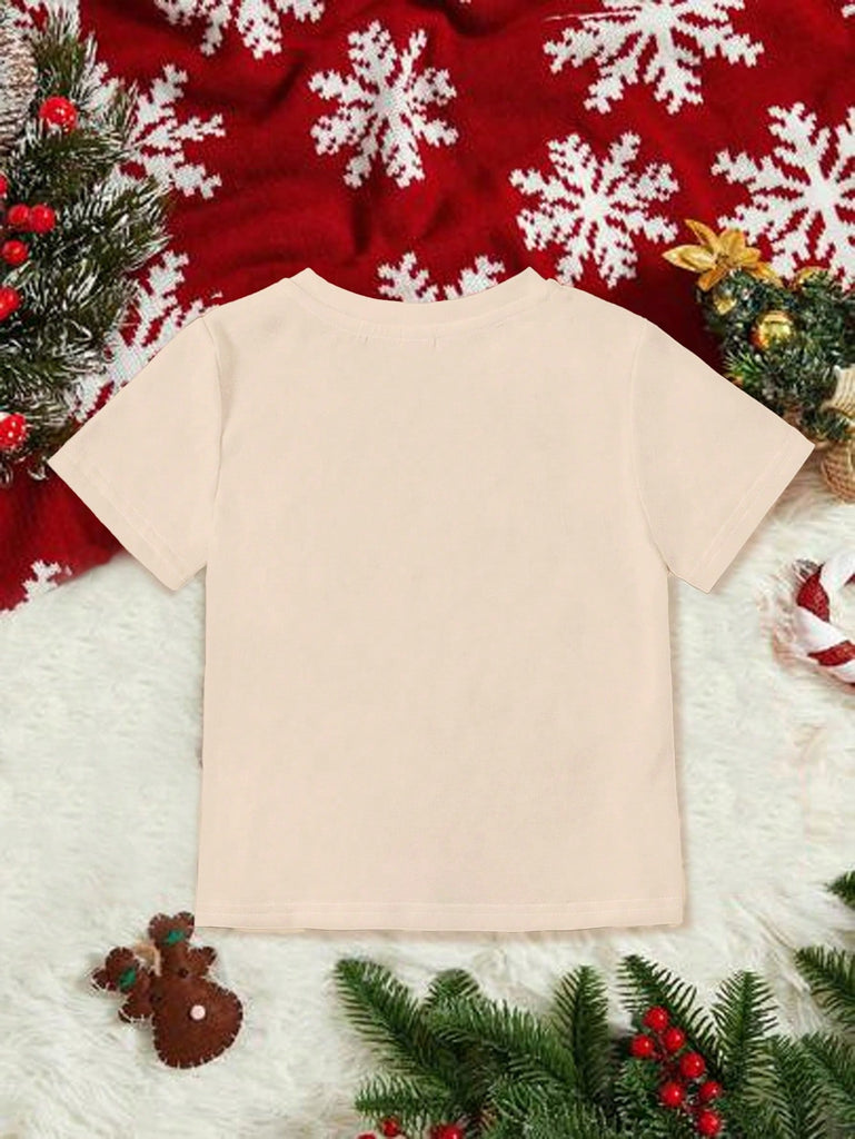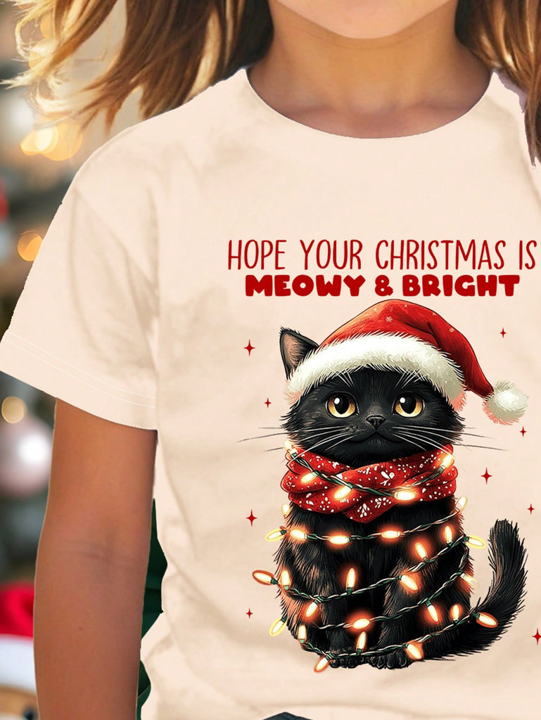 SHEIN Christmas Meowy&Bright Cat Graphic Casual Minimalist Short Sleeve Round Neck T-Shirt, For Tween Girls