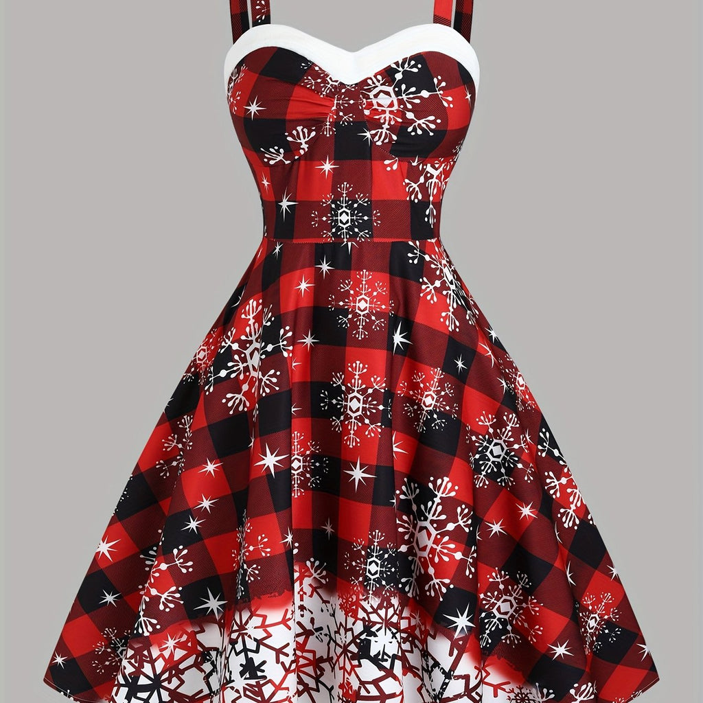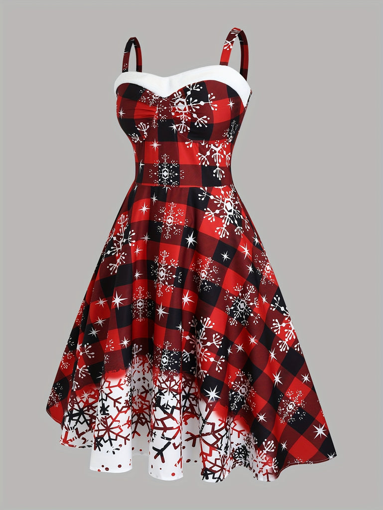 Women's Y2K Plaid Snowflake Print Sleeveless Dress, Christmas Party Dress, Shoulder Strap, Faux Fur Trim, Polyester, Spring/Autumn, Adult Size, Woven Fabric