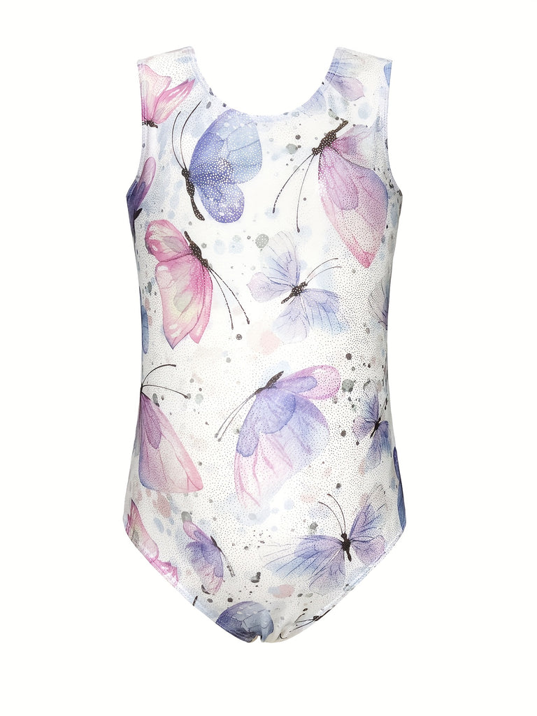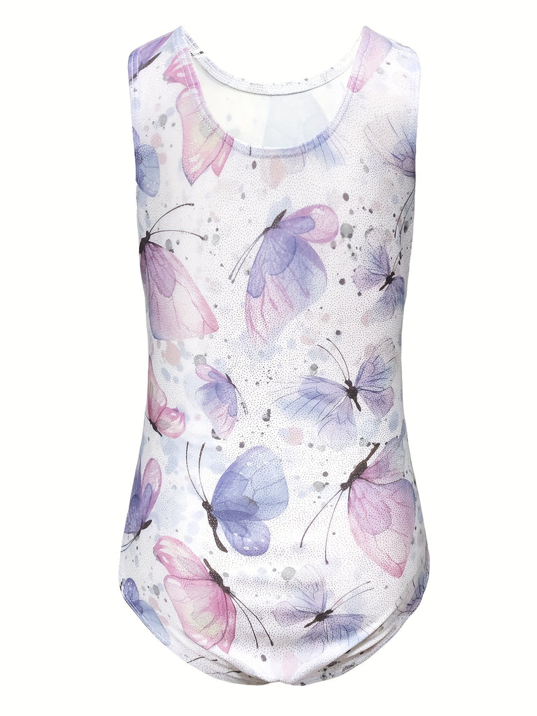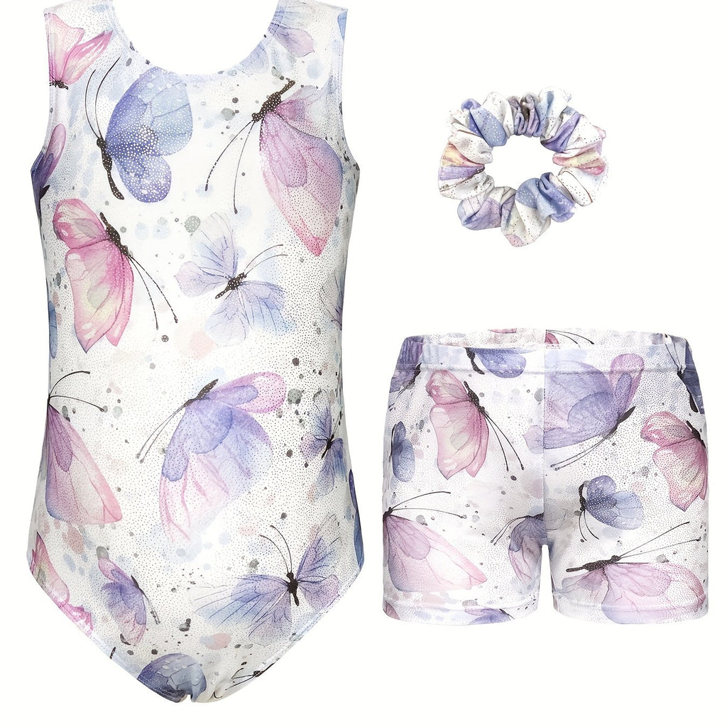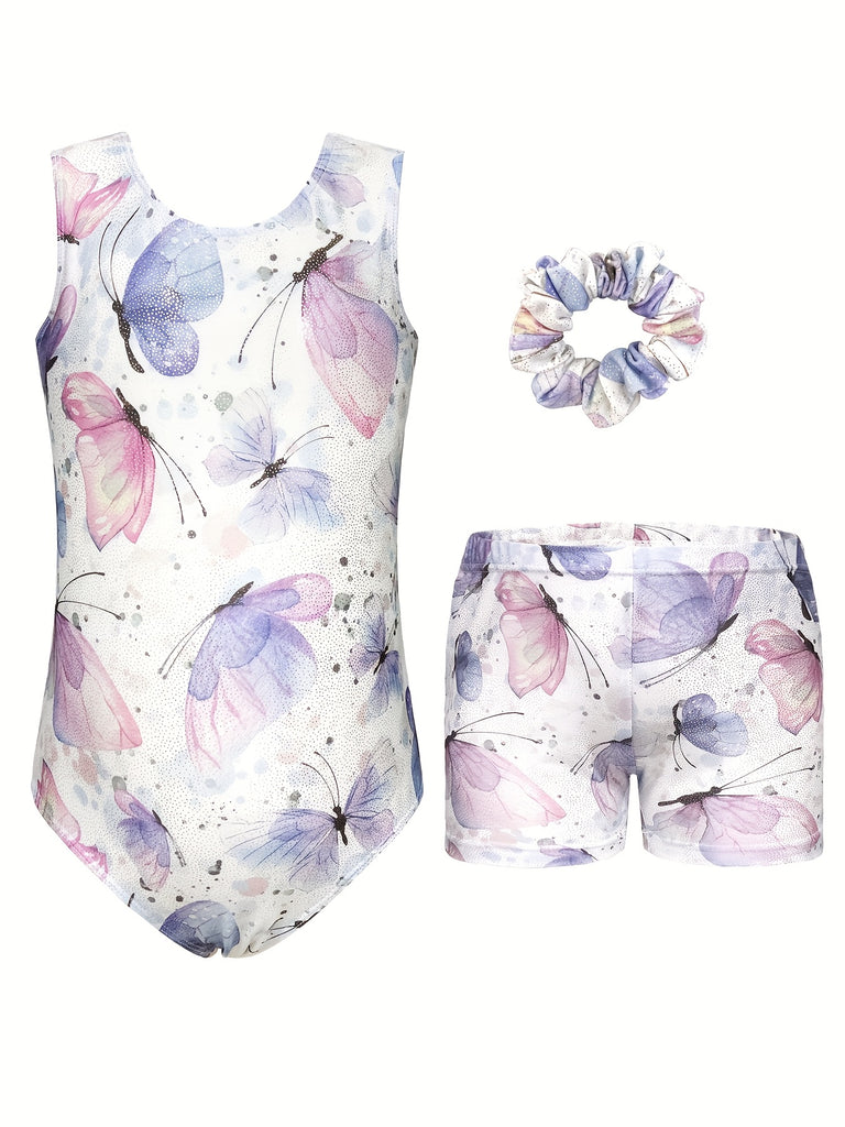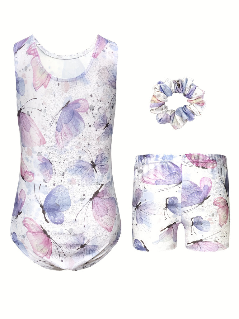 3pcs Butterfly Print Gymnastics Leotard Set for Girls - Sleeveless, Skinny Fit, High Stretch Fabric, Pink and Purple Butterfly Design, Includes Headband and Shorts, Perfect for Dance and Gymnastics, Gymnastics Attire|Playful Design|Stretchy Fabric, for O