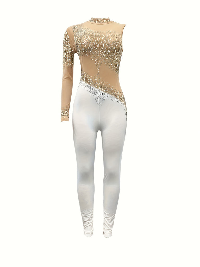 Elegant One-Shoulder Rhinestone Embellished Jumpsuit - Polyester & Elastane Blend, Solid Color, Long Sleeve, Skinny Fit Knit Fabric for Spring/Fall, Classy Going Out Attire