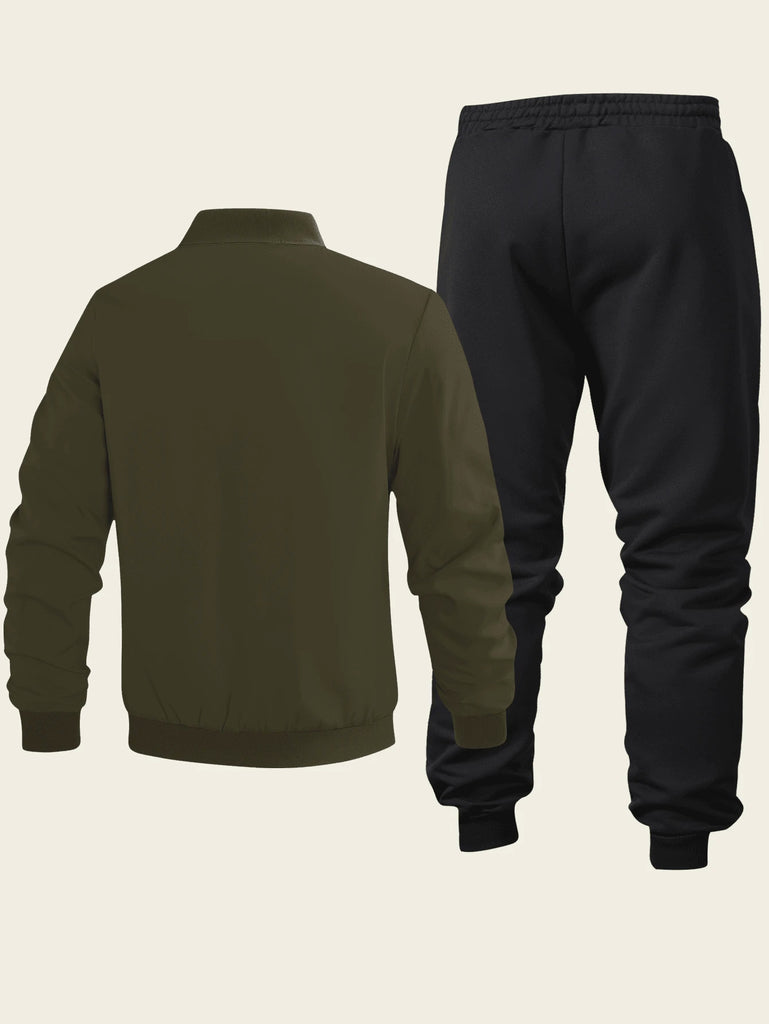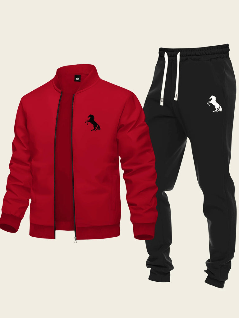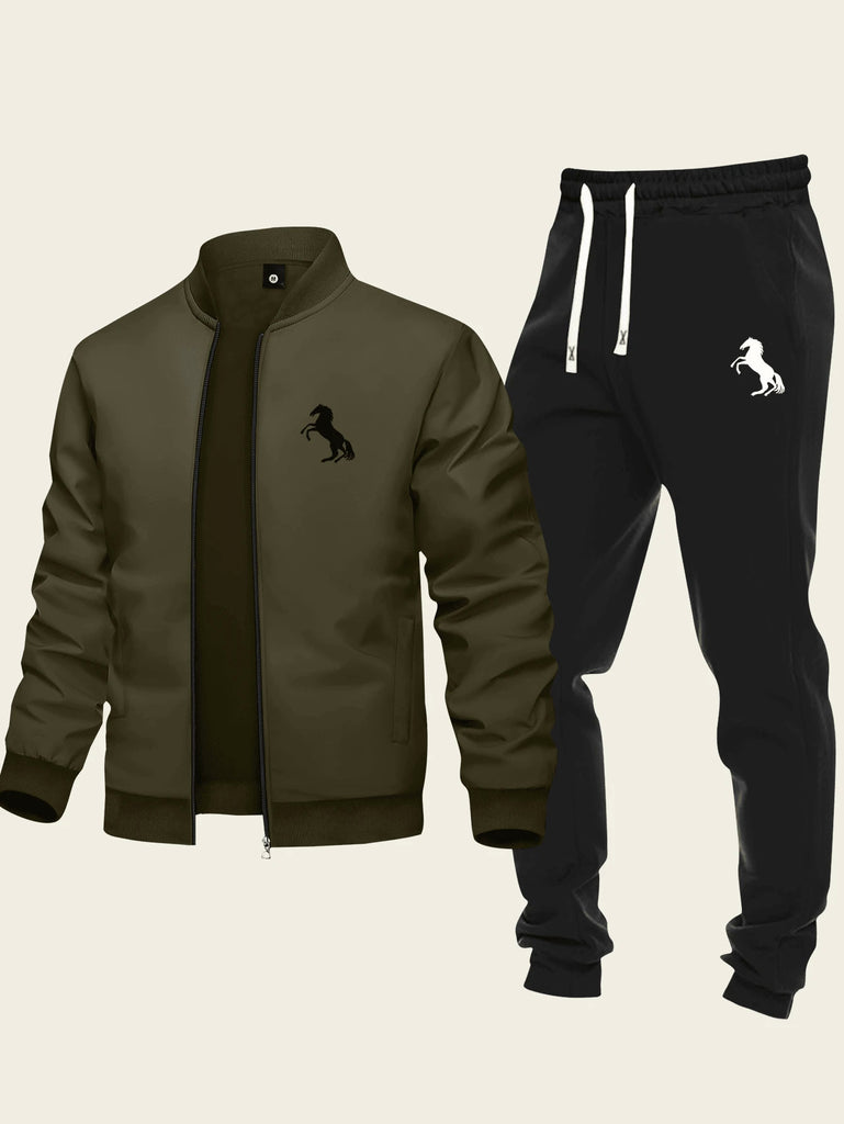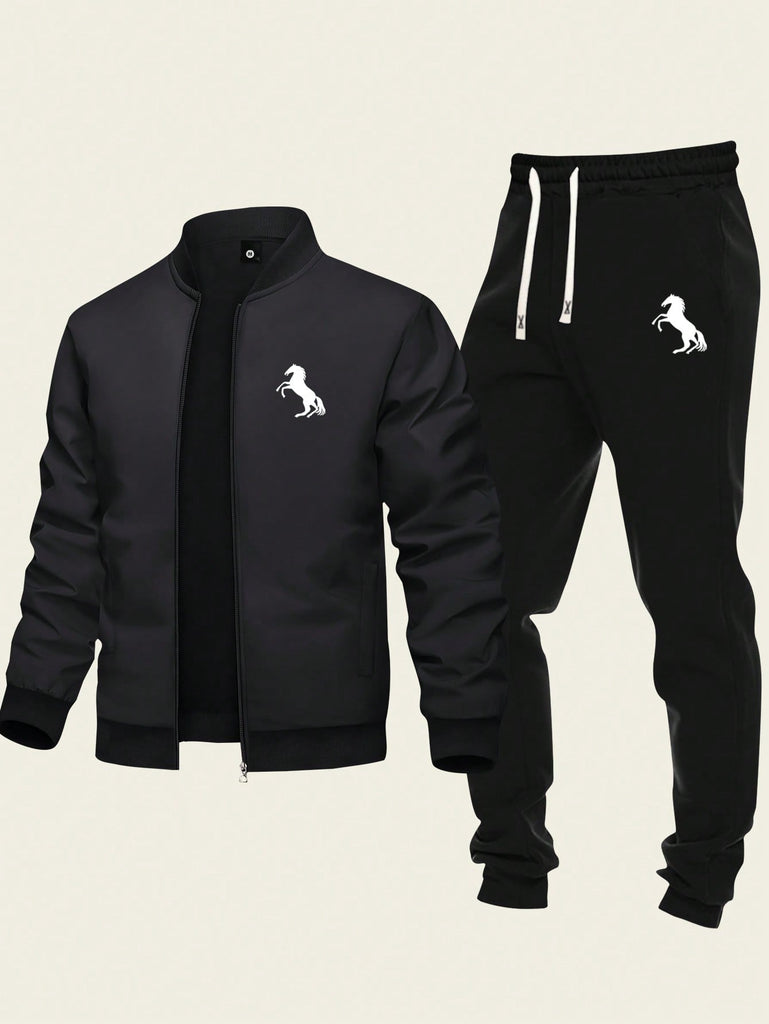 2pcs Men's Casual Set Featuring Zip-Up Jacket With Baseball Collar And Drawstring Pants, Simple Design With Running Horse Print, Suitable For Sports And Everyday Wear