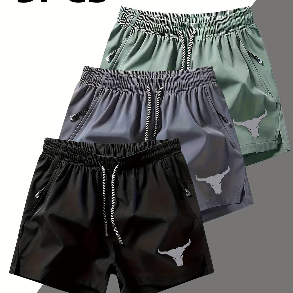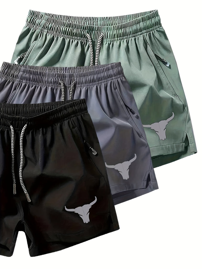 3pcs Men'S Breathable Beach Shorts with Pockets - Fashion Bull Head Print, Lightweight Drawstring Swim & Sports Shorts, Polyester/Elastane Blend, Summer Casual Wear, Functional Pockets | Casual Sportswear | Functional Pockets