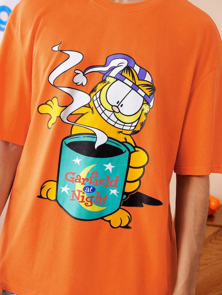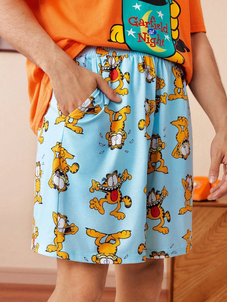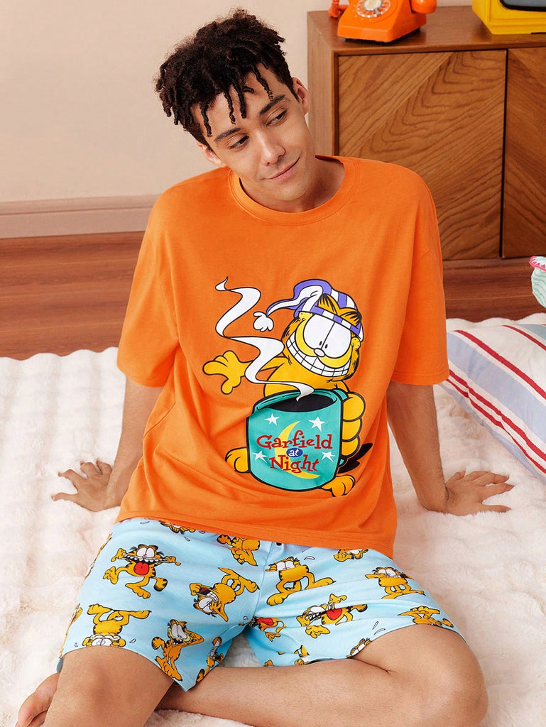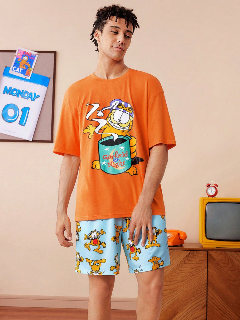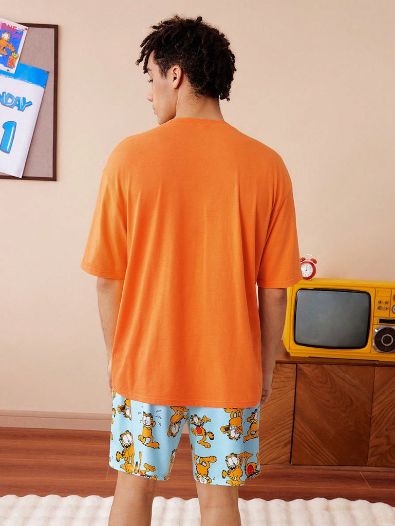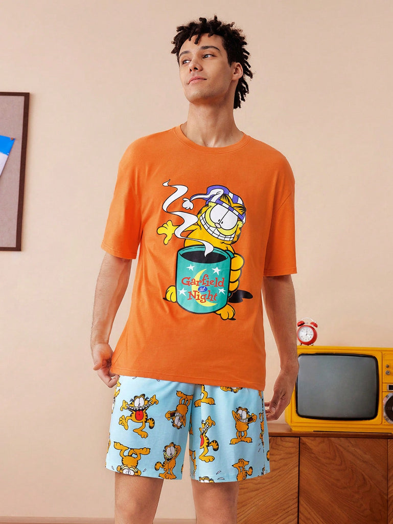 GARFIELD X SHEIN Funny Cartoon Pattern Homewear American Style Boys Loose Crew Neck T-Shirt, Orange Top And Blue Shorts, Men Loungewear Set