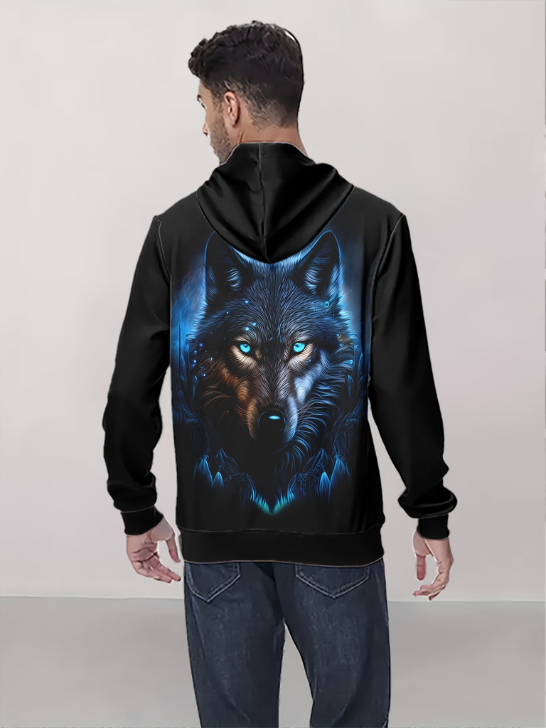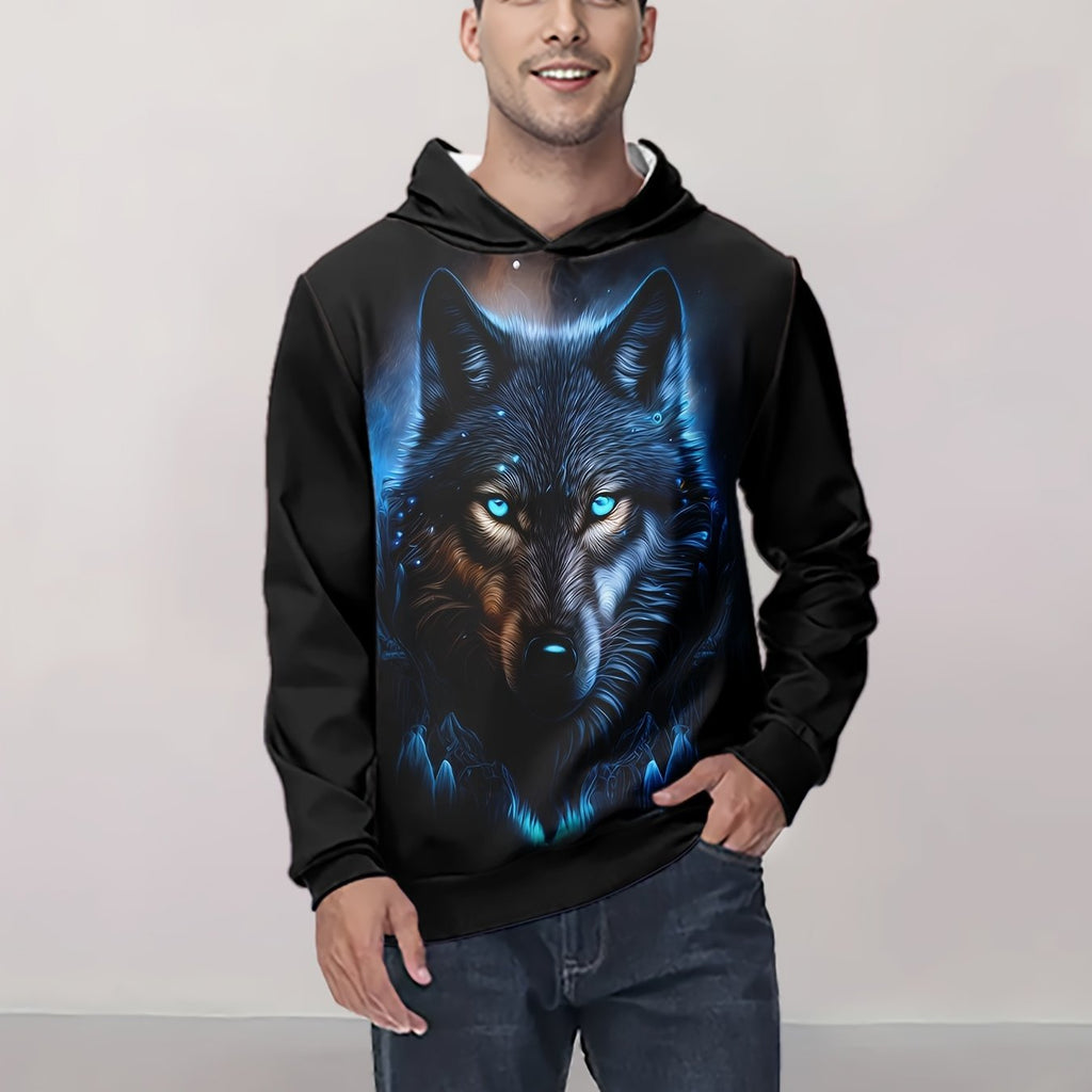 Men'S 3D Wolf Print Hoodie, Casual Long Sleeve Polyester Knit Fabric, Regular Fit Hooded Top for Spring/Fall, Slight Stretch, 200gsm - Animal Pattern Hooded Sweatshirt
