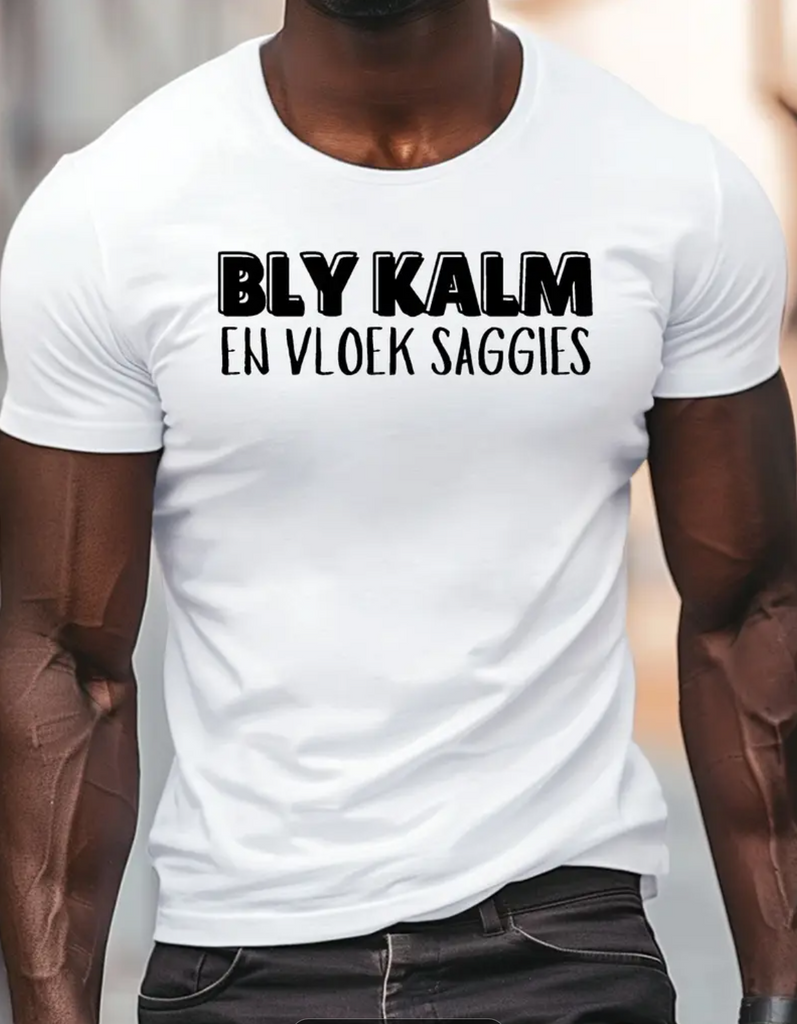 Men'S Funny Afrikaans Print T-Shirt - "Bly Kalm en Vloek Saggies" Humorous Design, Casual Crew Neck Short Sleeve Tee, Lightweight Summer Top, Black, Comfortable Fit for Casual Attire, Funny T Shirts