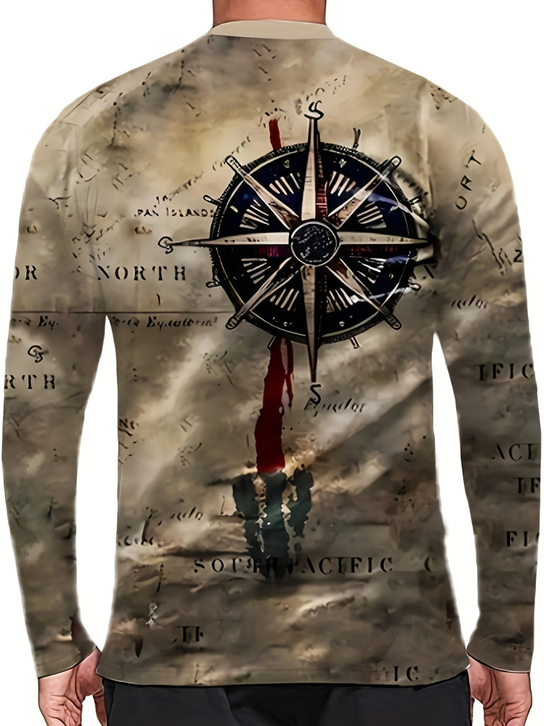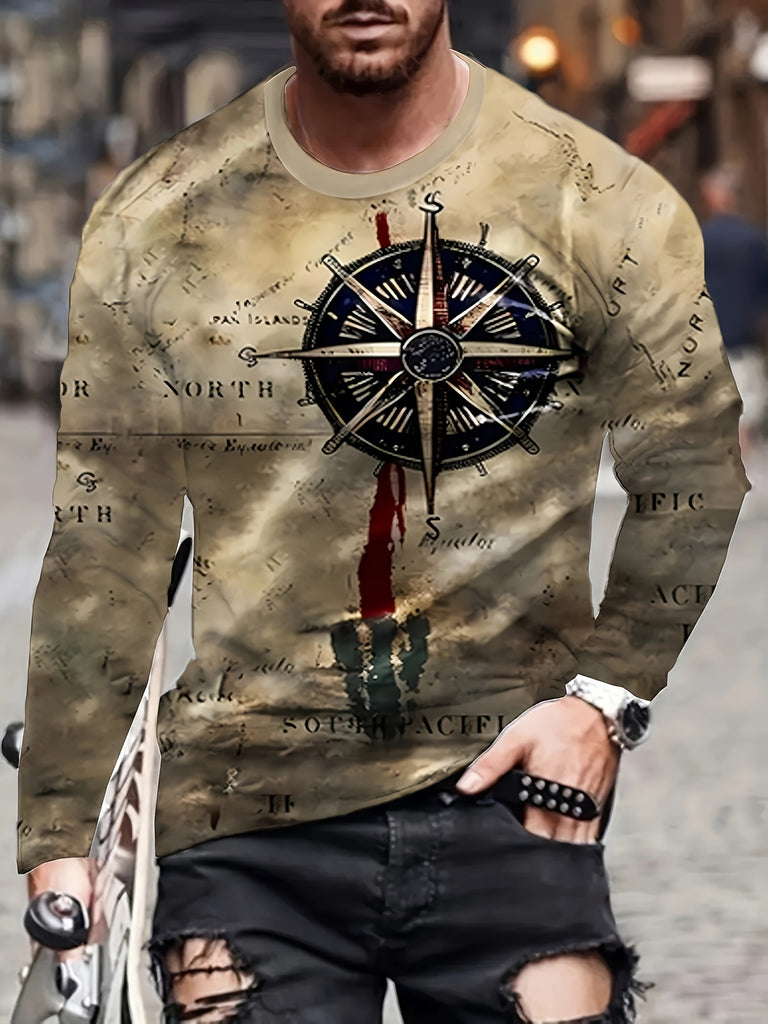 Men's Spring and Autumn Long Sleeve Shirt with Unique Compass 3D Pattern Print, Casual Outdoor Unique Long Sleeve Round Neck T-shirt