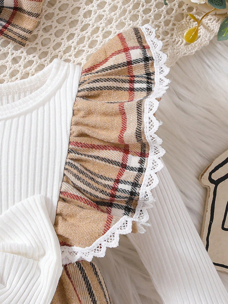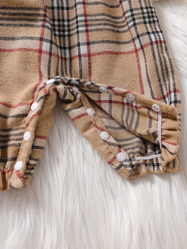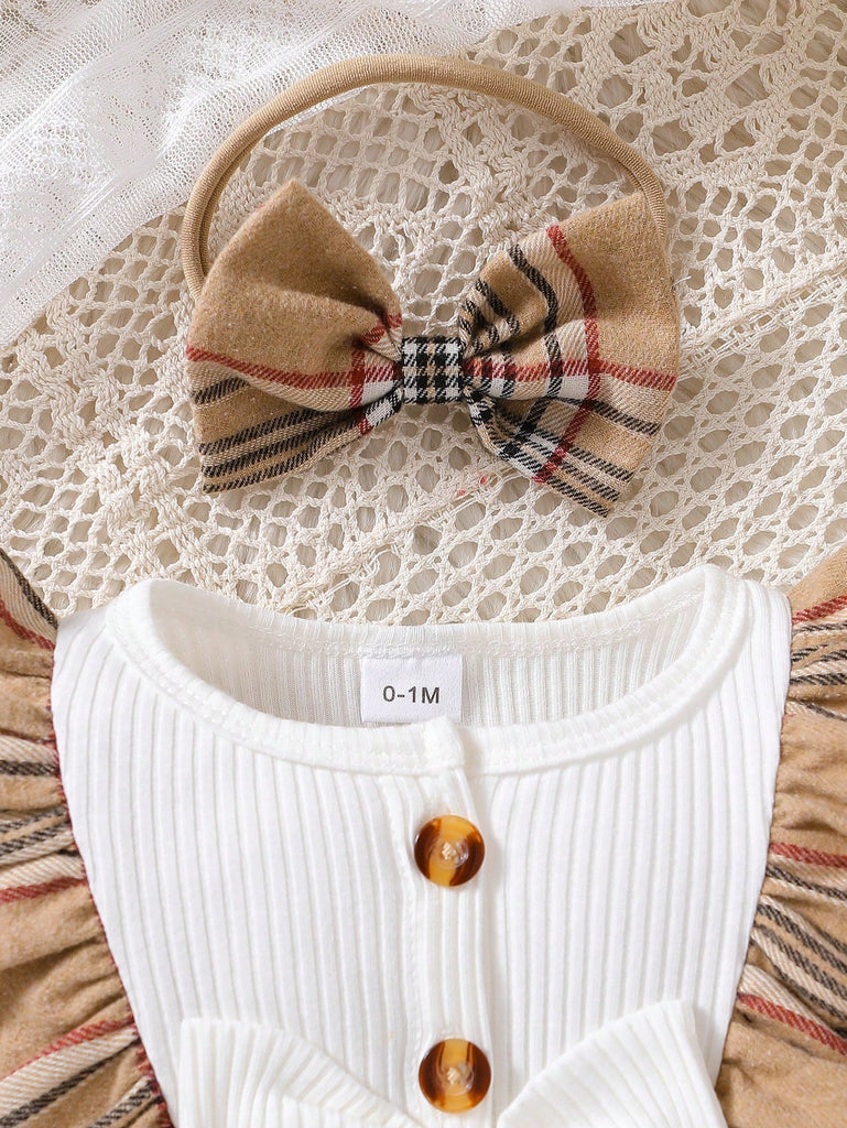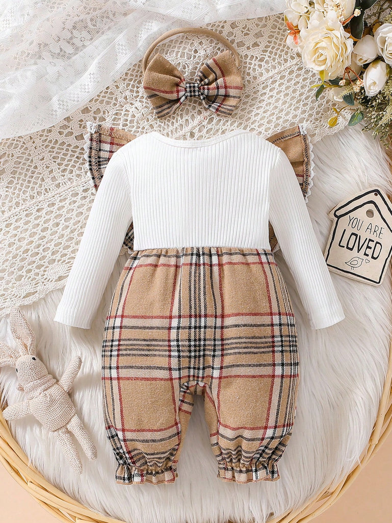 1pc Baby Girls' Casual Round Neck Plaid Long Sleeve Jumpsuit With Headband, Spring/Autumn