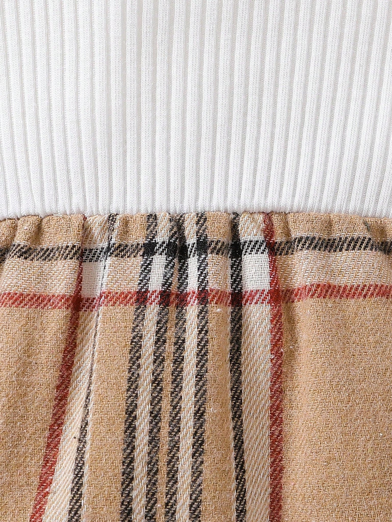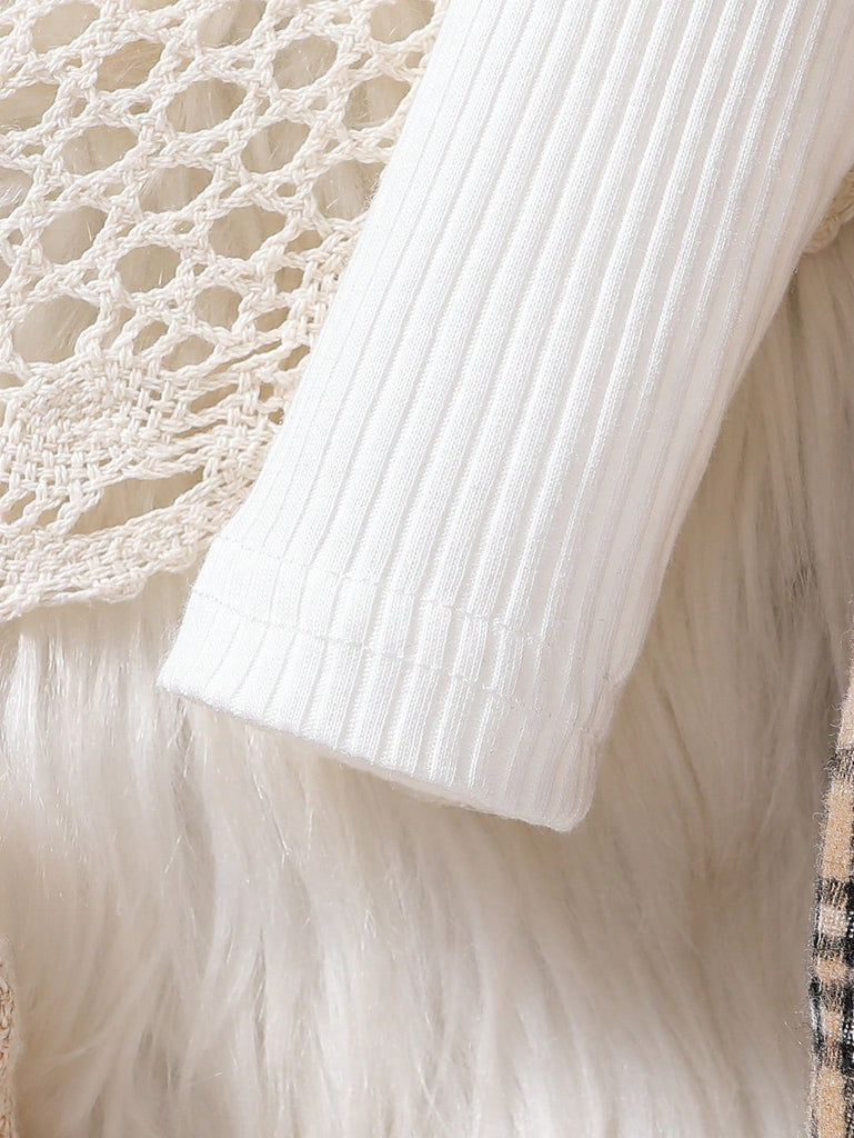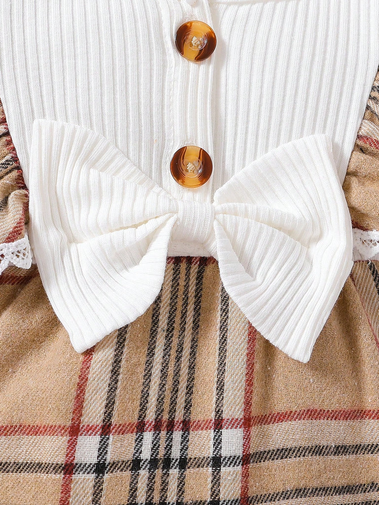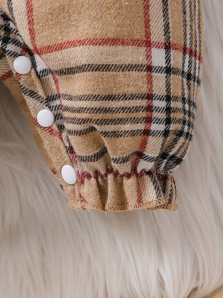 1pc Baby Girls' Casual Round Neck Plaid Long Sleeve Jumpsuit With Headband, Spring/Autumn