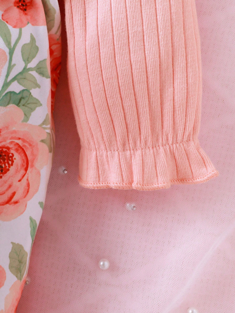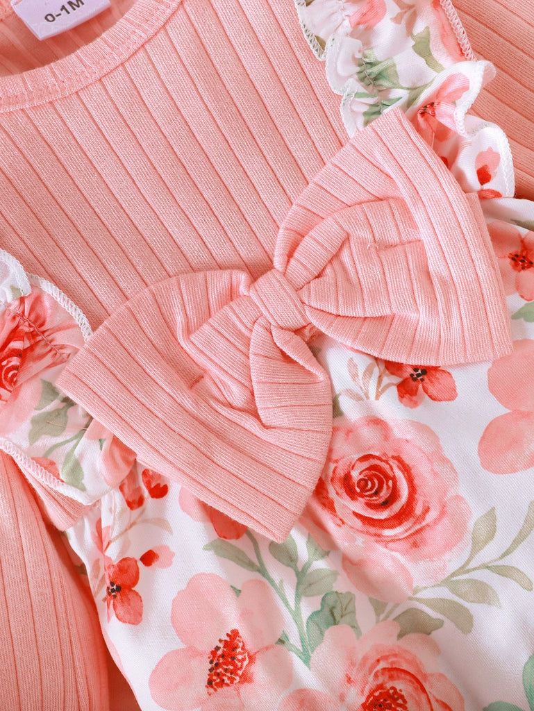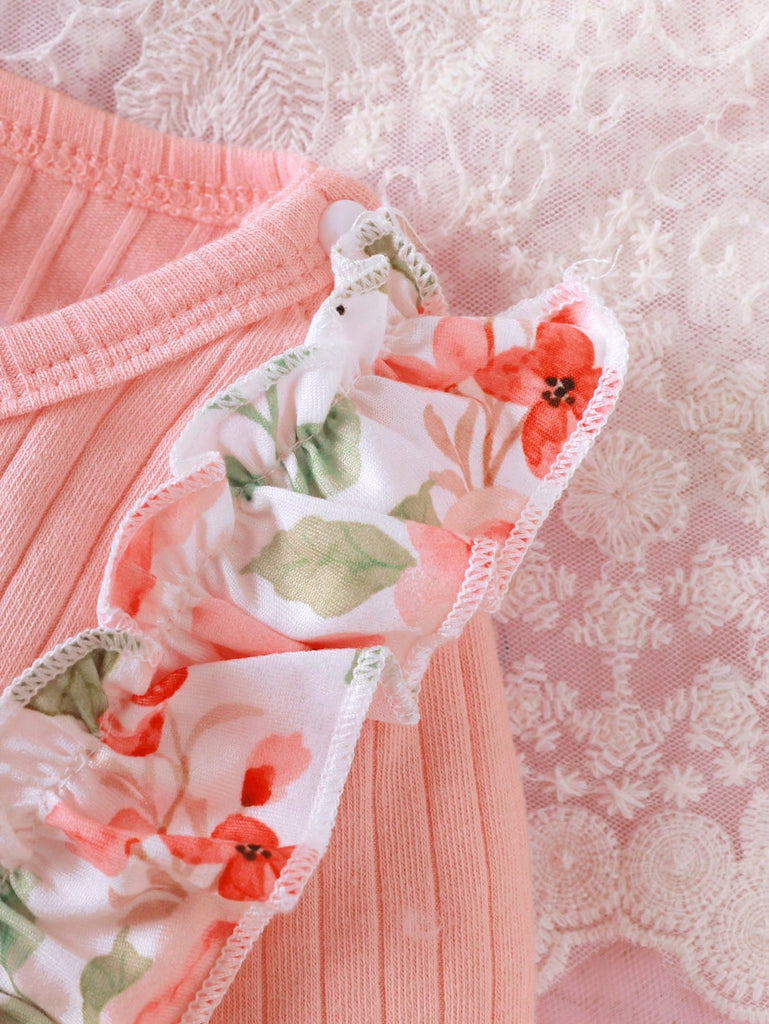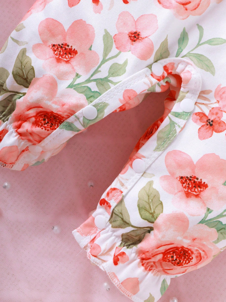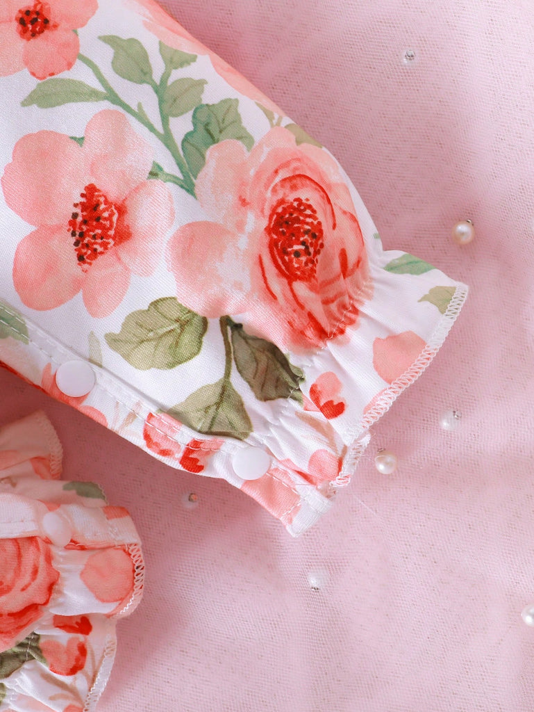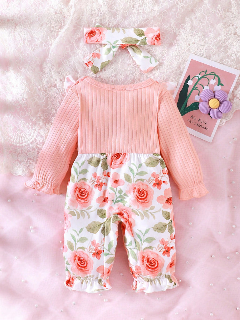 2pcs Baby Girls' Casual Floral Jumpsuit With Ruffle Trimmed Long Sleeves And Headband, Spring & Autumn