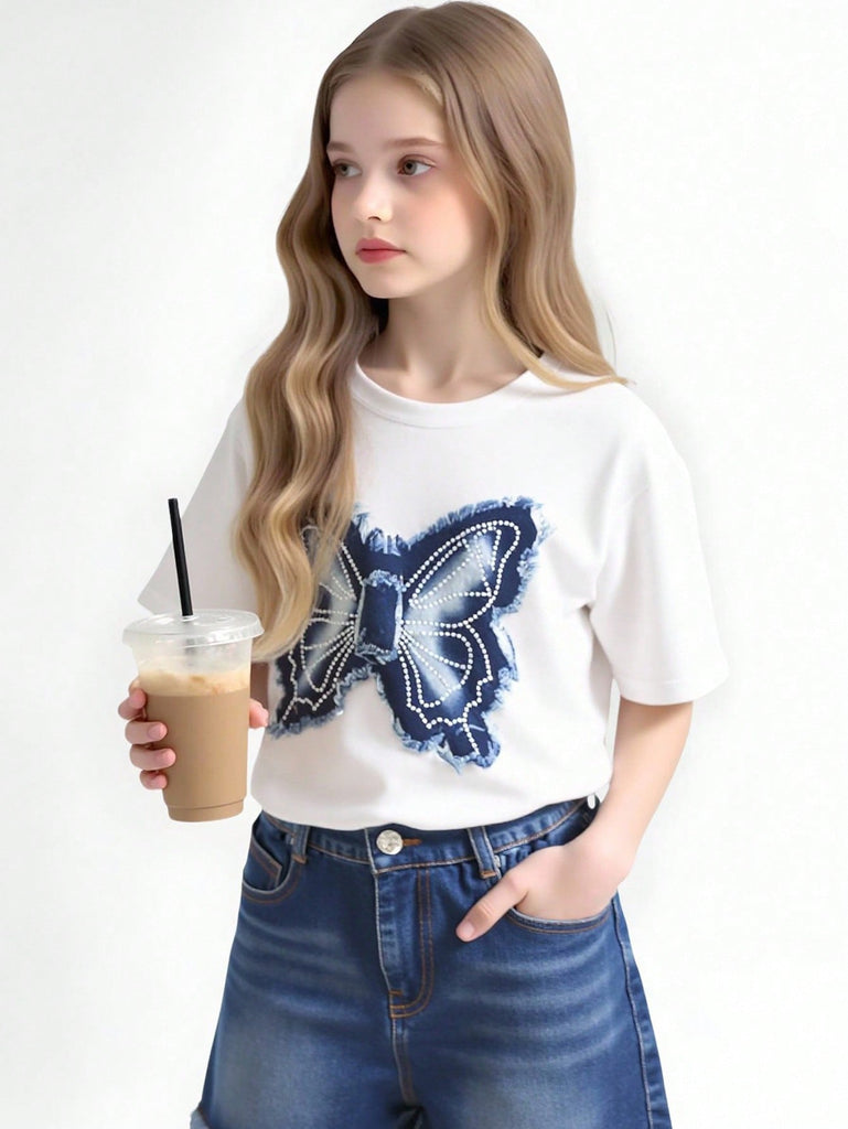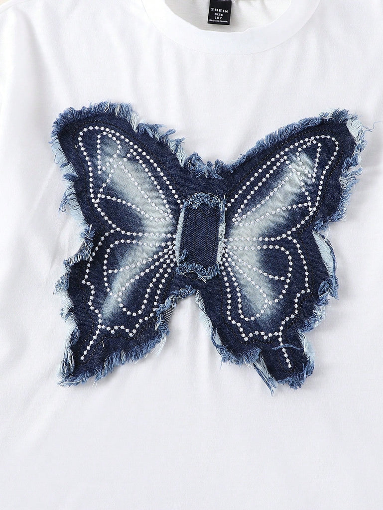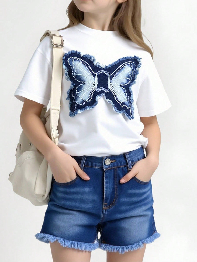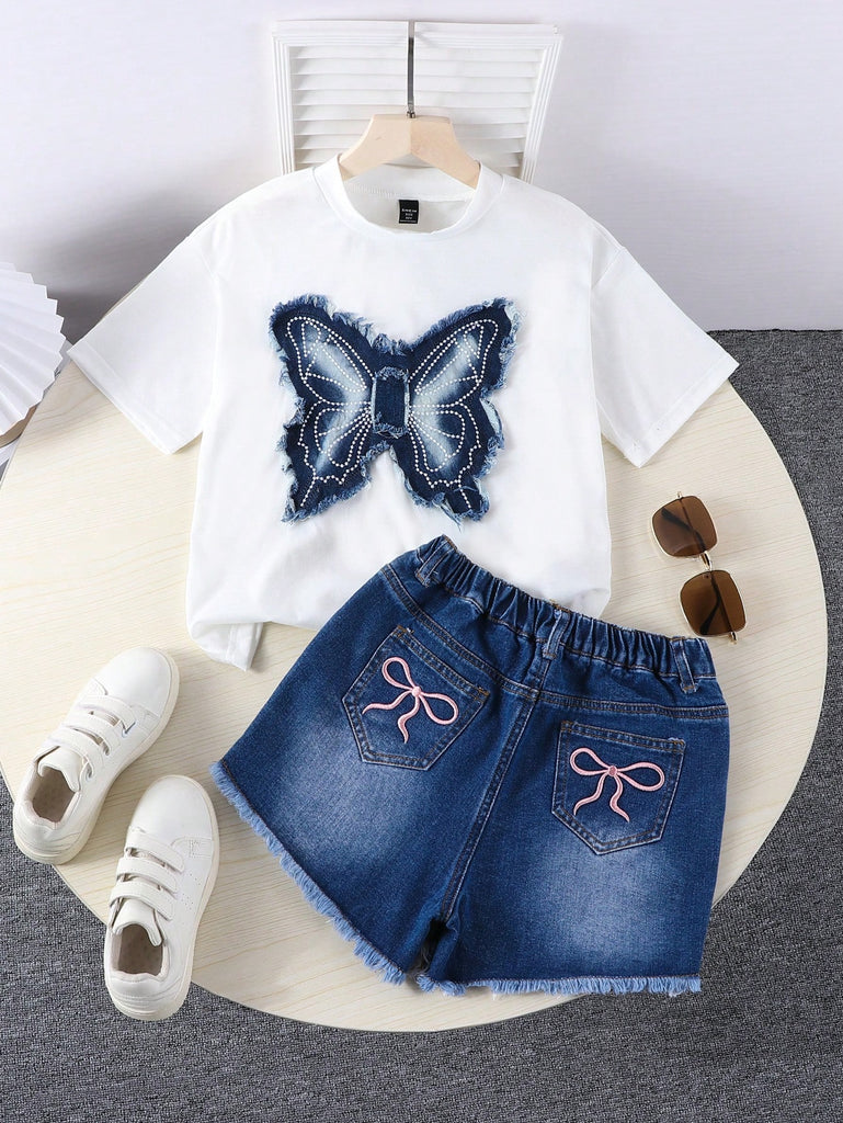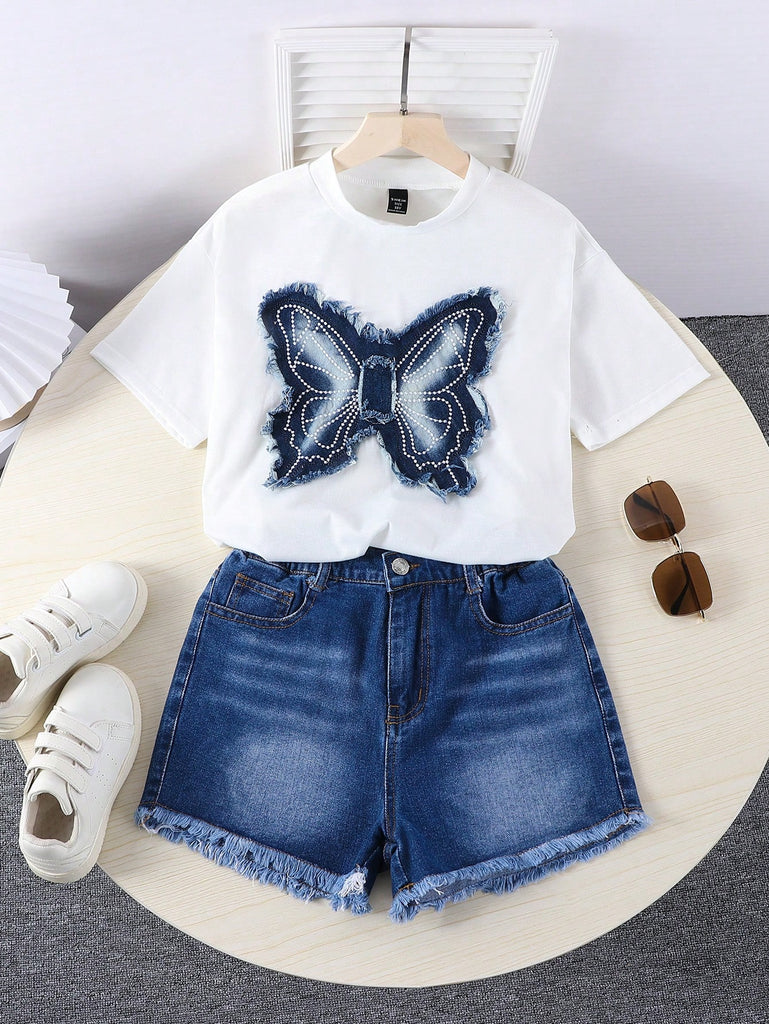 2pcs Girls Butterfly & Denim Patch Short Sleeve T-Shirt And Embroidered Denim Shorts Set, Summer Young Girls Sets Summer Young Girls Sets Young Girls Sets Winter Sets For Girls Clothes Outfit For Girls Teen Girls Sets