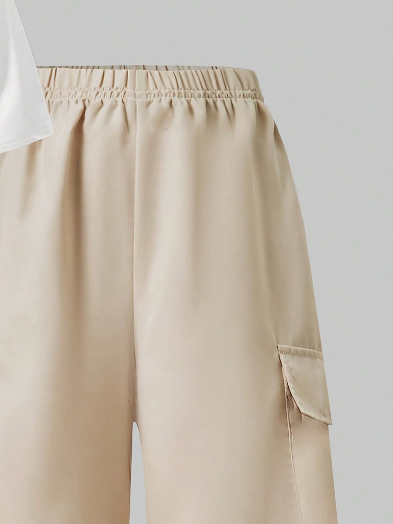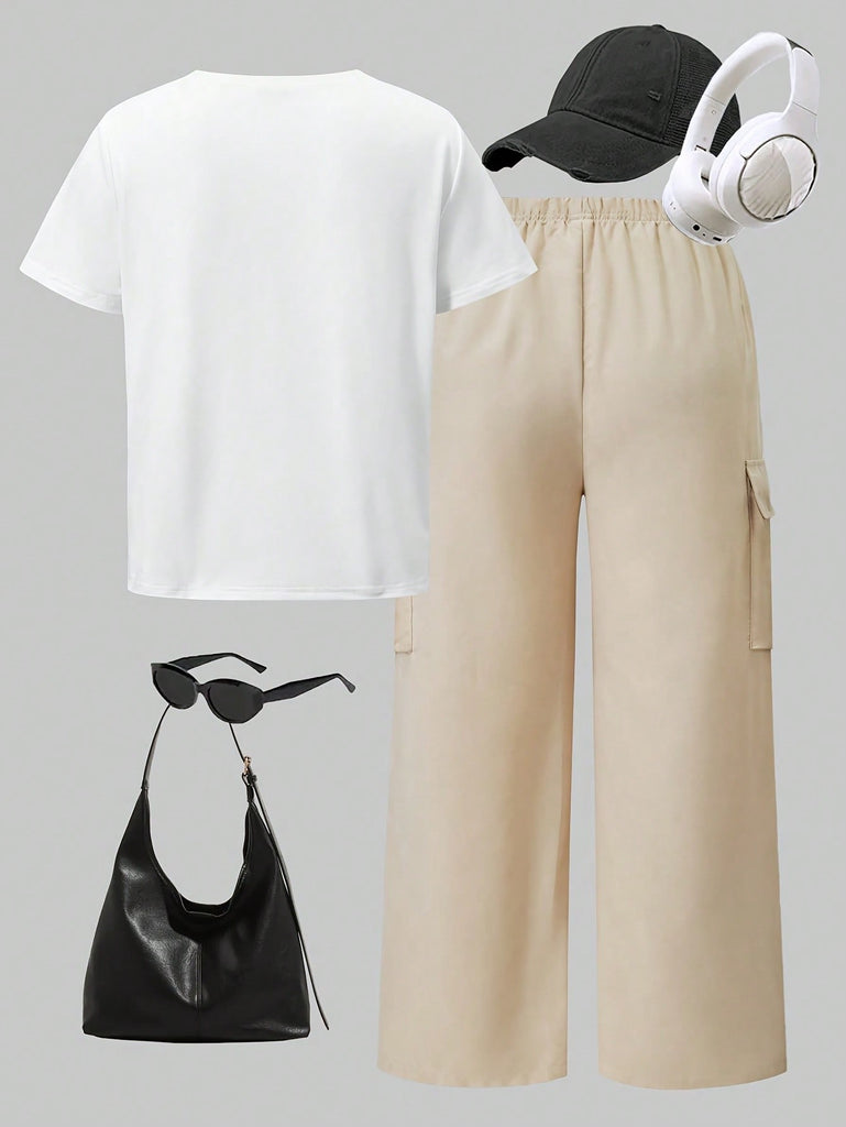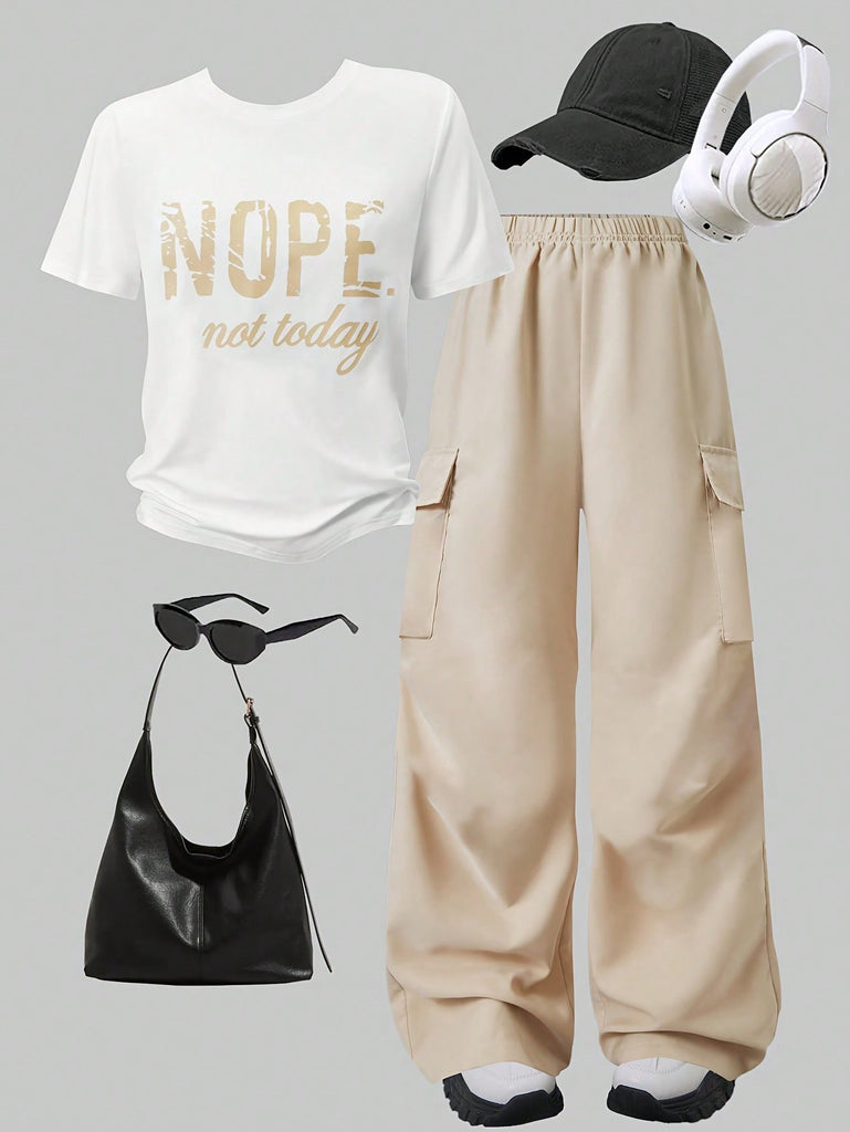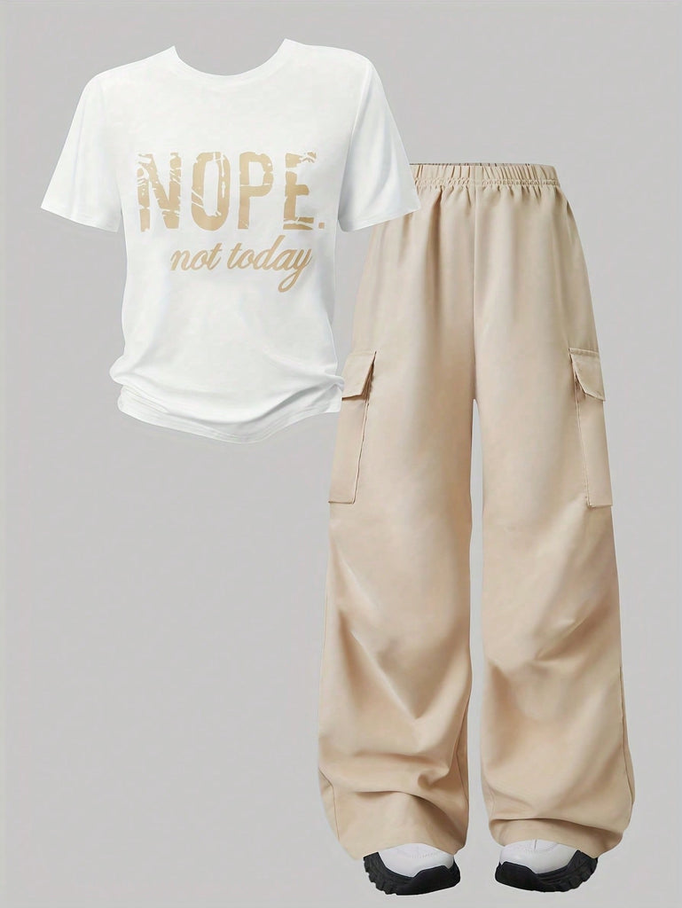 New Casual Streetwear Youth Set, Round Neck Letter Print T-Shirt Cargo Pants