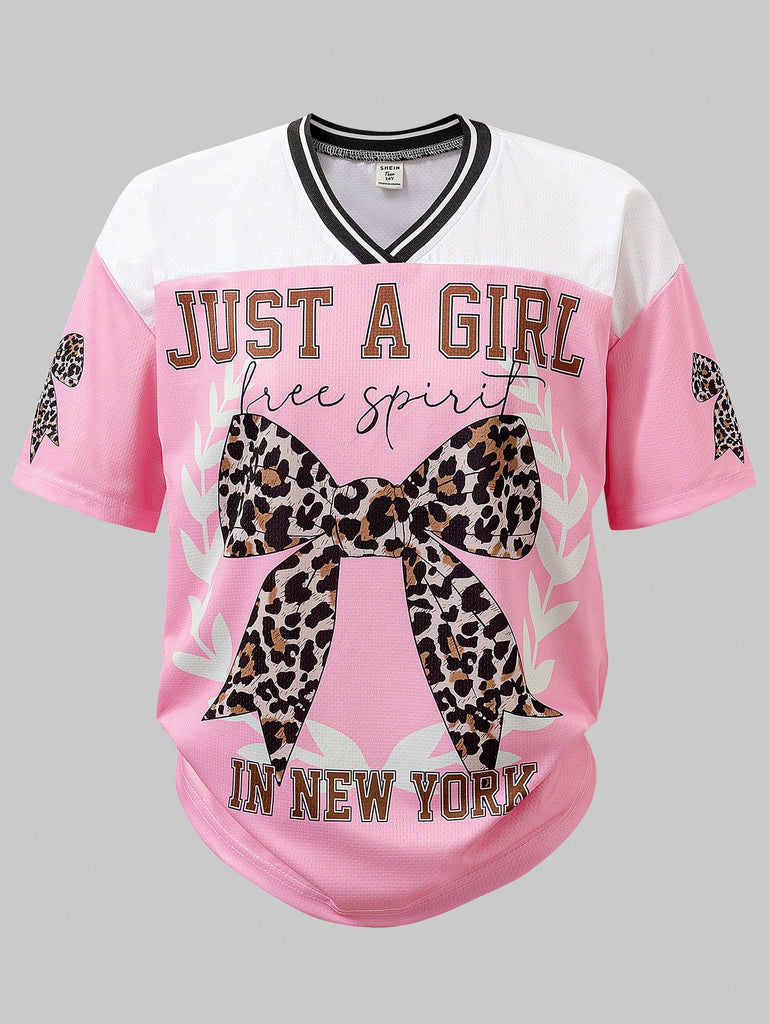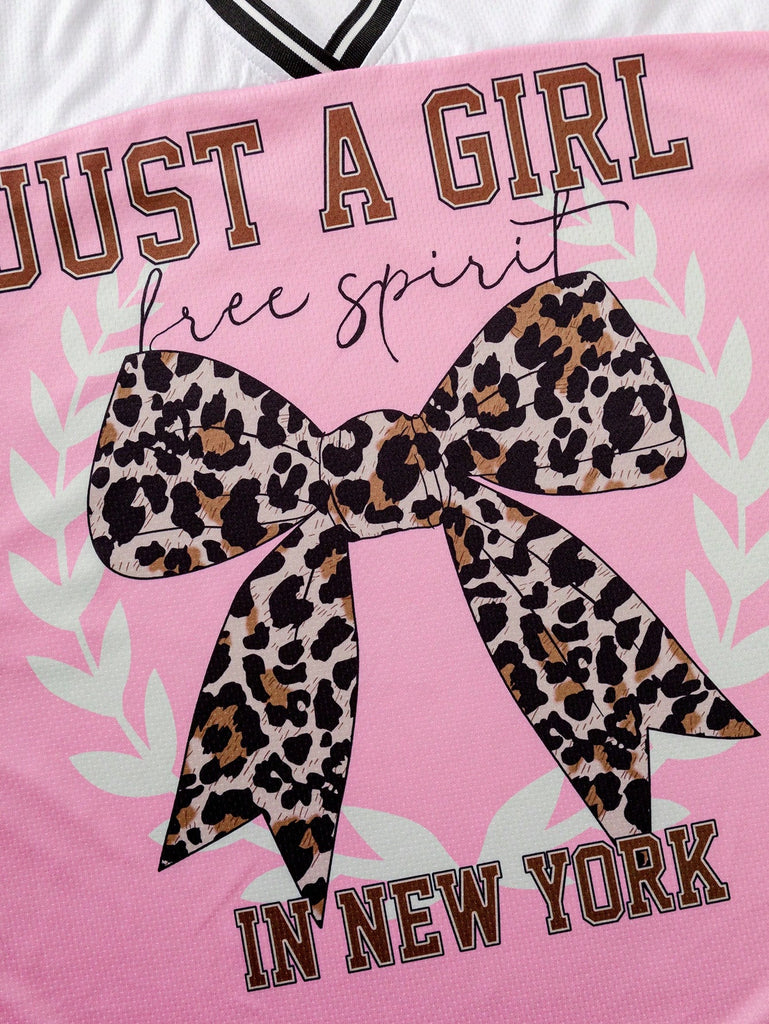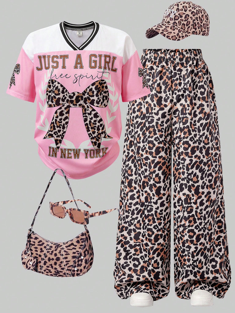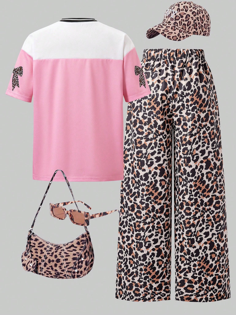 SHEIN 2 Pcs/Set Teen Girls Casual Sports Streetwear, Pink Sports Sweatshirt With Bow Decor, Loose Fit Leopard Print Straight Leg Pants, Versatile And Practical