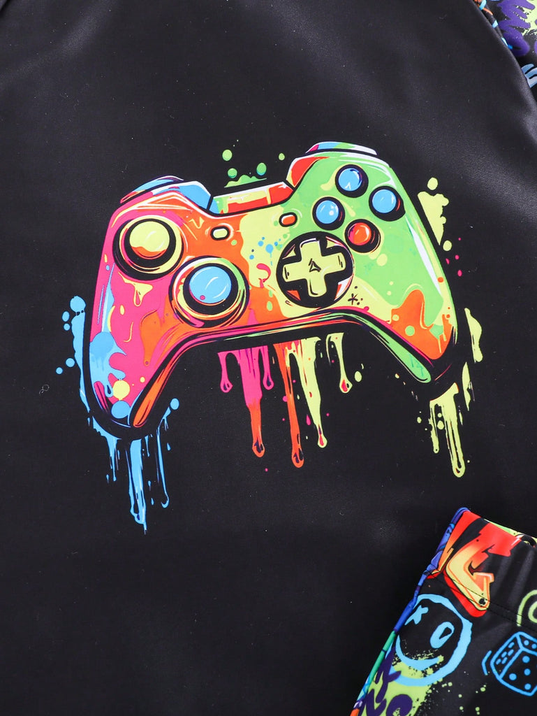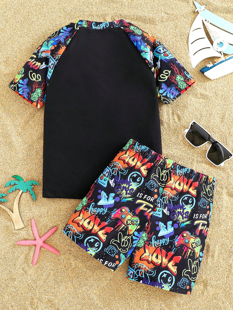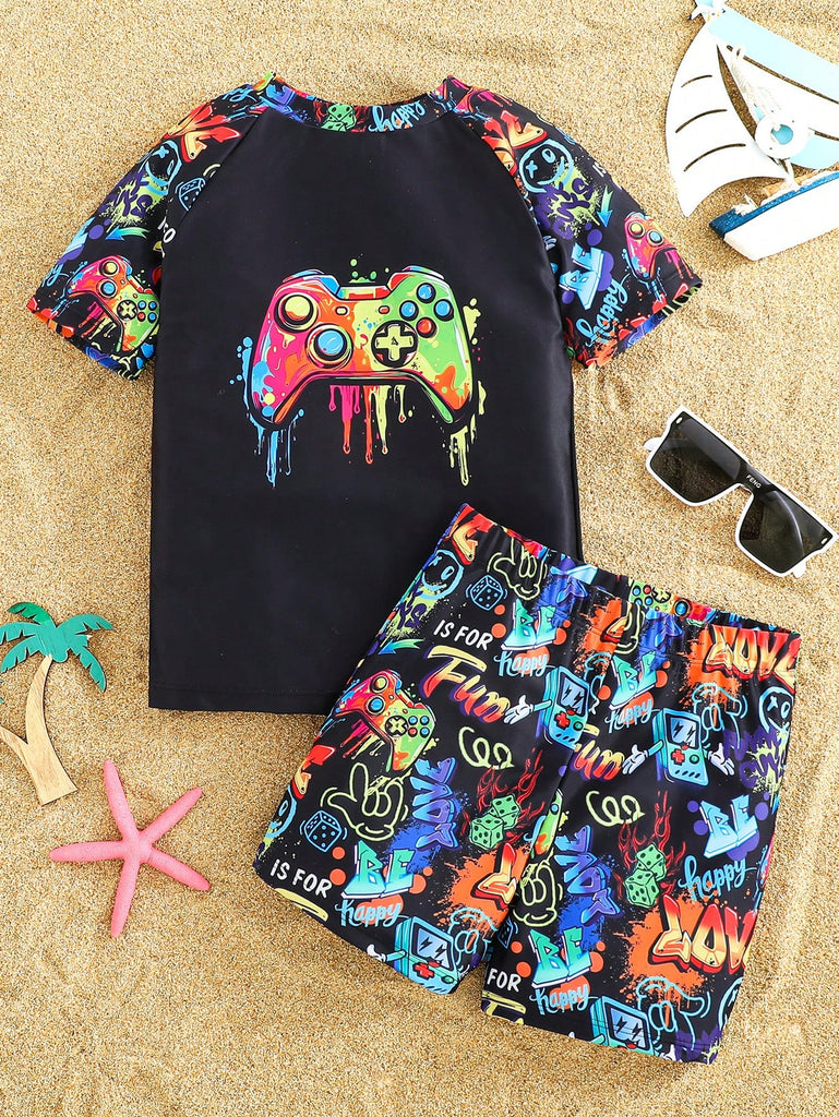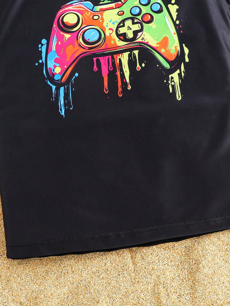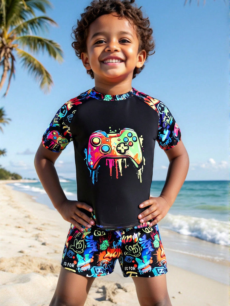 SHEIN 2pcs Kids/Tween Boys Casual Versatile Printed Round Neck Short Sleeve Top And Printed Swim Trunks Swimsuit Set