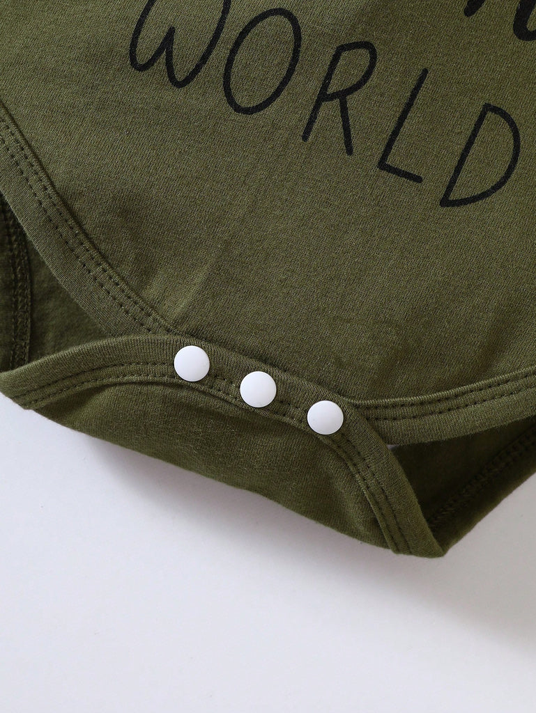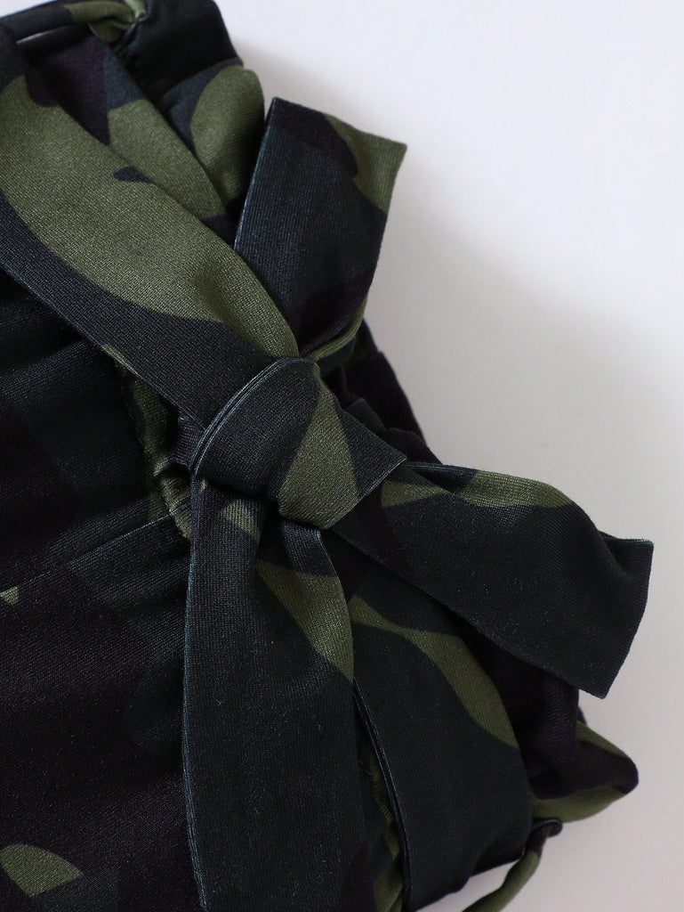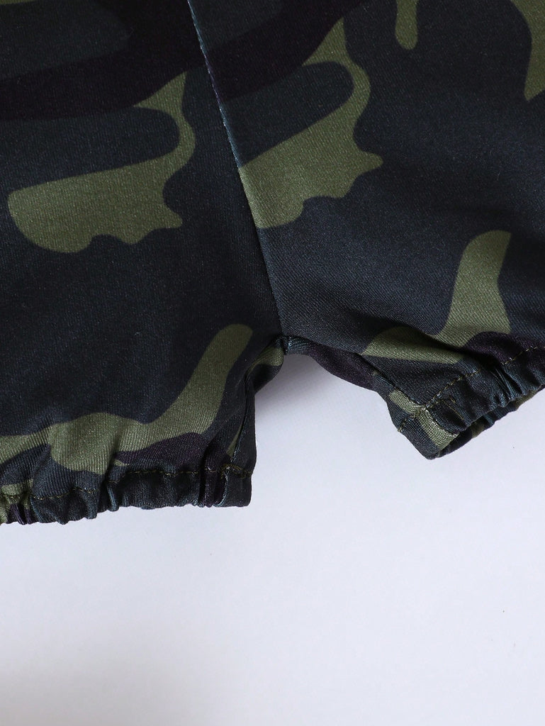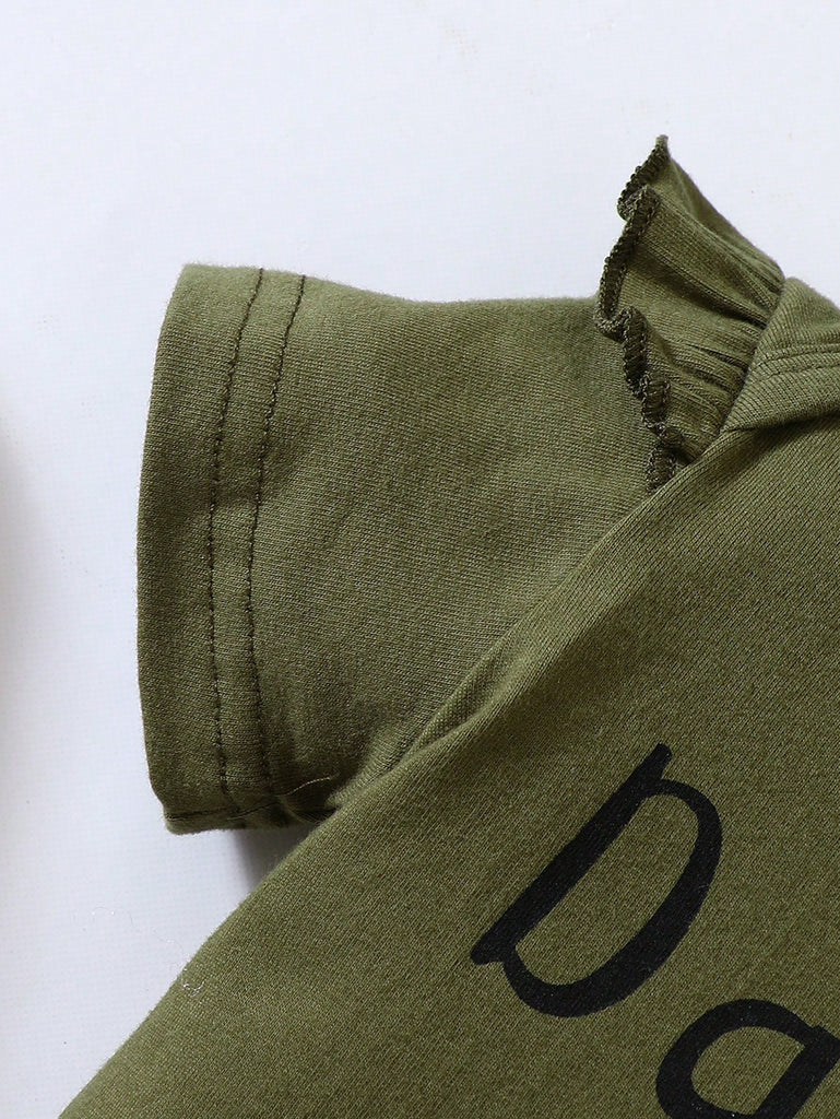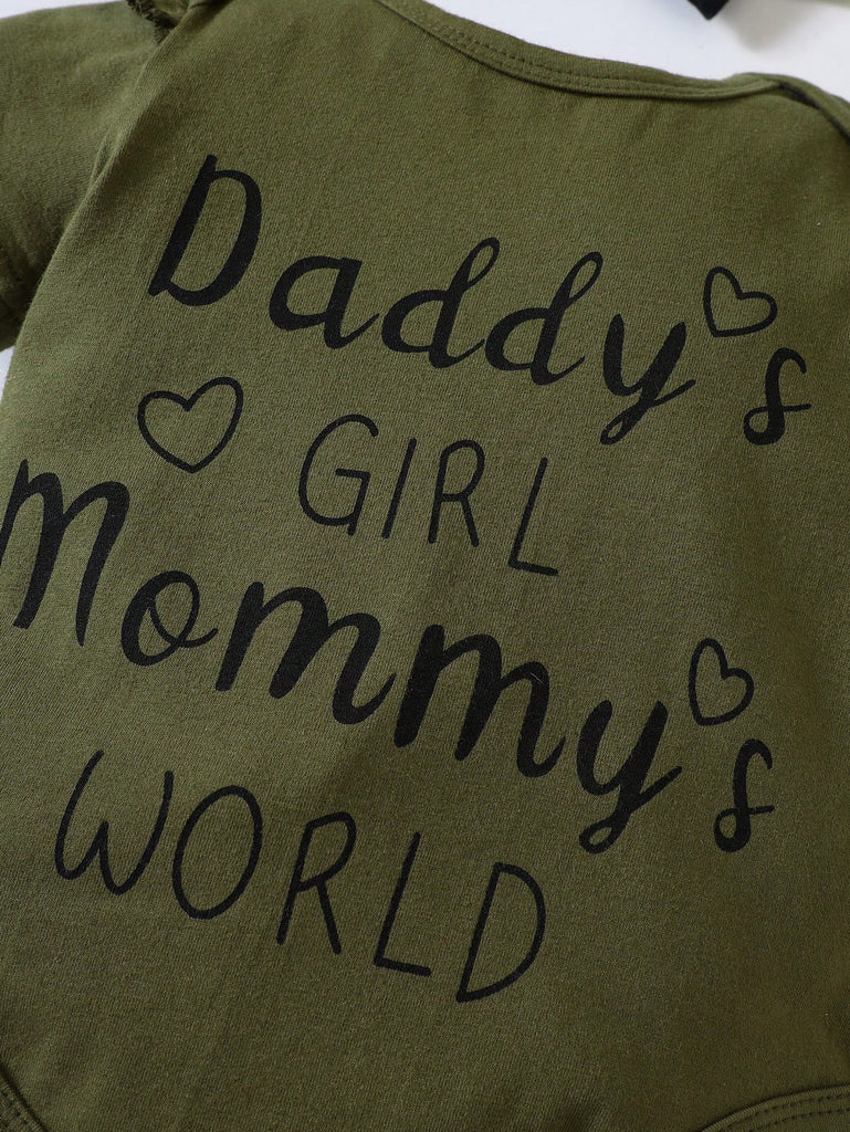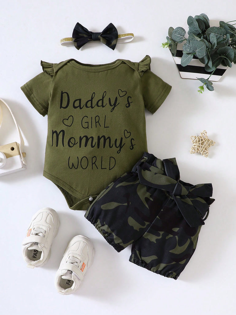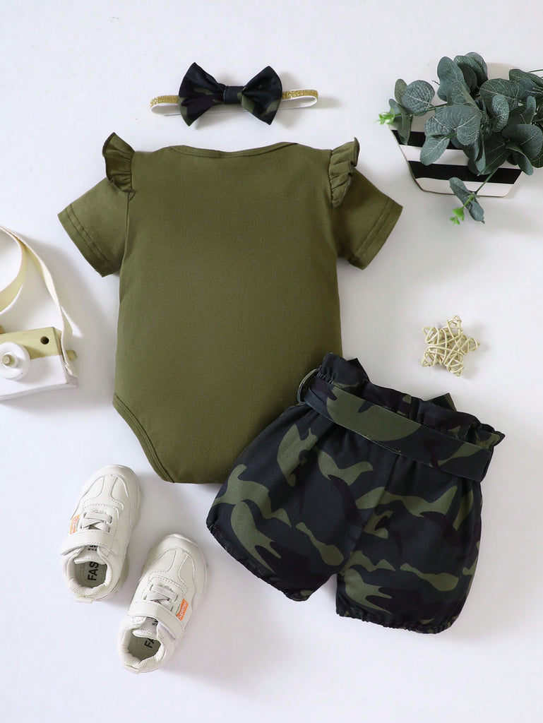 SHEIN Baby Girl Slogan Graphic Ruffle Trim Bodysuit & Camo Print Shorts & Headband