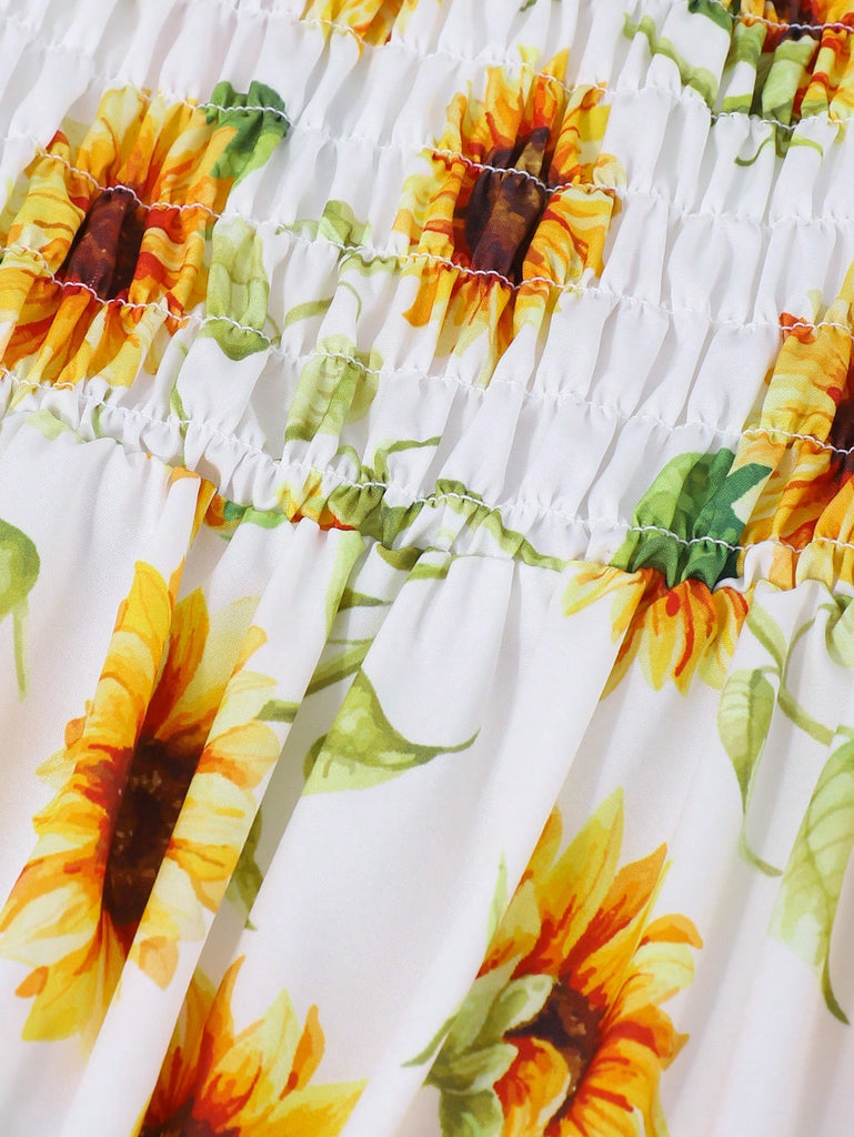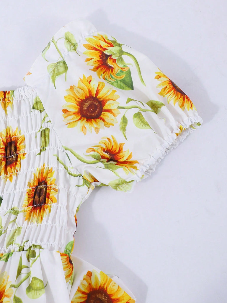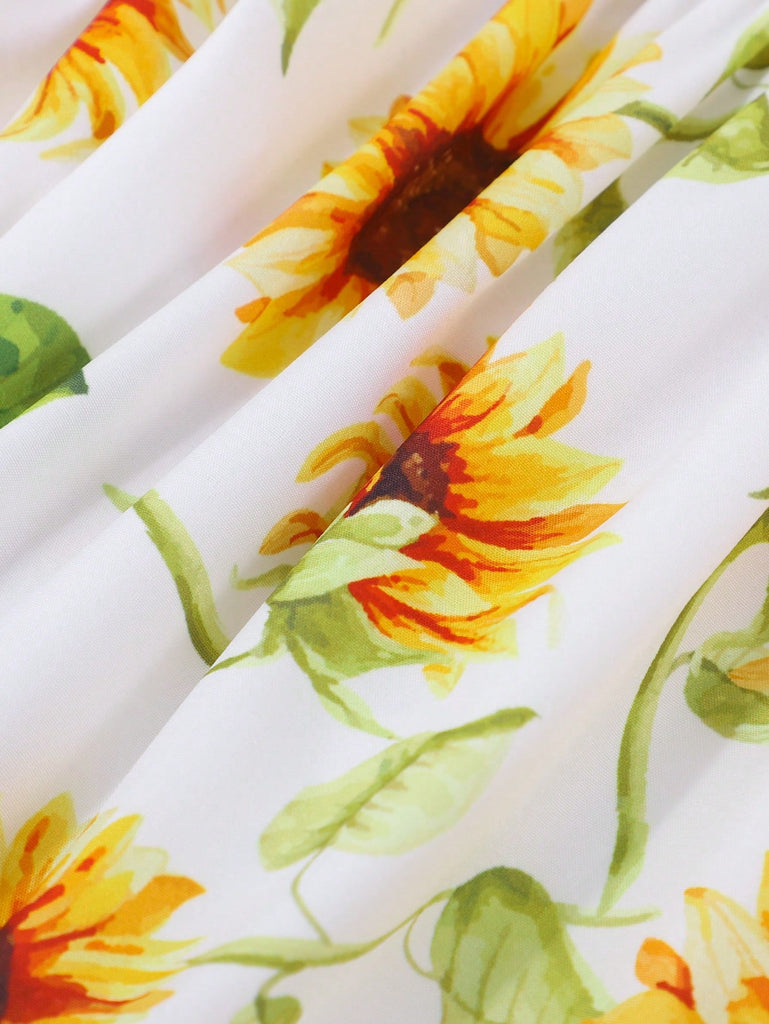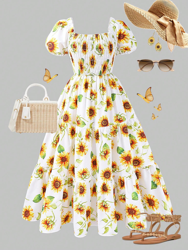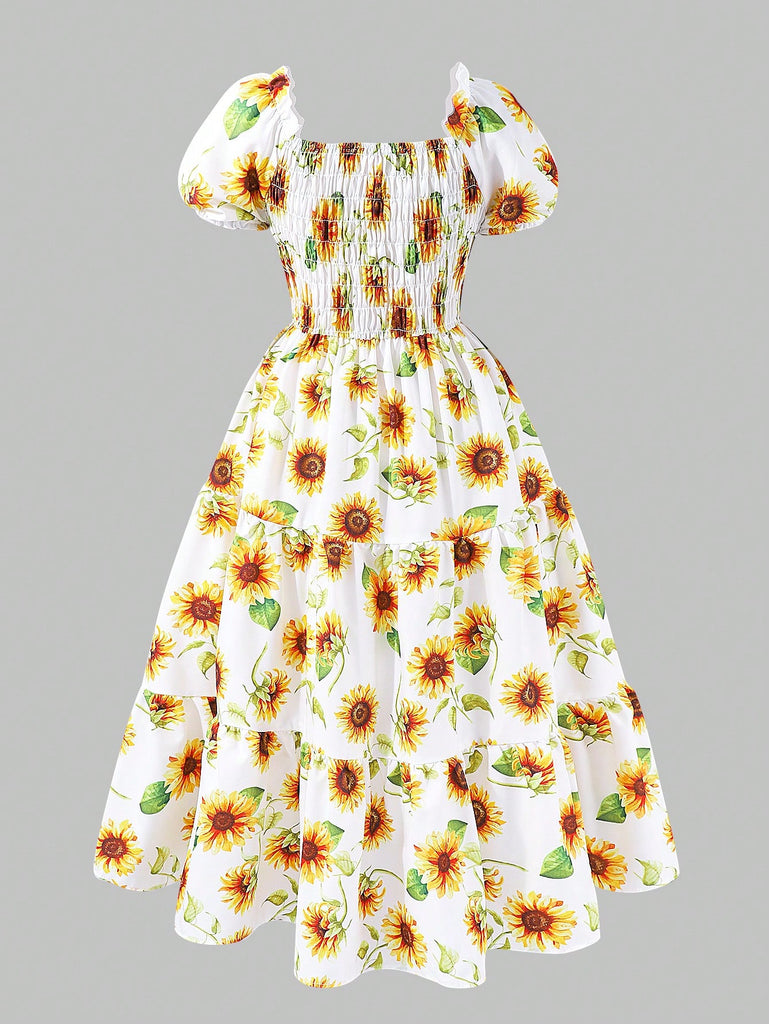 Teen Girl Vacation Holiday Sunflower Print Square Neck A-Line Dress, Spring/Summer,Holiday,Summer,Travel