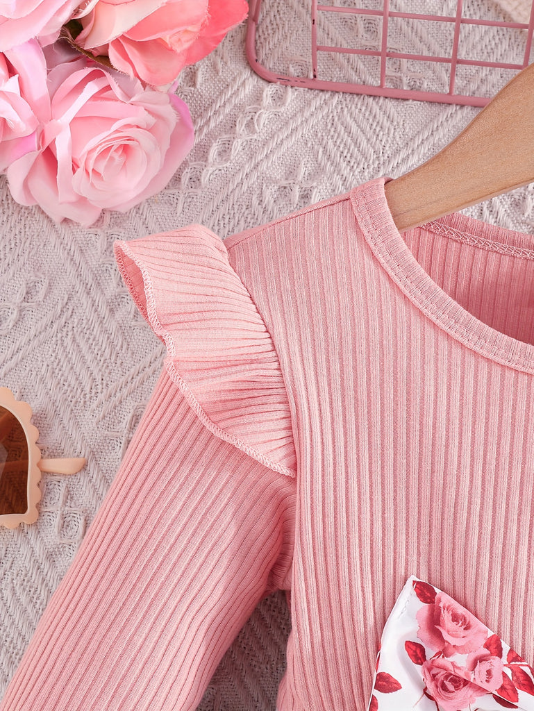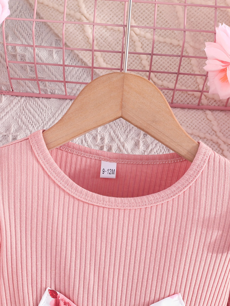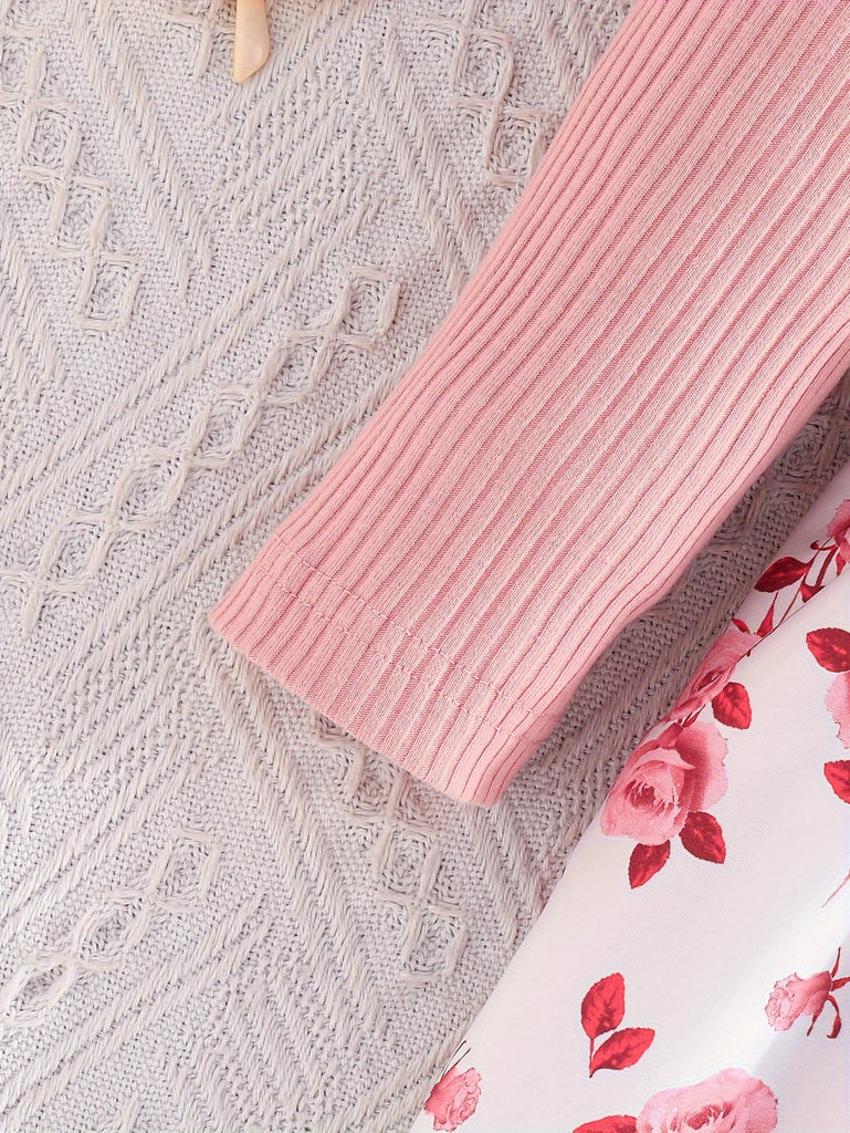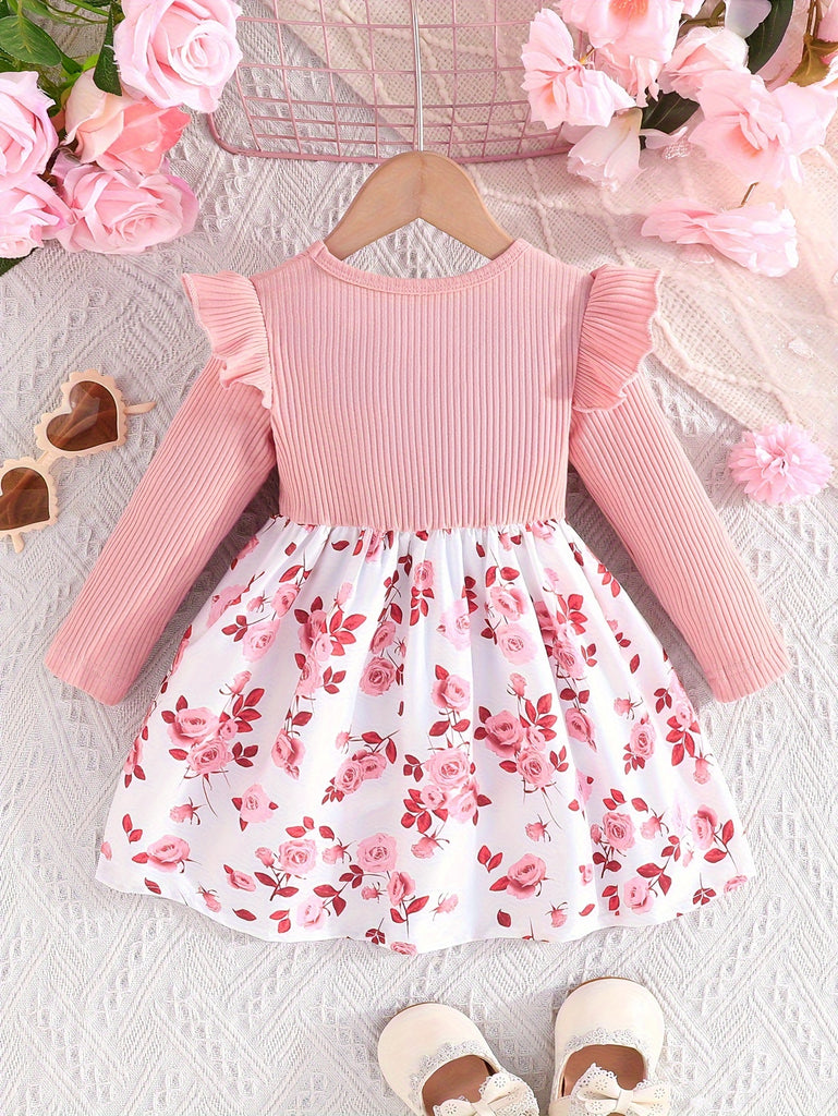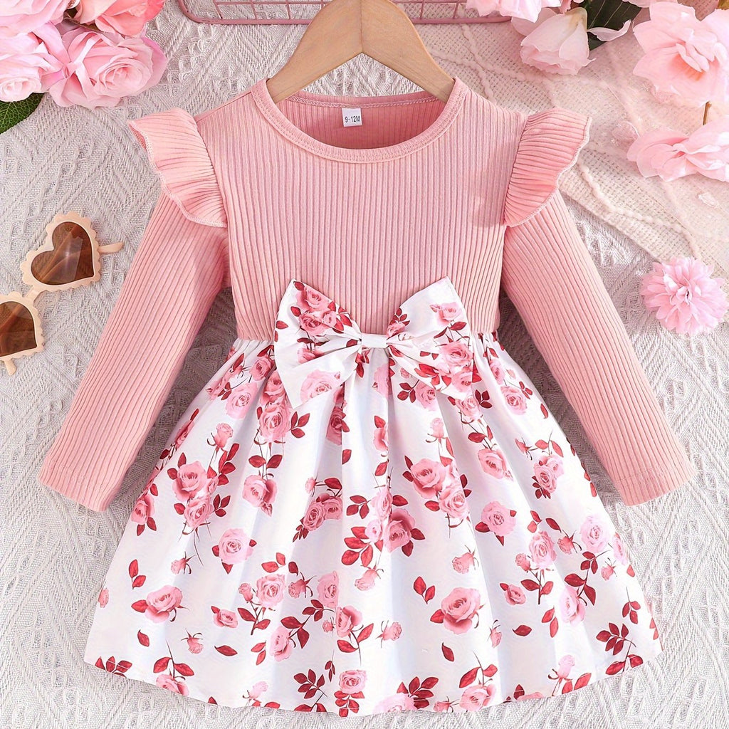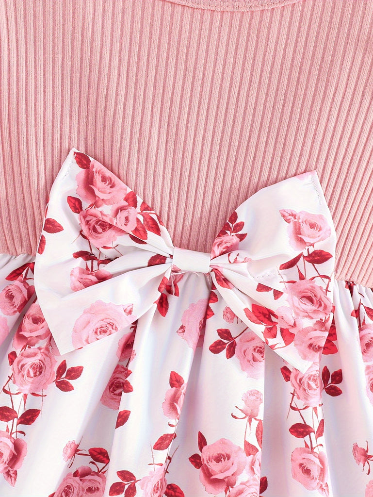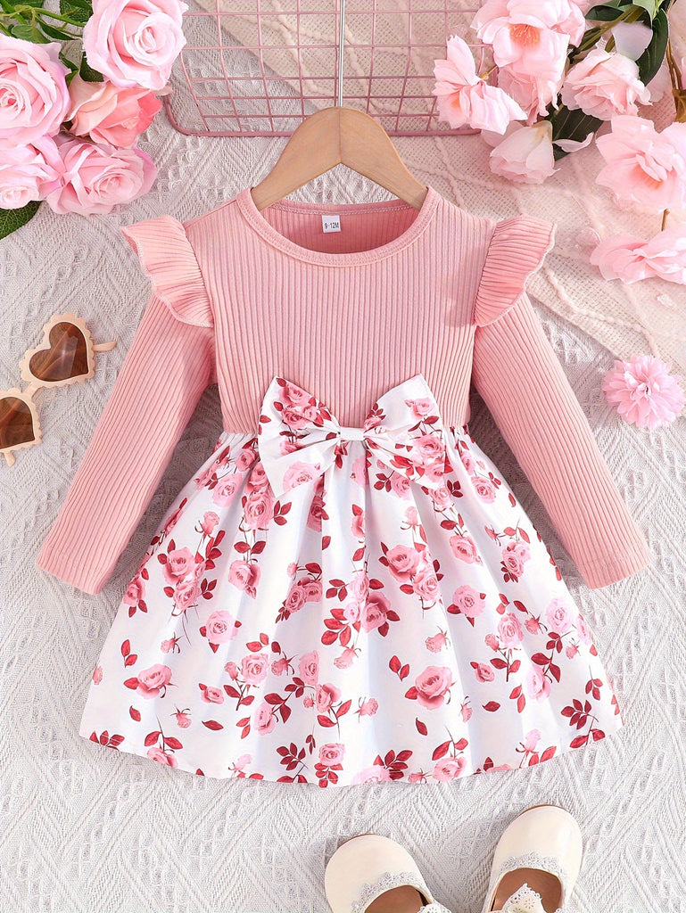 Toddler Rib Knit Cotton Blend Long-Sleeve Dress with Floral Print and Bow Detail, Cute Stretch Fit Flared Hem Playwear for Spring/Fall