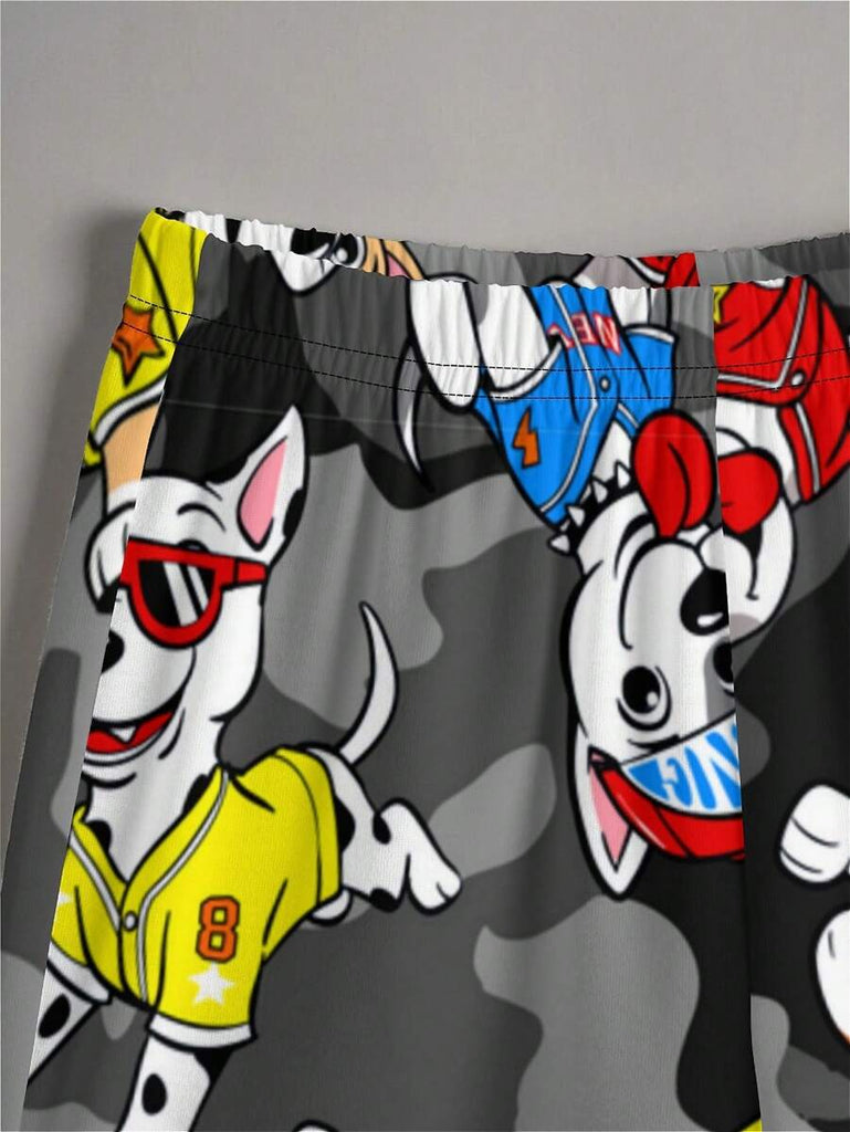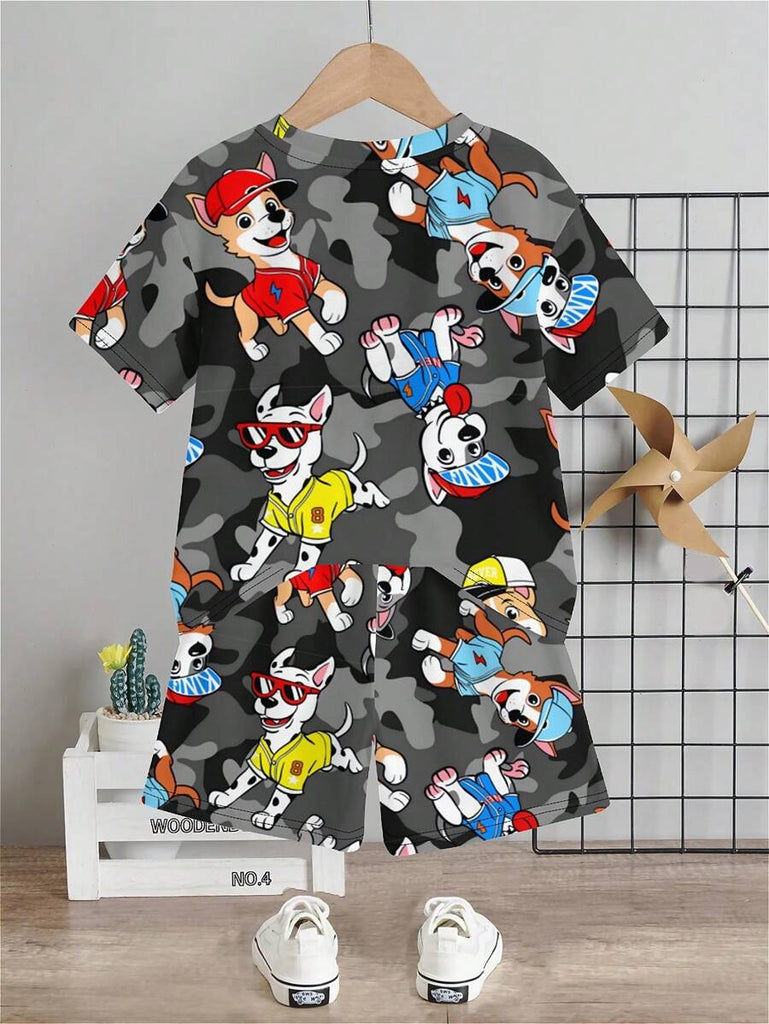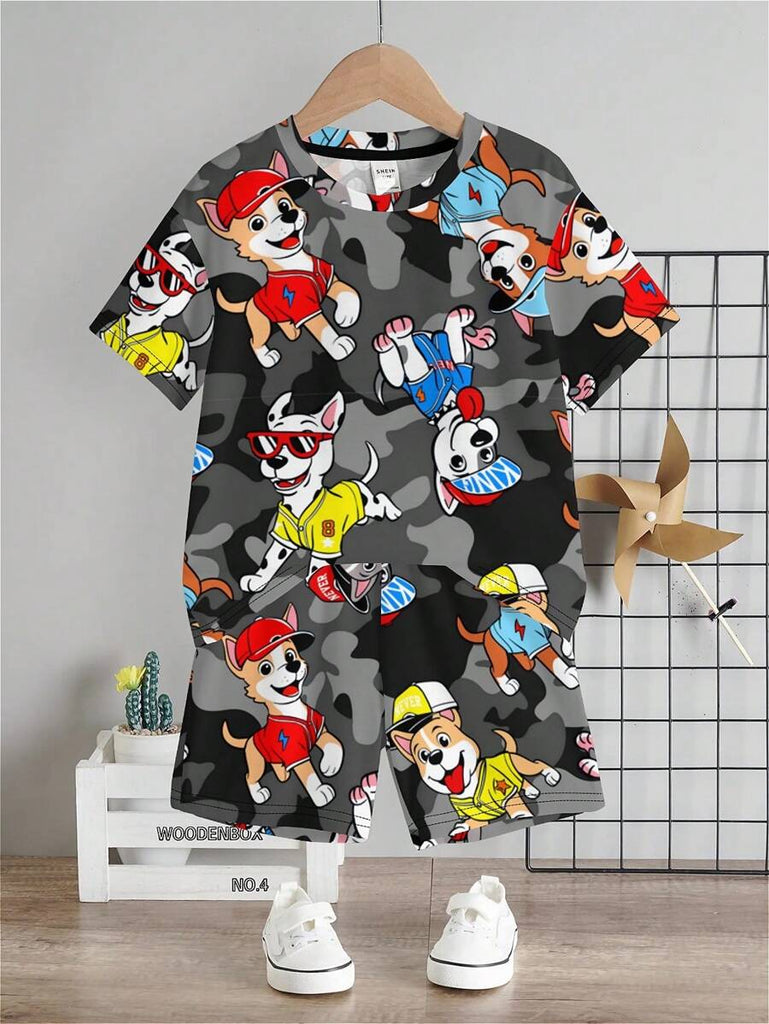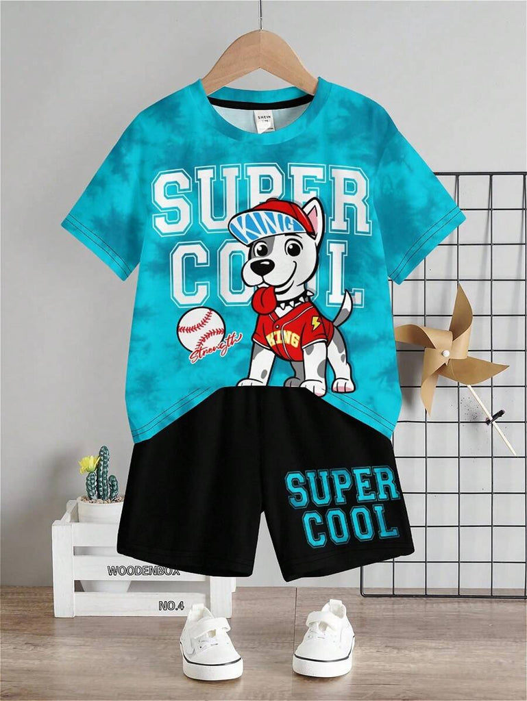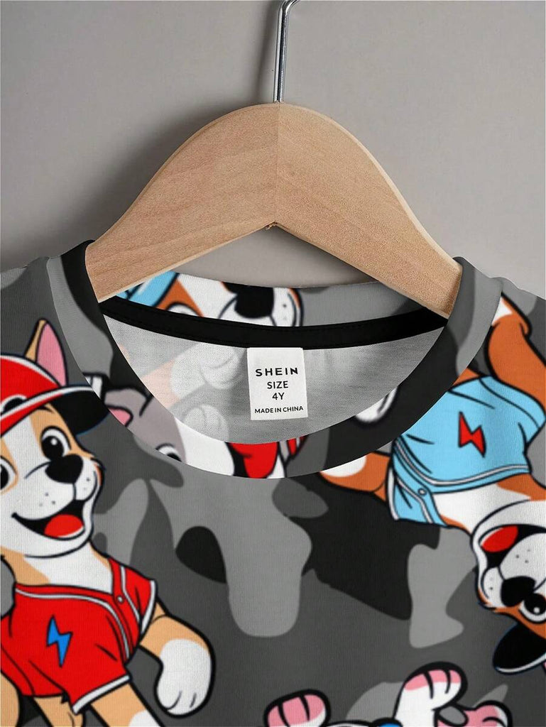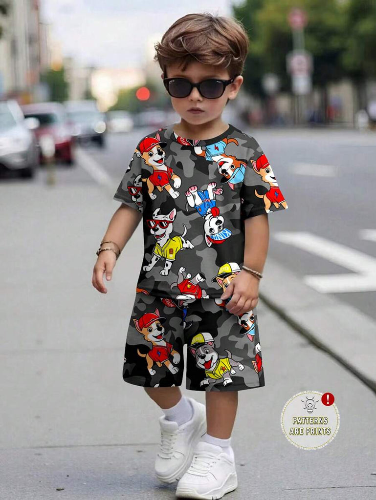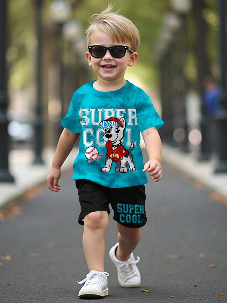 Young Boy 2pcs Casual Simple Cartoon Dog Graphic Loose Crew Neck Short Sleeve T-Shirt And Shorts Set, Suitable For Summer