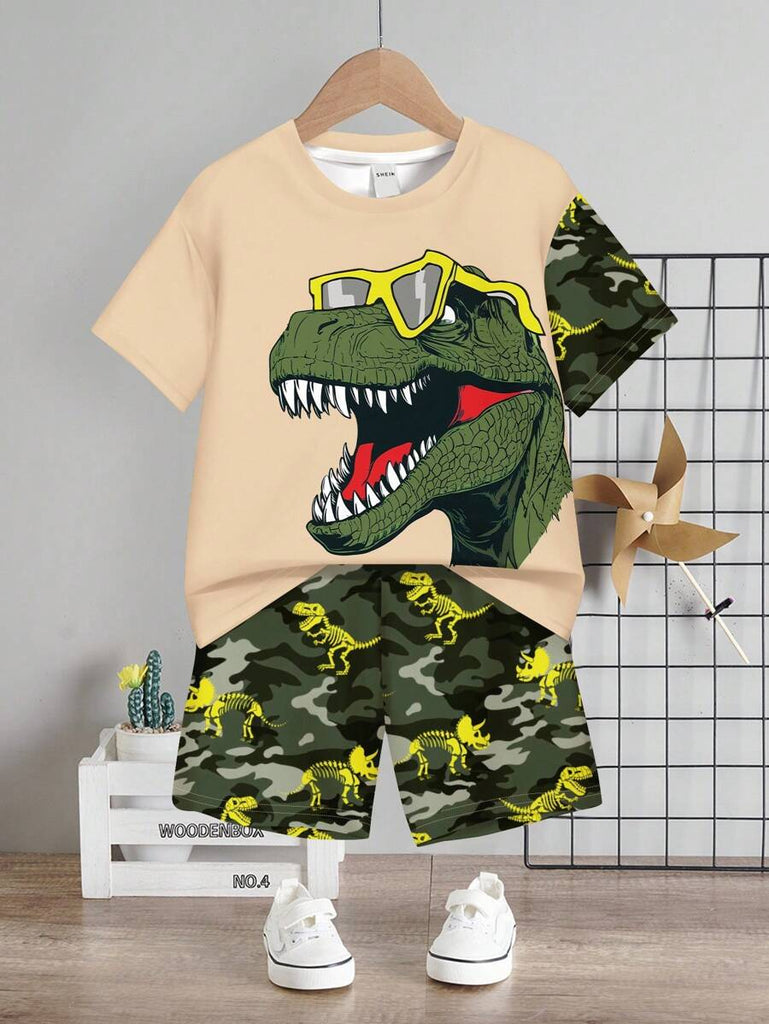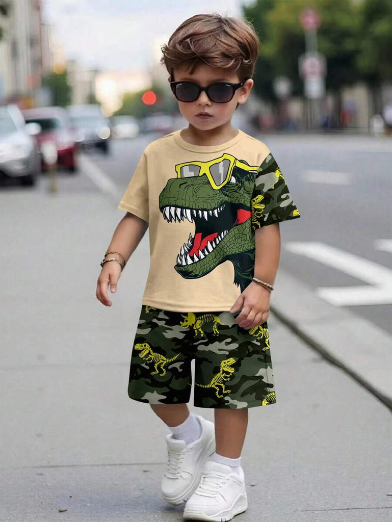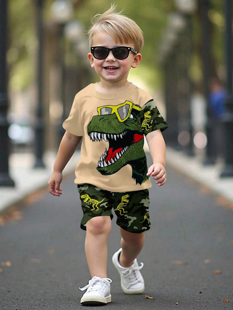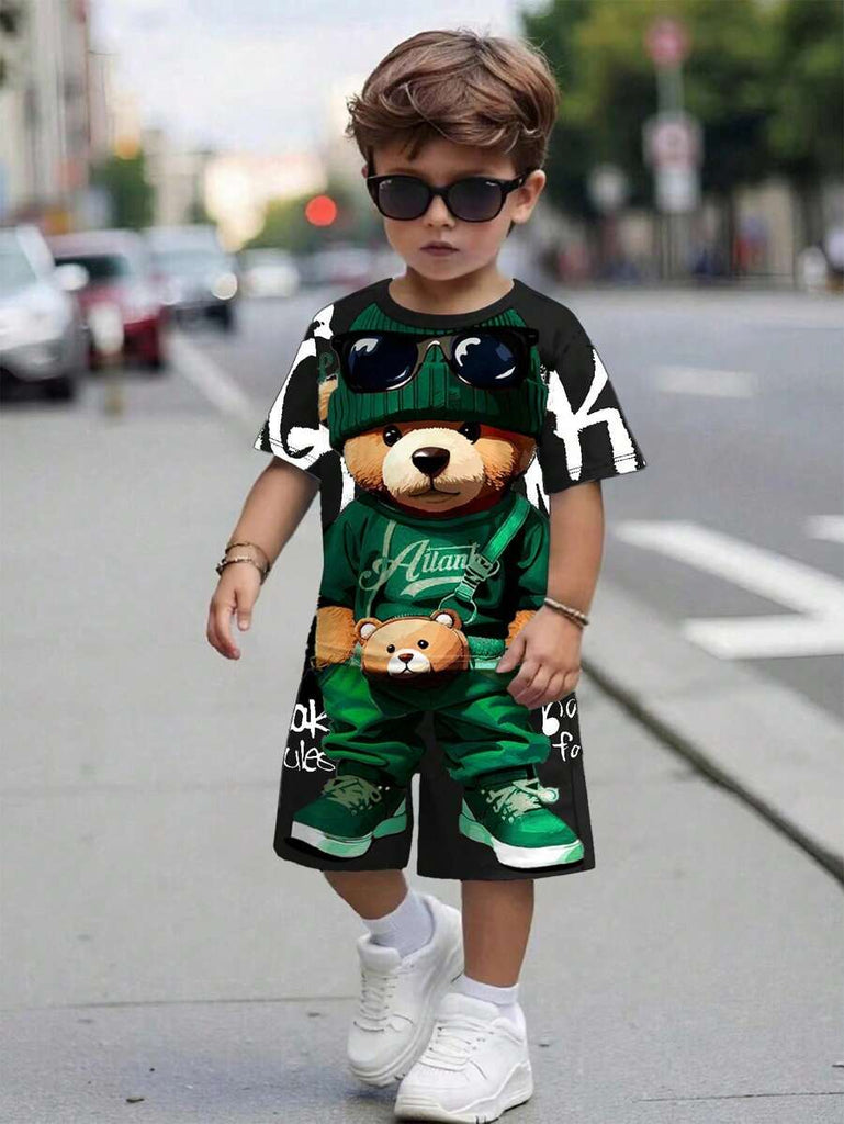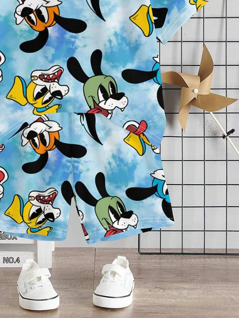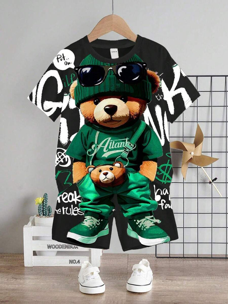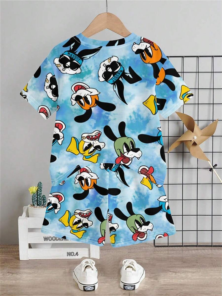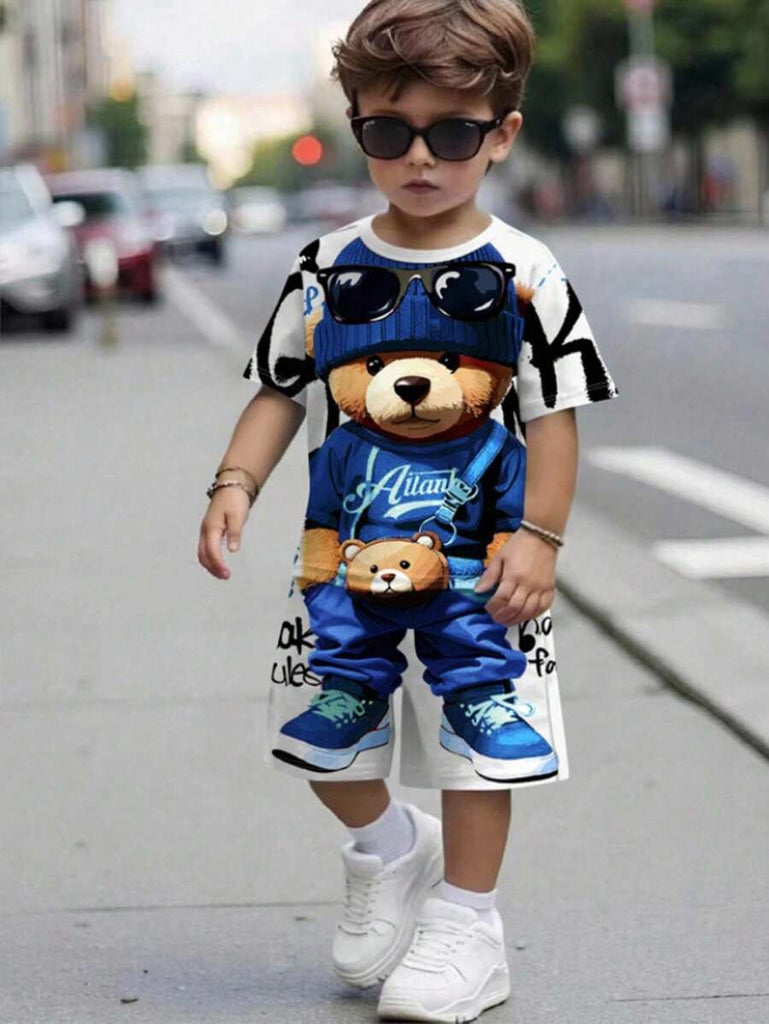 Young Boy 2pcs Casual Simple Cartoon Dog Graphic Loose Crew Neck Short Sleeve T-Shirt And Shorts Set, Suitable For Summer