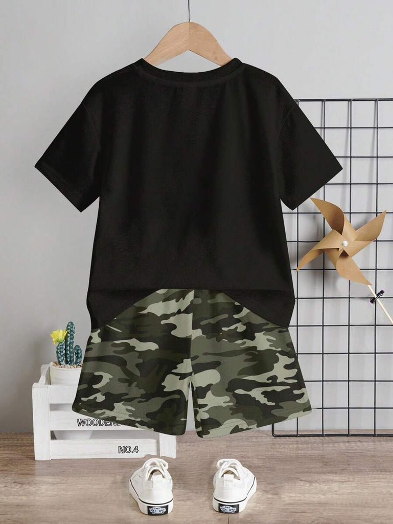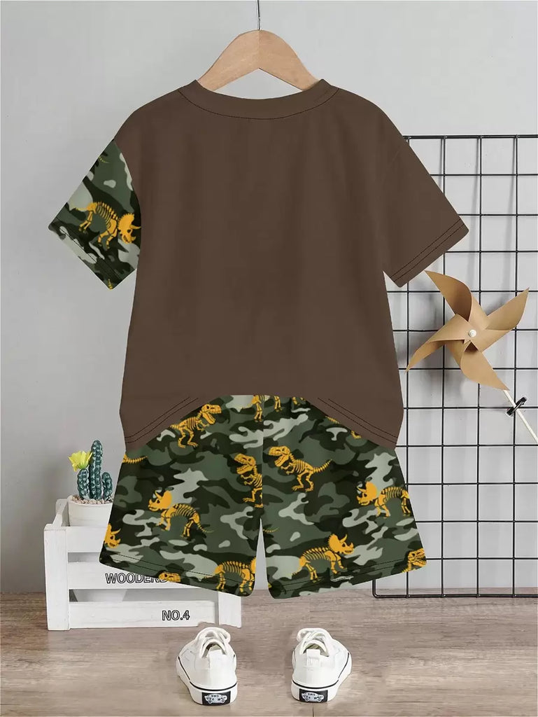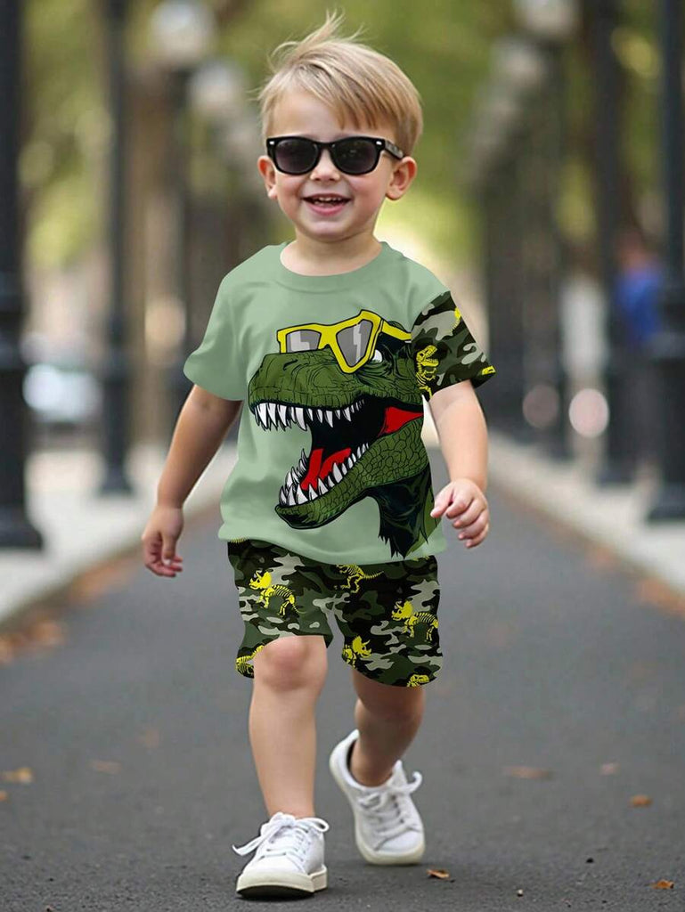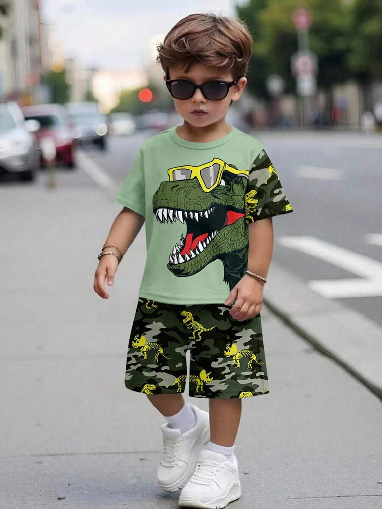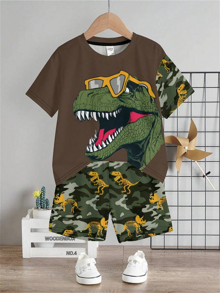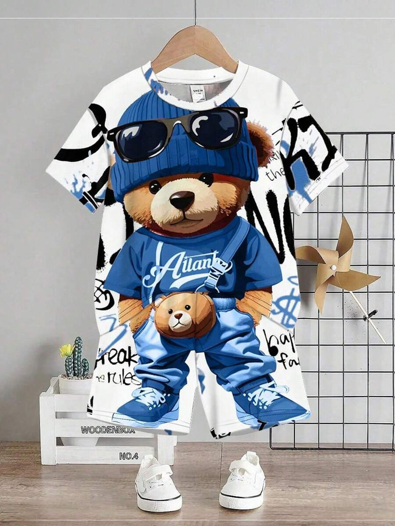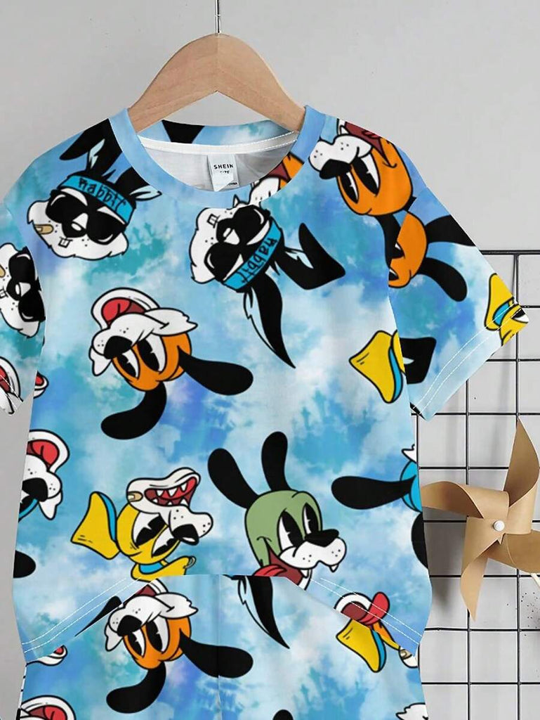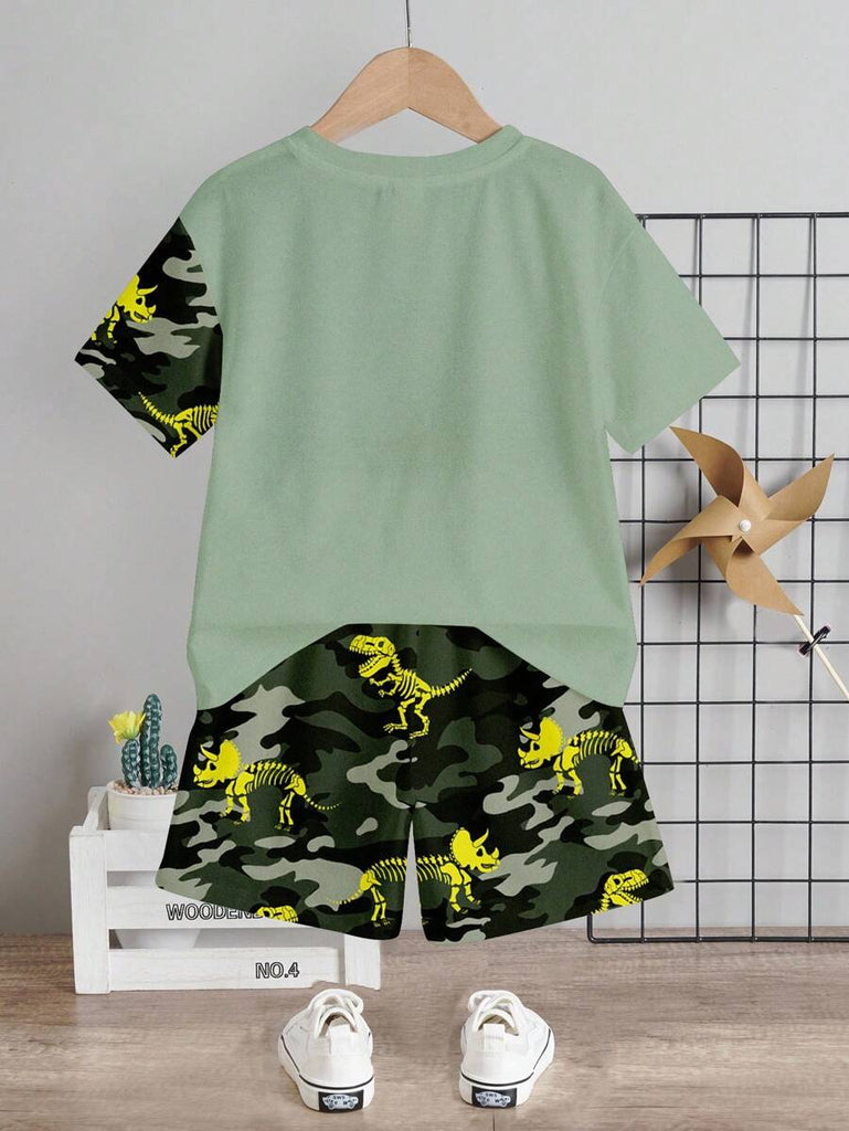 Young Boy 2pcs Casual Simple Cartoon Dog Graphic Loose Crew Neck Short Sleeve T-Shirt And Shorts Set, Suitable For Summer