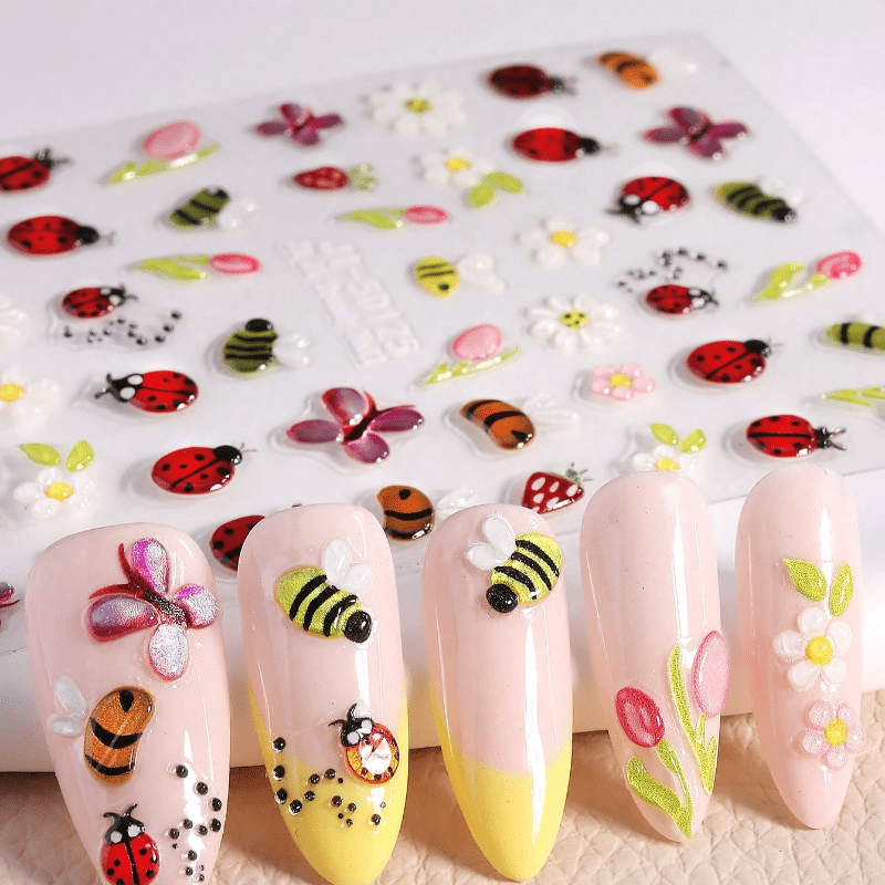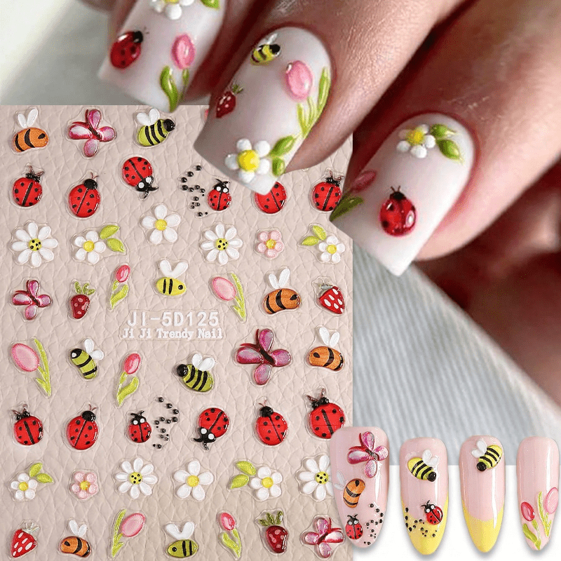 1pc Cartoon 5D Embossed Jelly Insects Flowers Fruits Nail Art Stickers