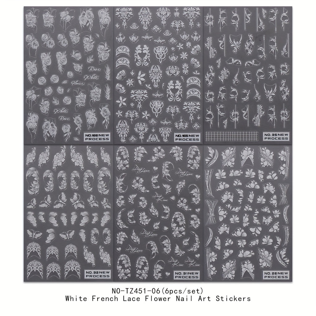 6-Pack White French Tip Lace Floral Nail Art Stickers, Plastic Self-Adhesive Decorative Tools, Glossy Finish, Love Theme, Embroidered Embellishment, Irregular Shape, Single Use, Unscented Nail Embellishments for Women and Girls, Ideal for Holiday Gifts