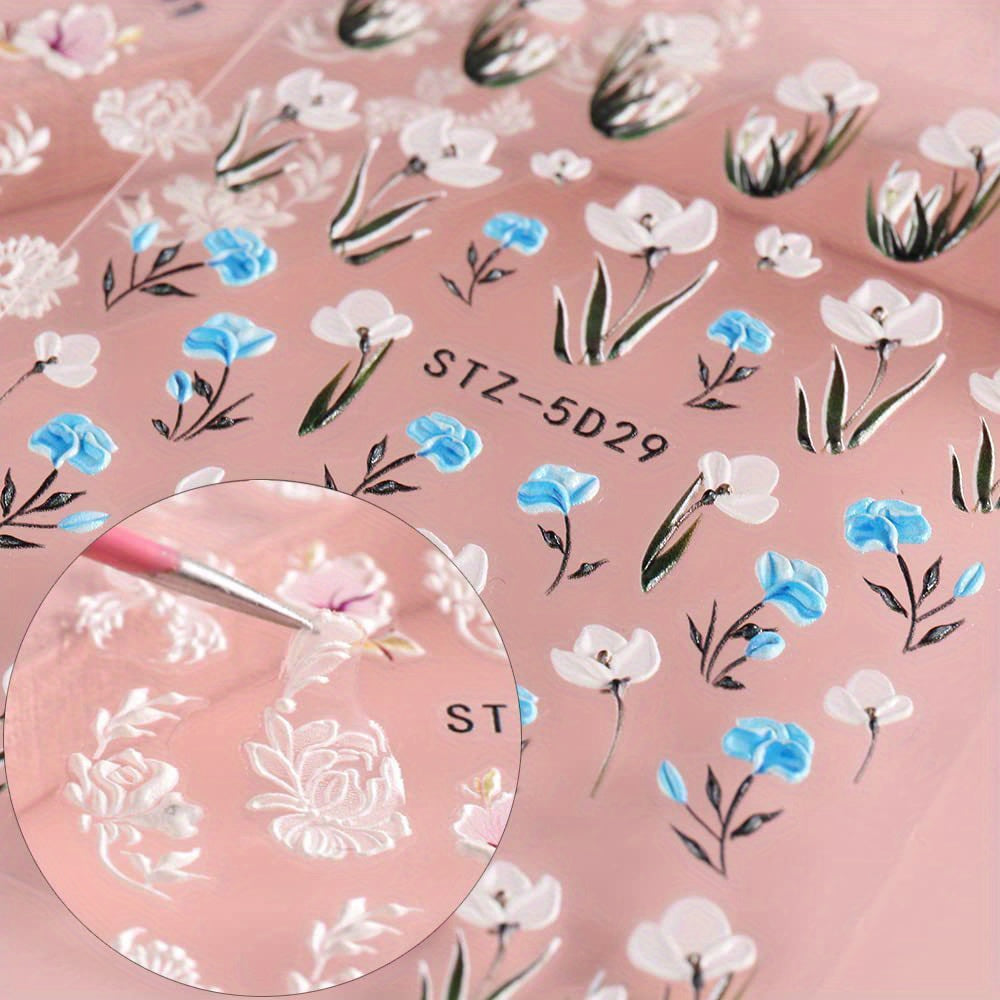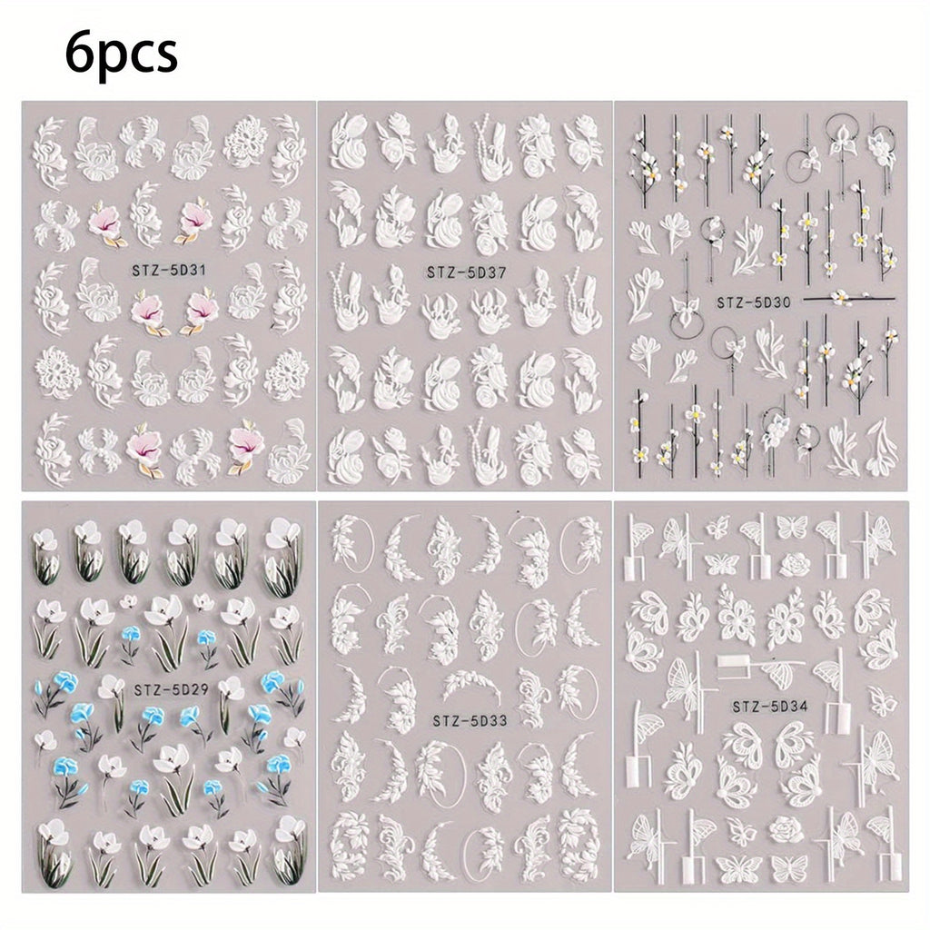 6 Sheets/set, 5D Embossed Camellia Nail Art Stickers, Self Adhesive Flower Butterfly Nail Art Decals Set For Nail Art Decoration, Nail Art Supplies Easter