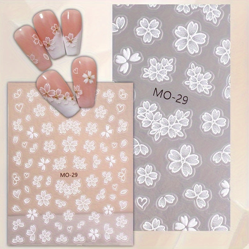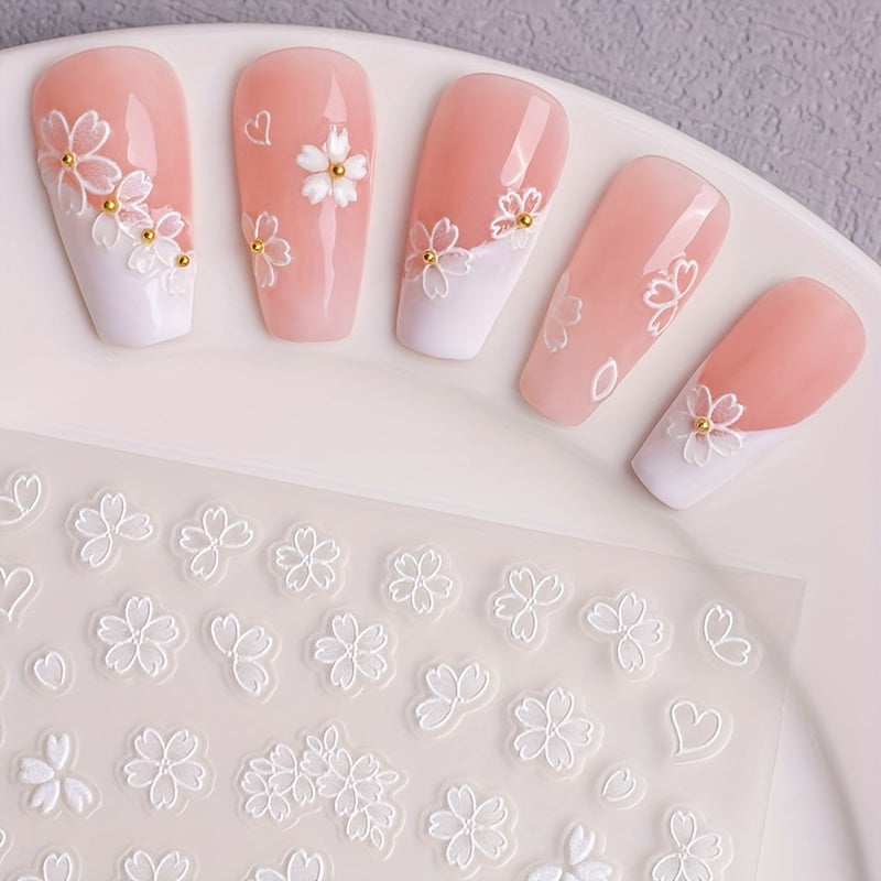 New 6D New Trend Embossed Hollow Cherry Blossom White Flower Nail Stickers Nail Art Decoration Decals