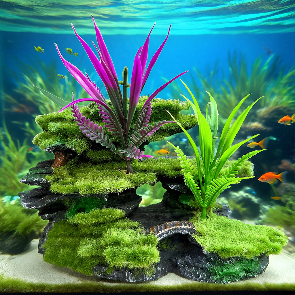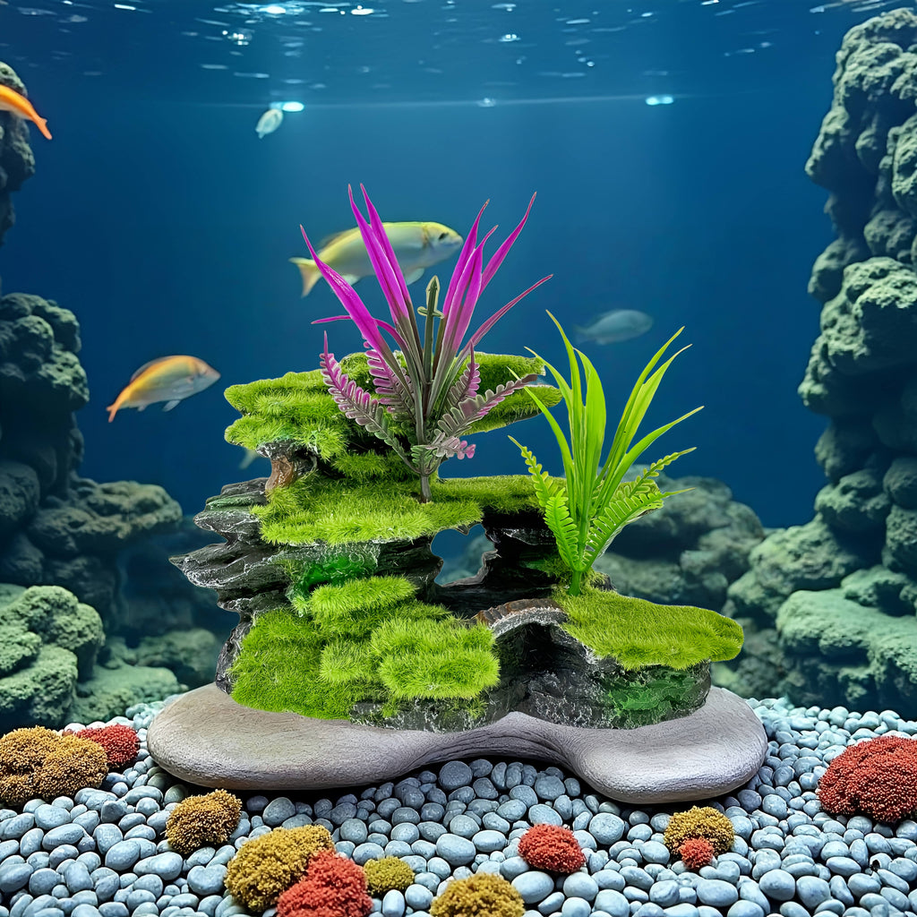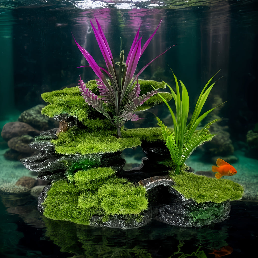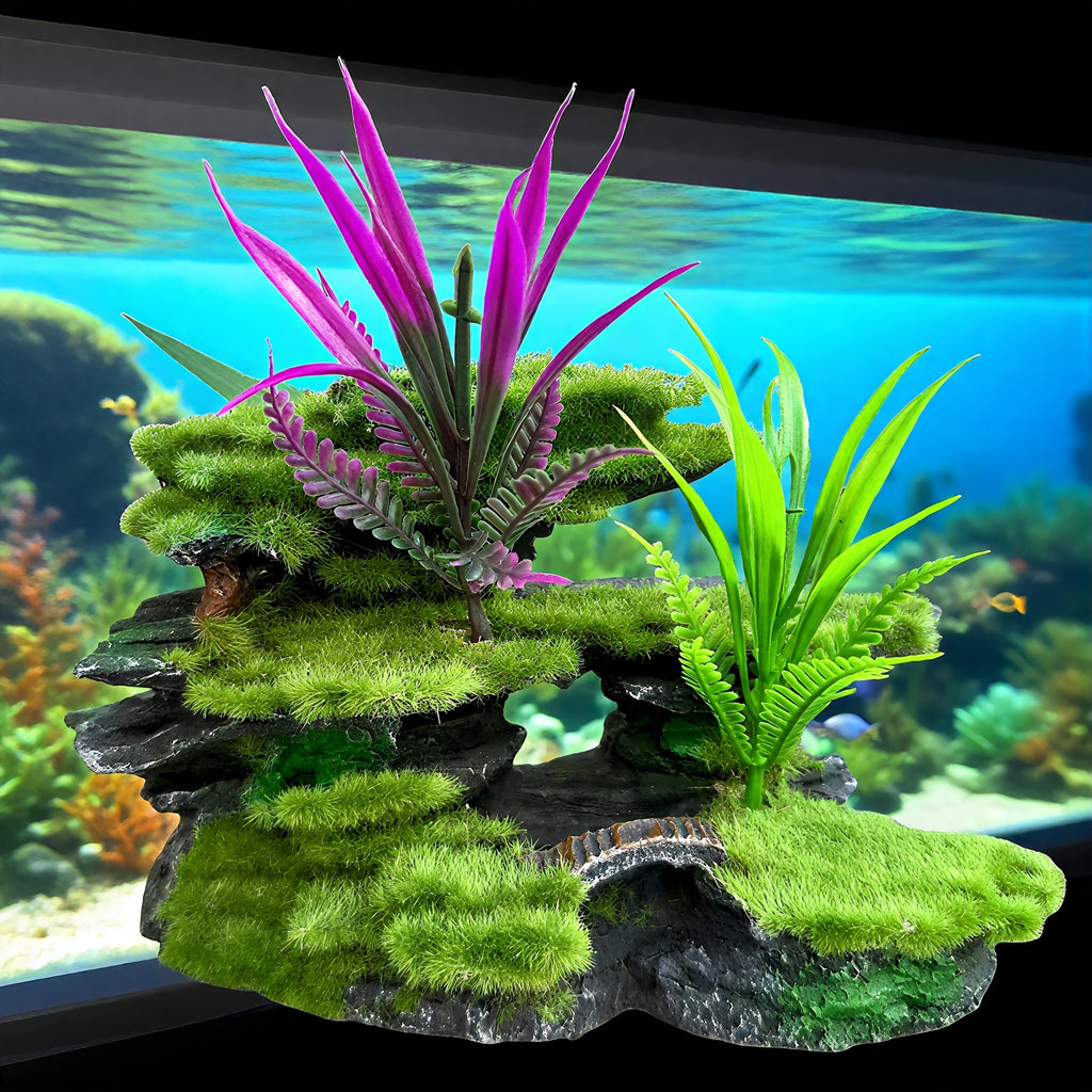 1pc New Aquatic Moss Rock Aquarium Decoration - Durable ABS Resin Artificial Rock with Faux Moss and Purple Water Plants, Enhanced Underwater Landscape for Fish & Shrimp Hiding Spots, Natural Habitat | Suitable for Aquariums, Turtle Habitats & Water Feat