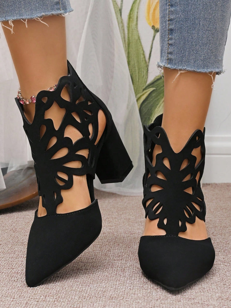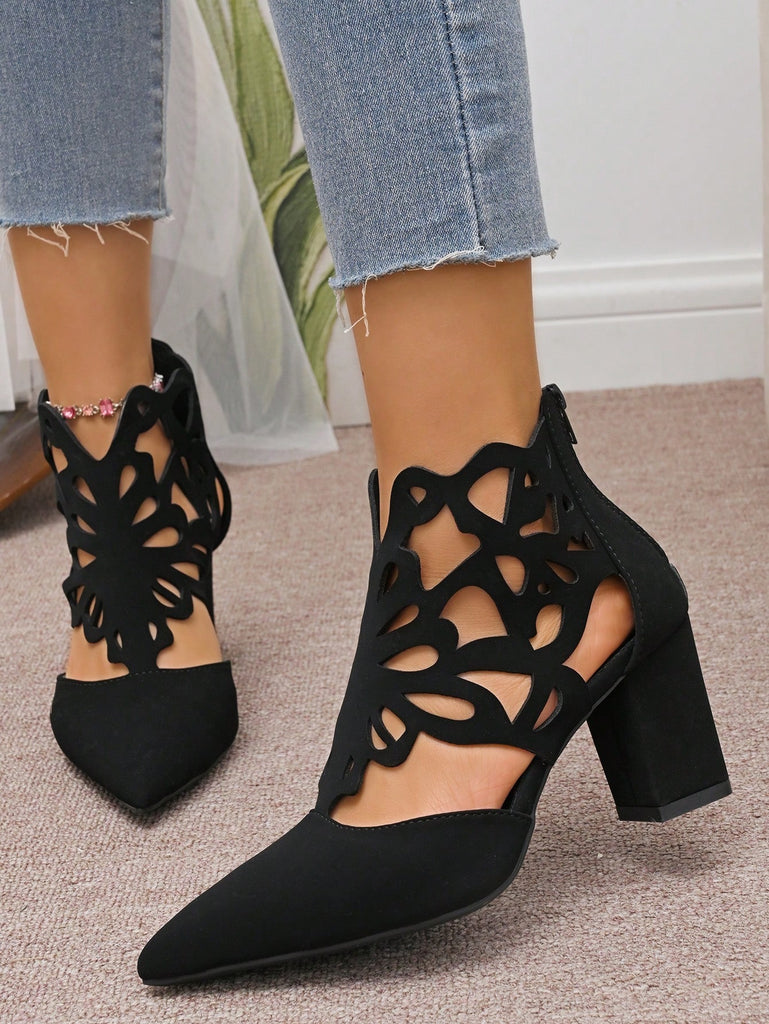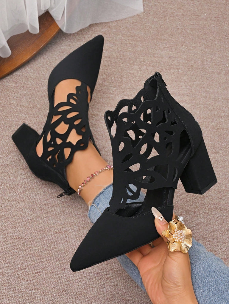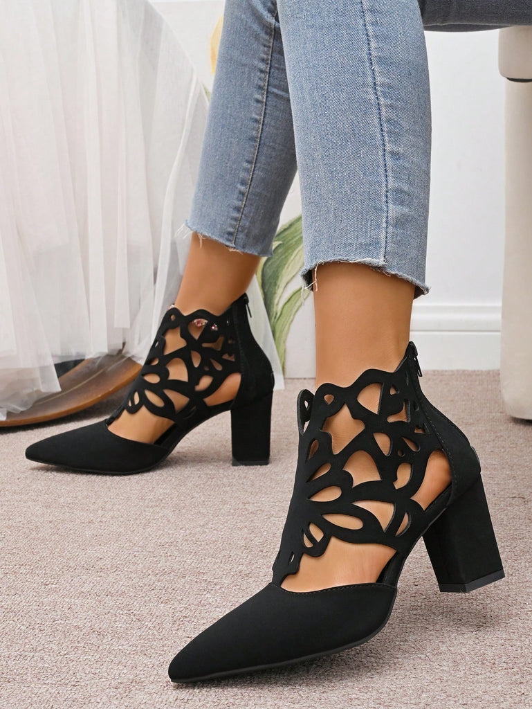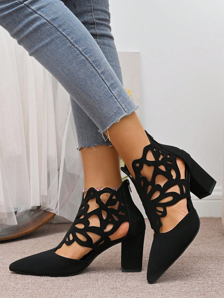 Black Hollow Peep Toe High Heeled Sandals, Women's 2025 Summer New Mesh Boots, Pointed Toe Lace-Up Zipper Thick Heel Roman Short Boots, Fashion Versatile Lady Boots