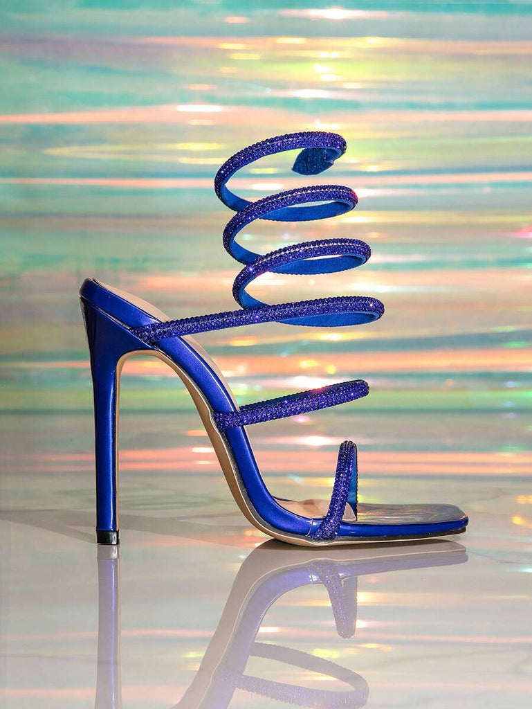 European & American Fashion Sexy Super High Heel Women Sandals With Crystal Snake Twined Decor, Square Toe High Heel Party Dress Sandals, Silver