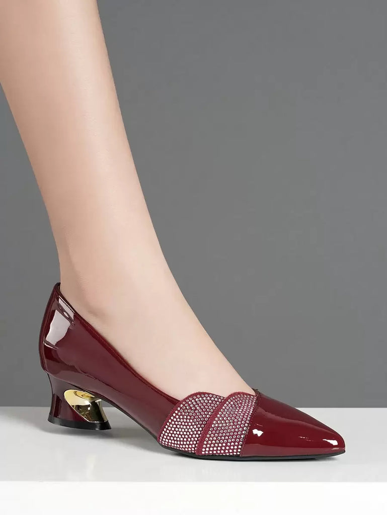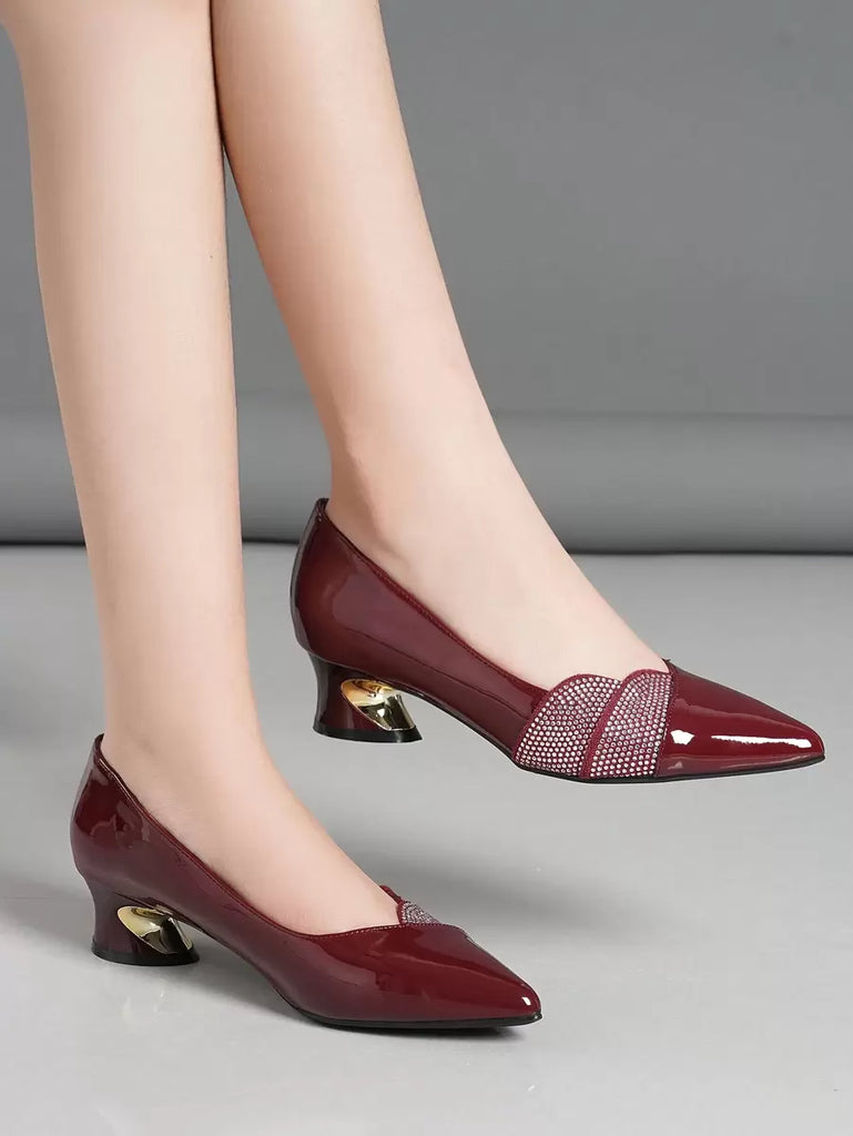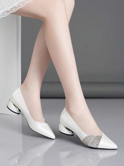 New Autumn/Spring Comfortable & Fashionable Rhinestone High Heels, Black White Silver Brown Work Shoes, Pointed Toe Chunky Heel Slip-On Pumps, Versatile Women Shoes