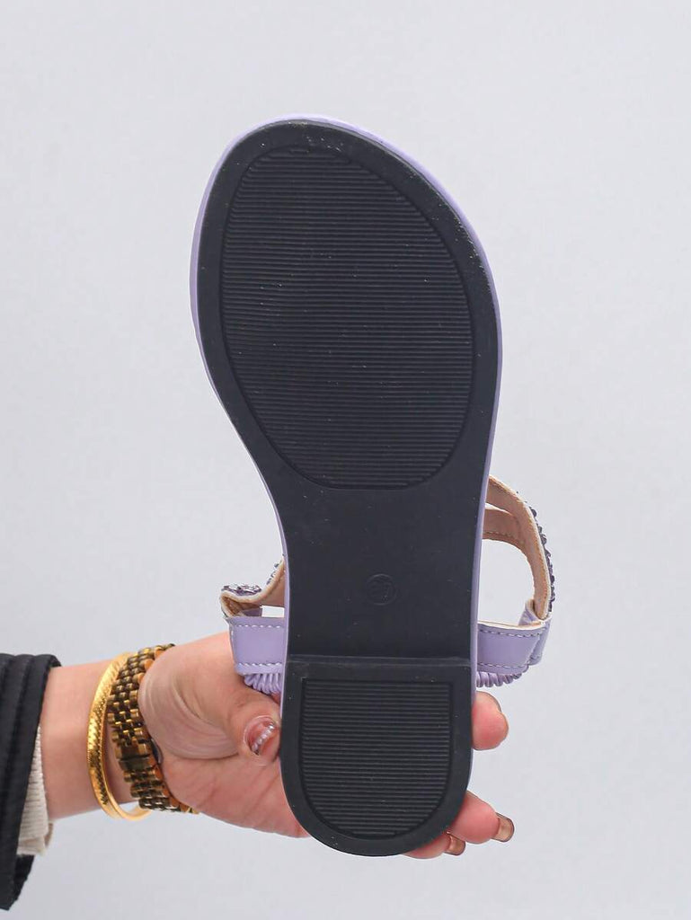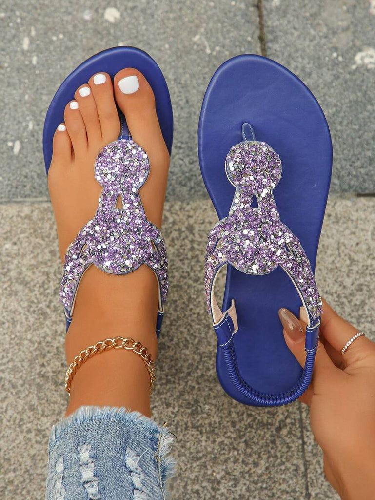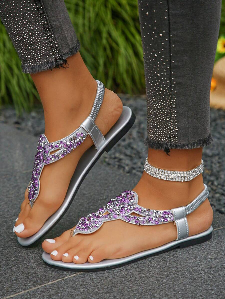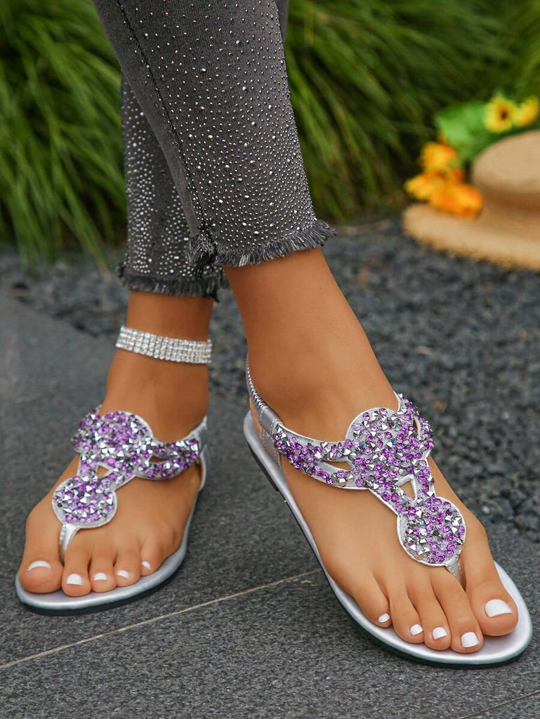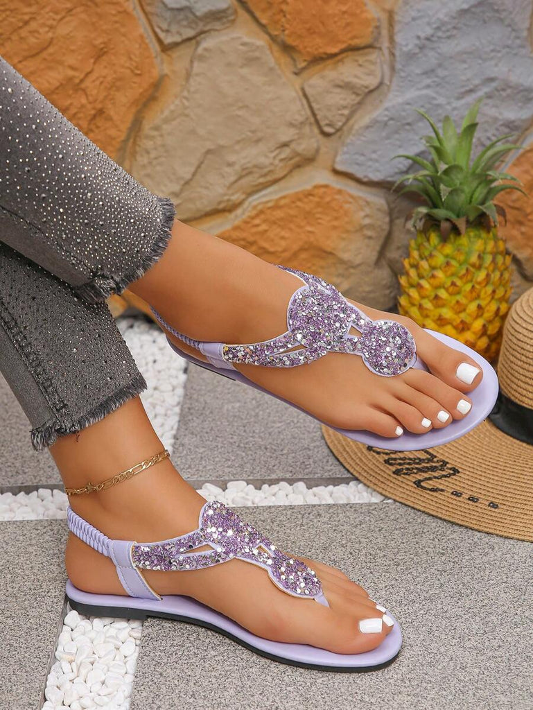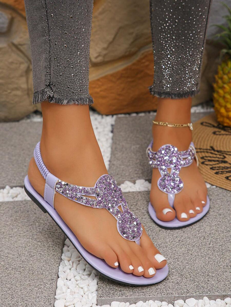 Plus Size 35-45 Fashionable Round Toe Women Flat Sandals, Summer Outdoor Open Toe Purple Rhinestone Thong Lightweight Ladies Sandals