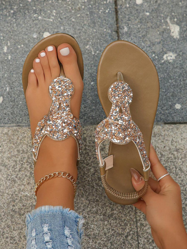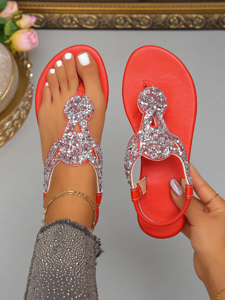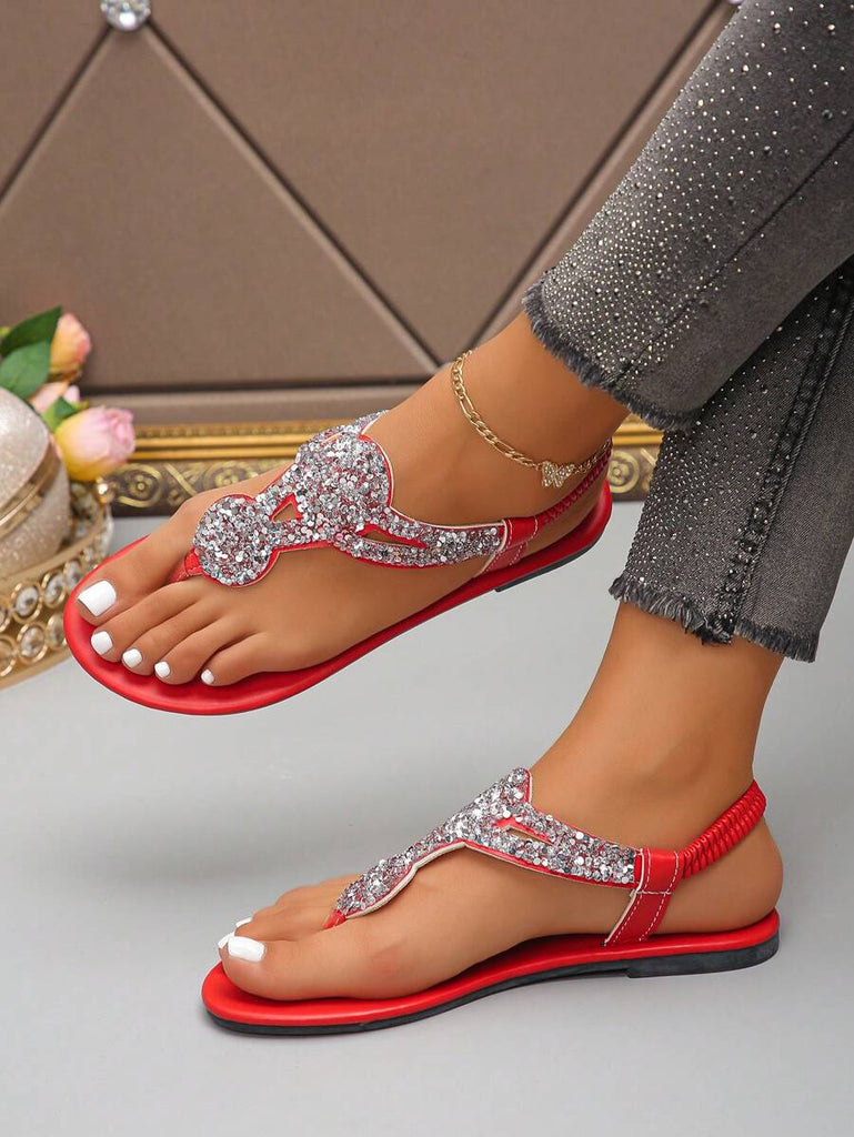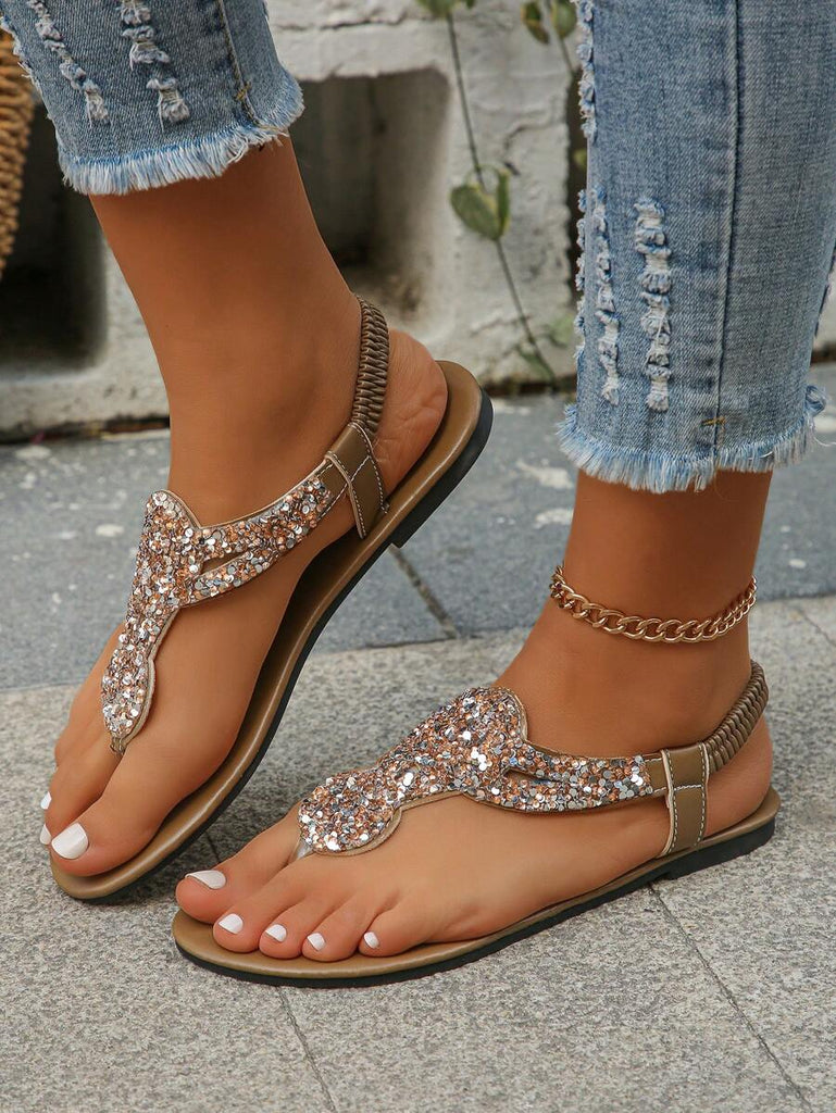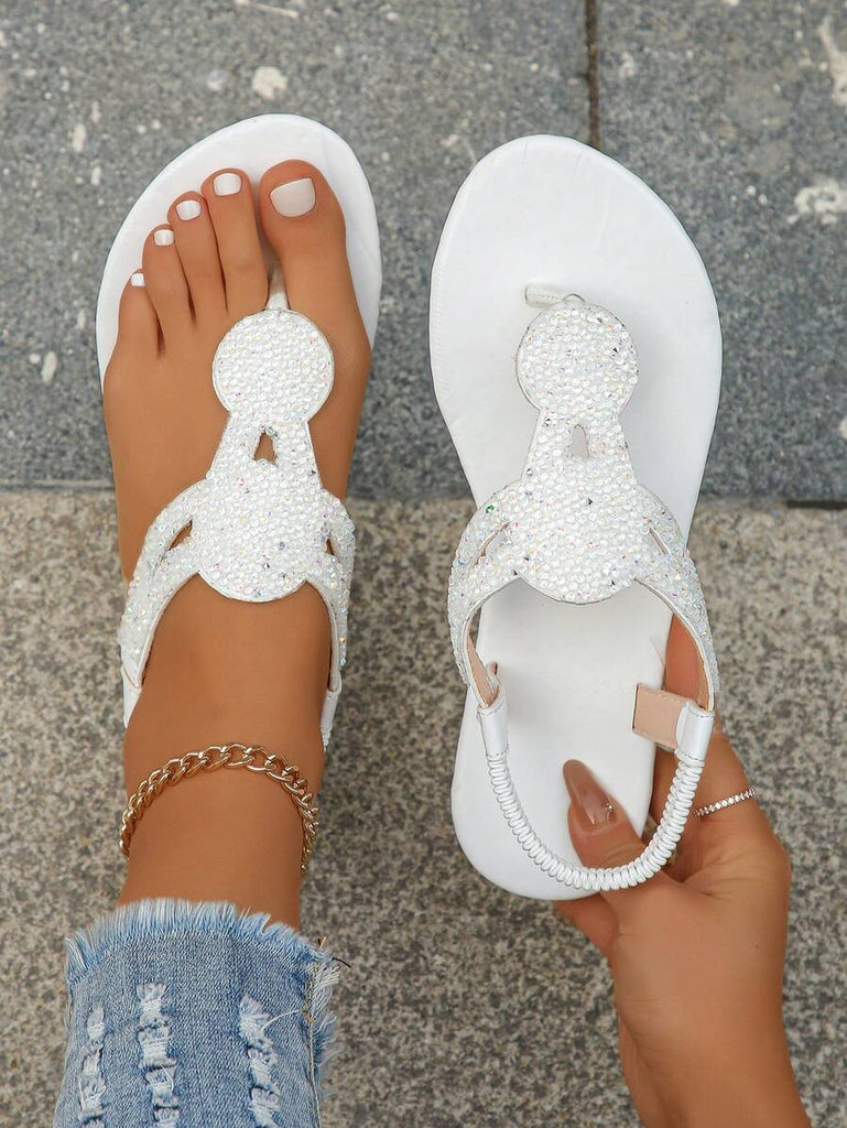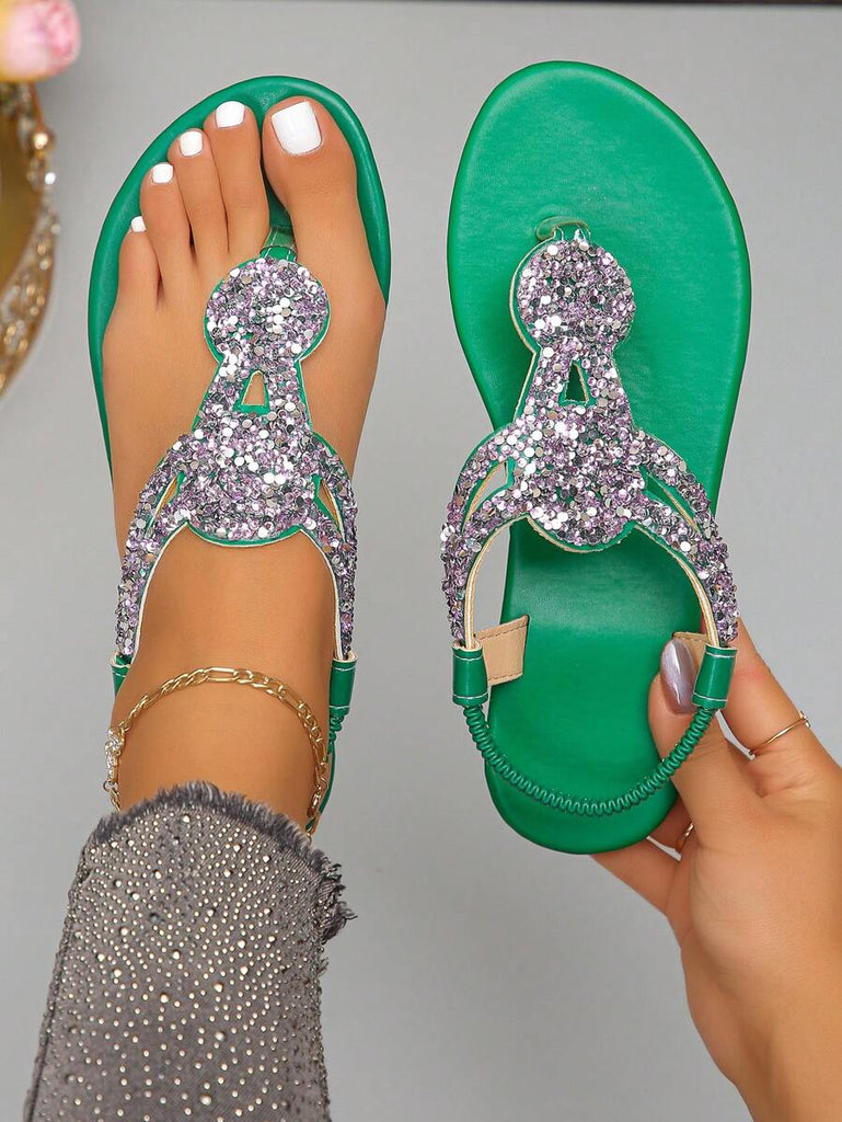 Plus Size 35-45 Fashionable Round Toe Women Flat Sandals, Summer Outdoor Open Toe Purple Rhinestone Thong Lightweight Ladies Sandals